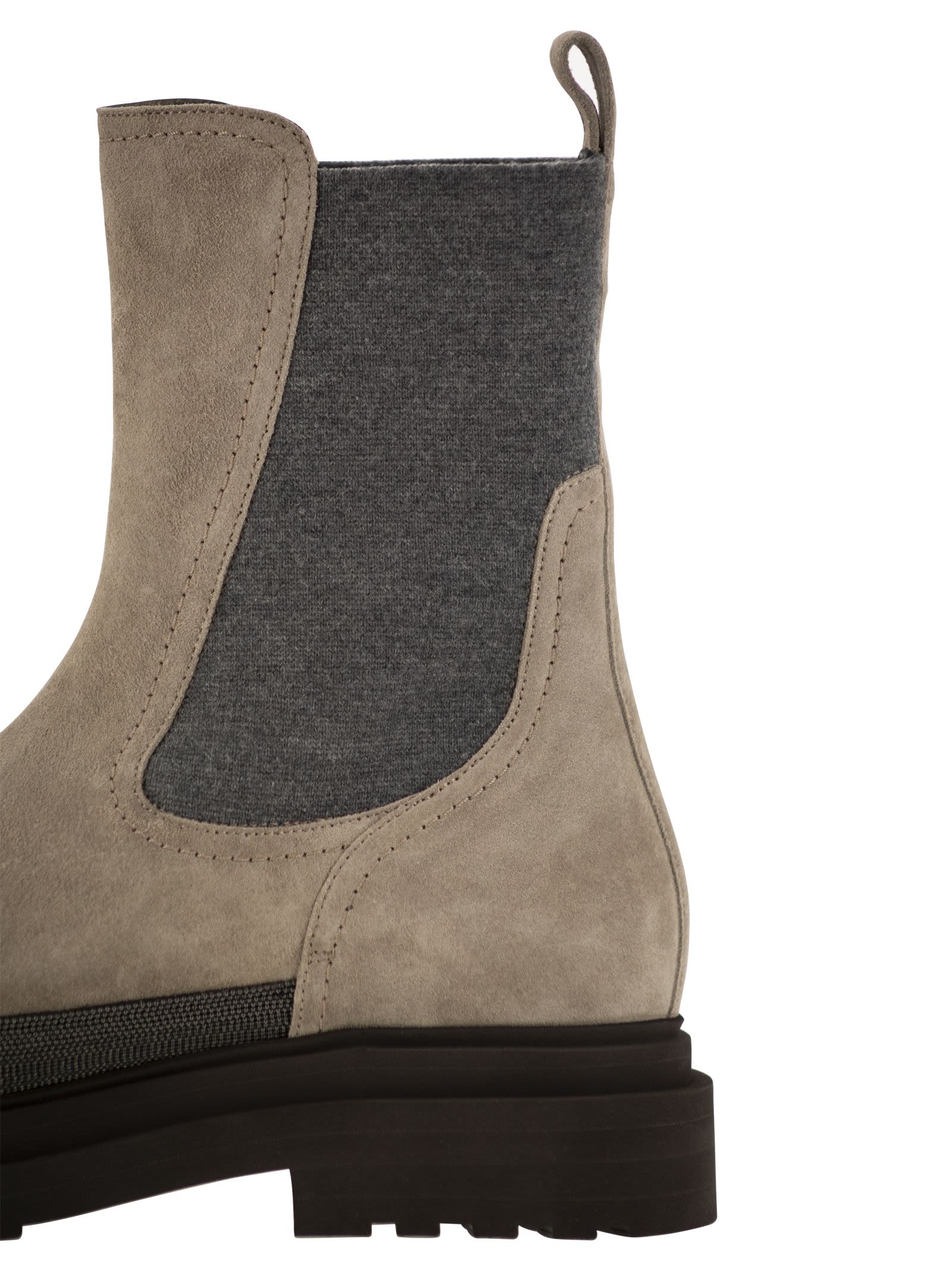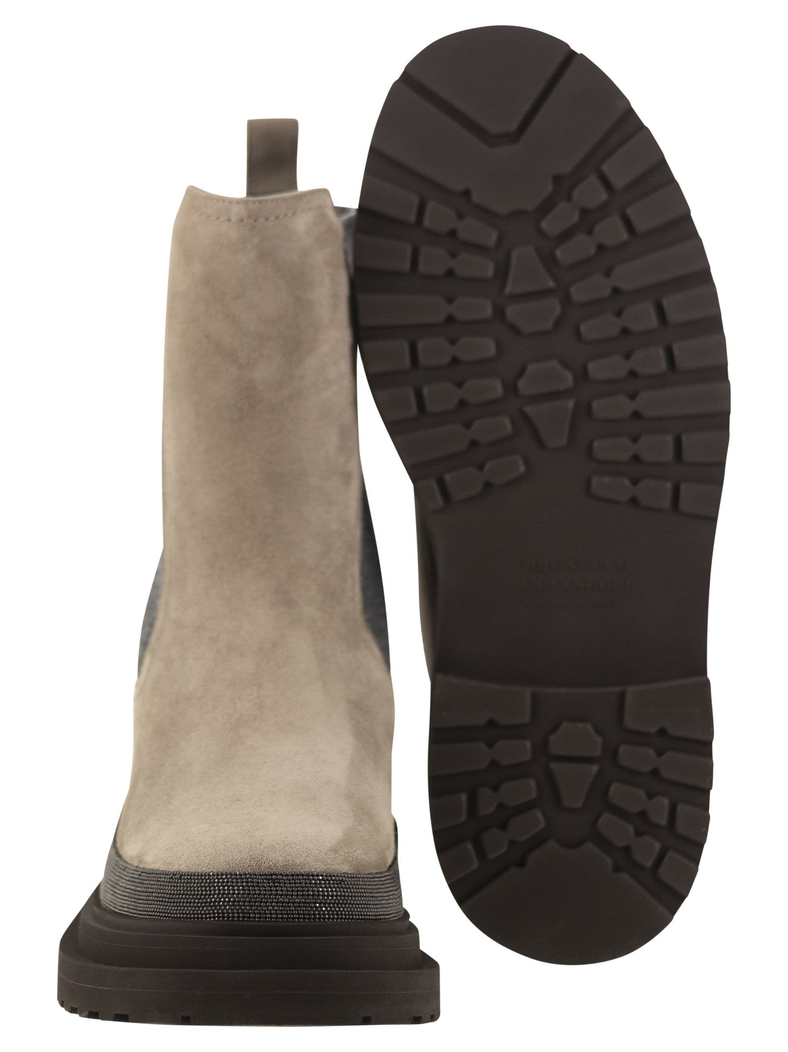 The classic Chelsea boot style is enriched with bright, feminine details in pure Brunello Cucinelli style. The silhouette is finished by a shiny insert composed of rows of precious jewels. The high sole and micro tread complete the comfort of the boots. - Suede leather upper - Elastic on the sides - Monile stripe DESIGNER ID: MZSFG2745P C5859