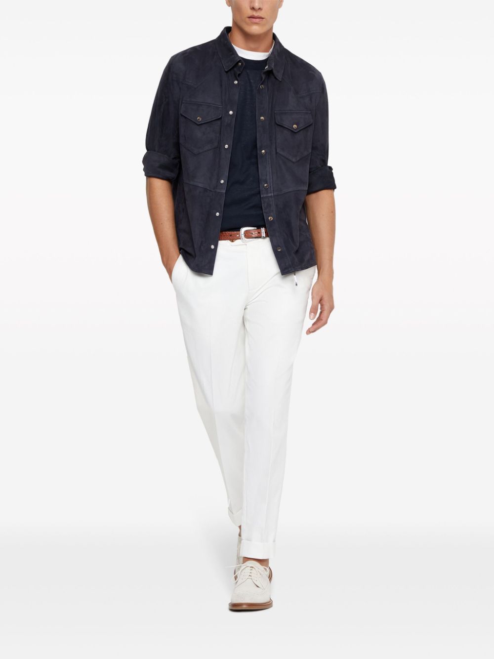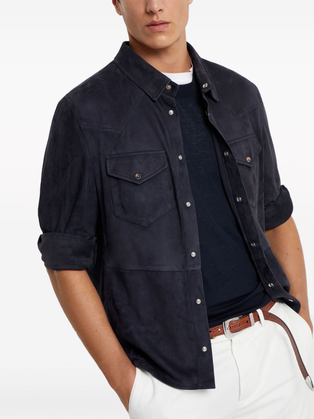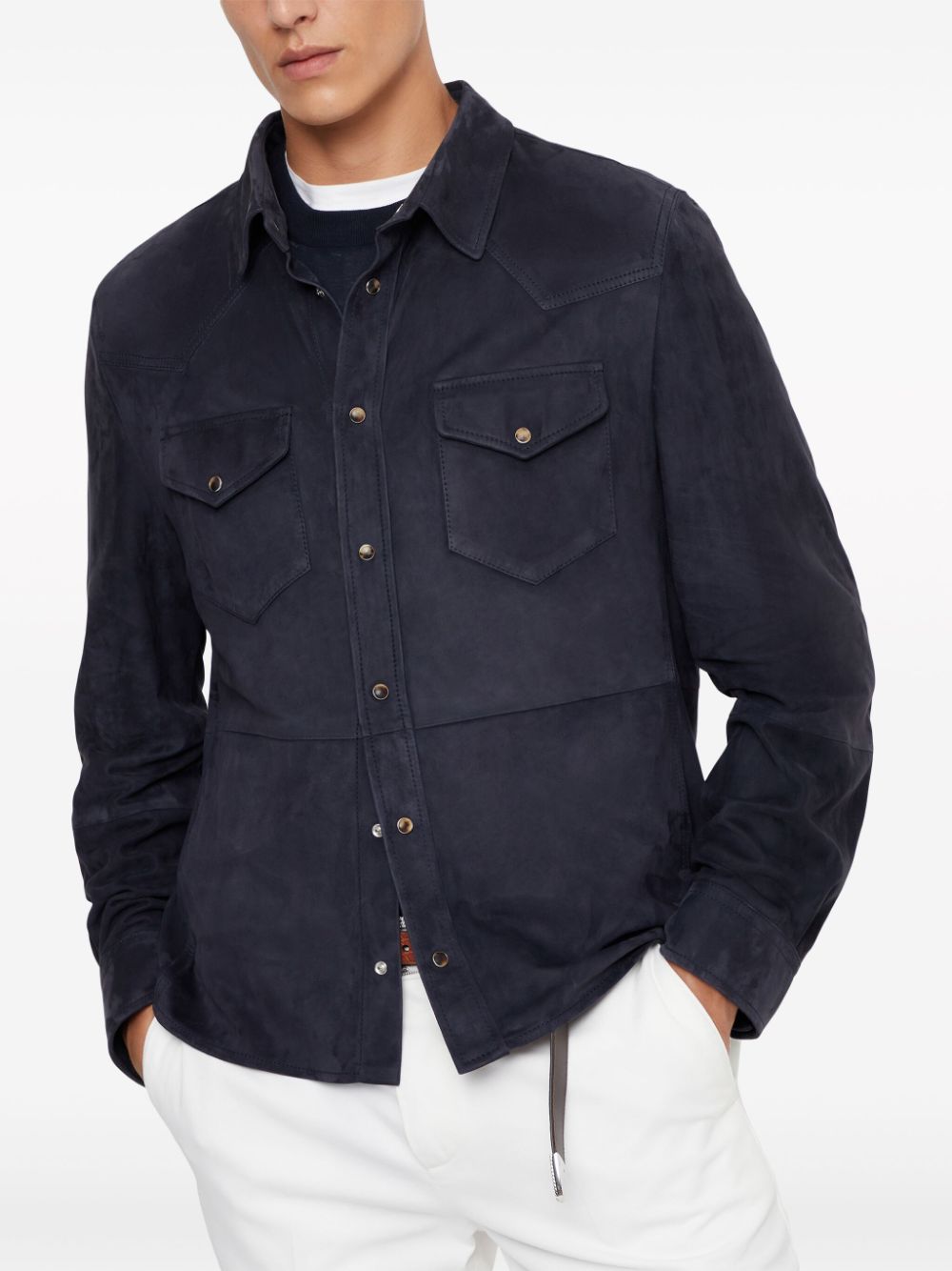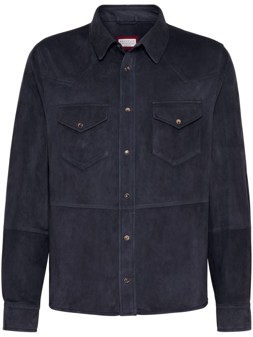 navy blue leather spread collar front button fastening long sleeves buttoned cuffs two chest flap pockets straight hem