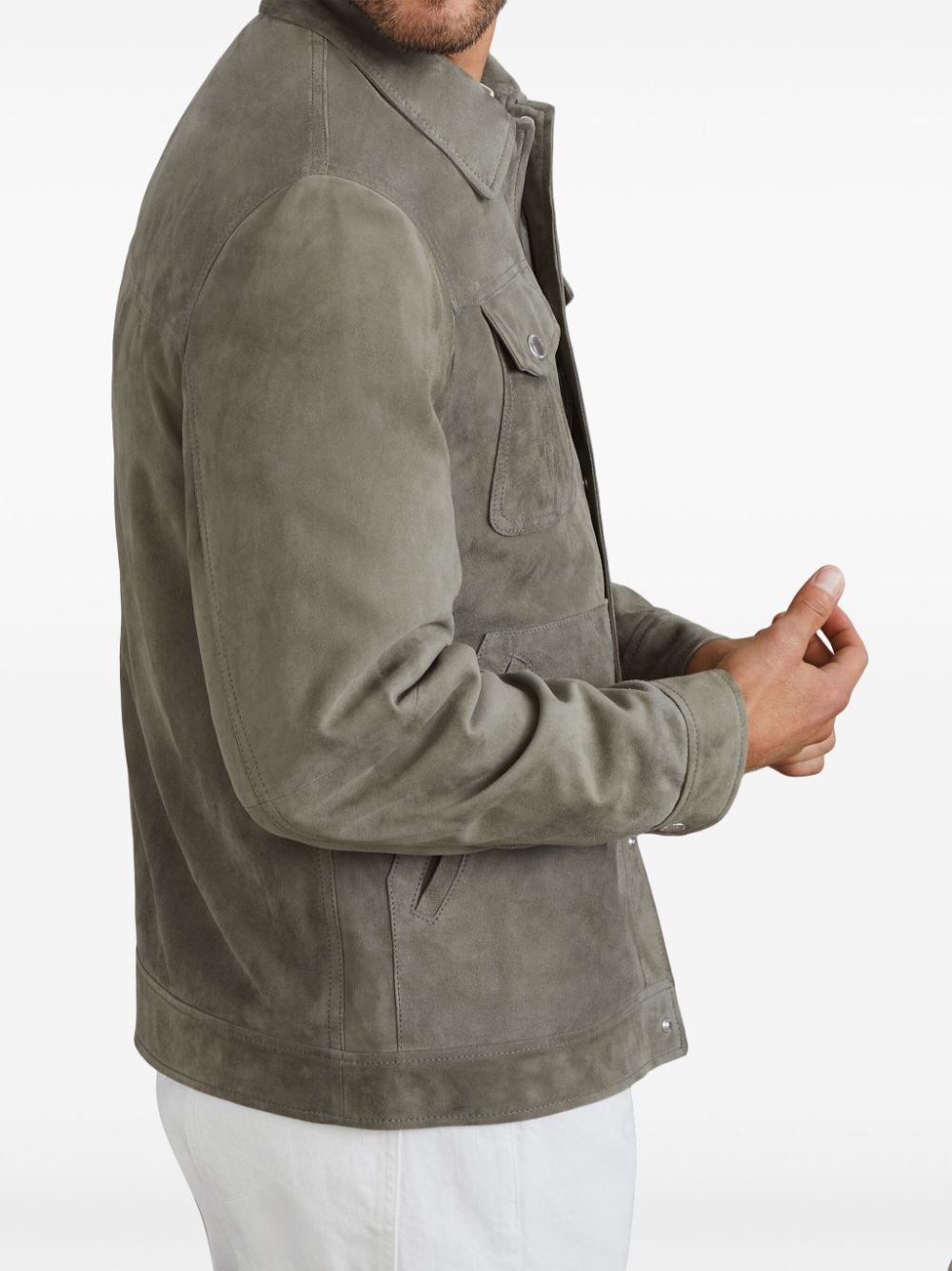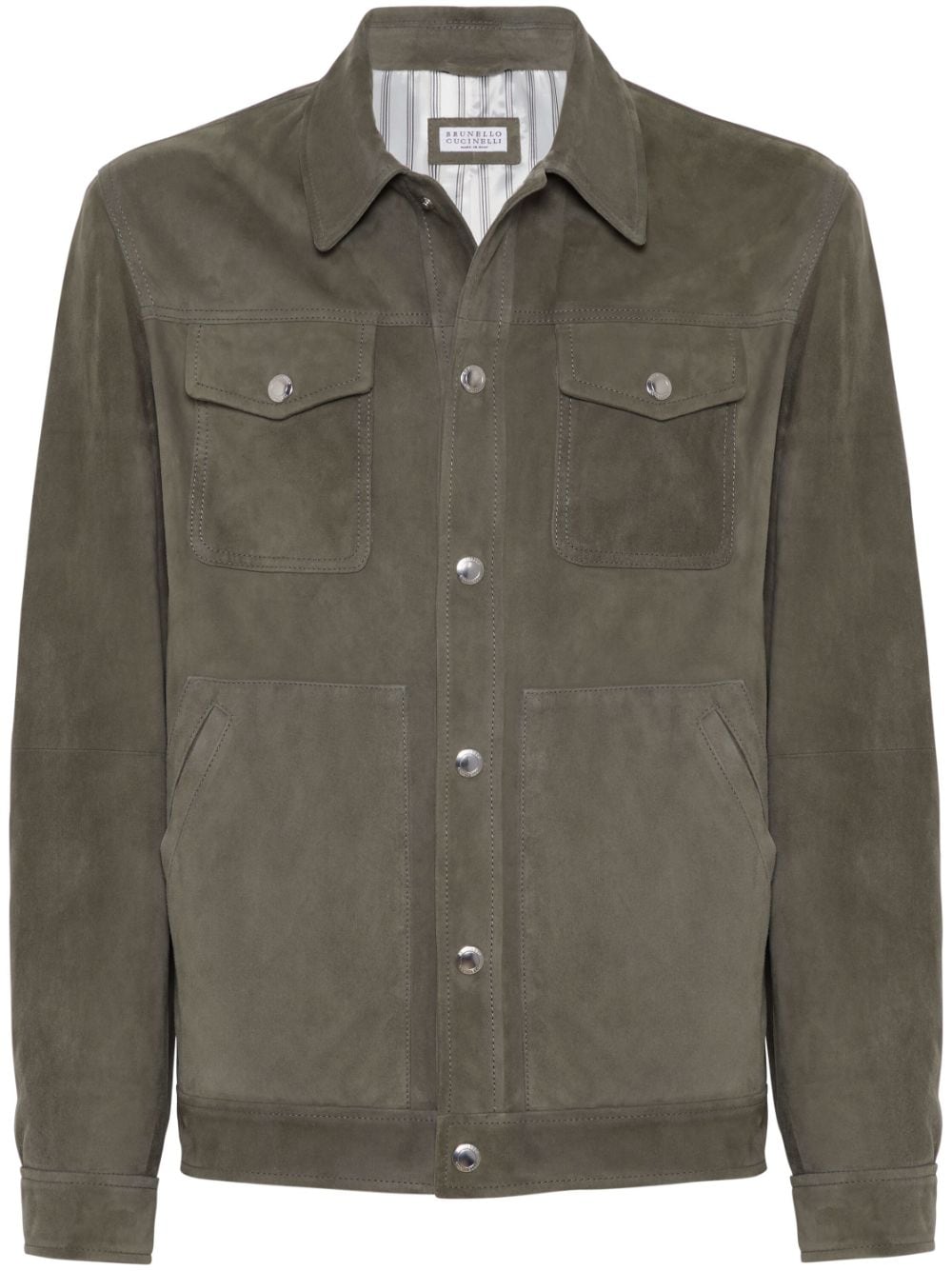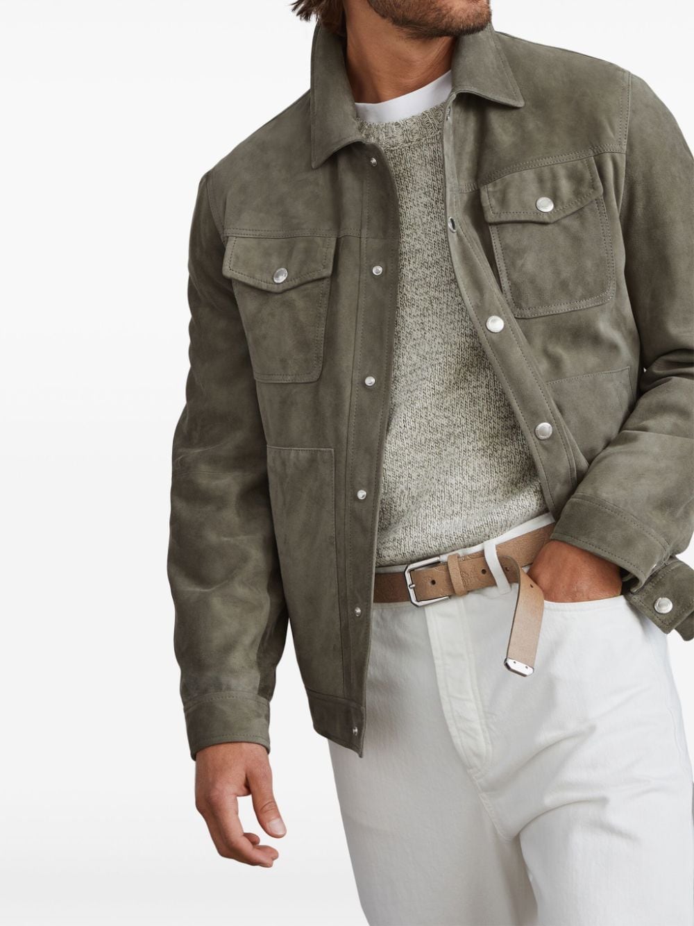 dark green leather stud detail spread collar front press-stud fastening long sleeves press-stud fastening cuffs two chest flap pockets slip pockets to the sides straight hem