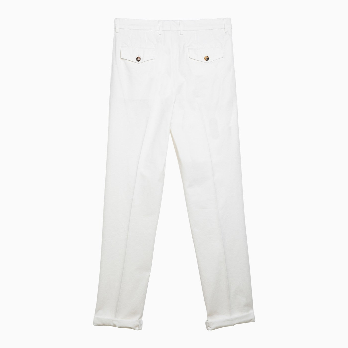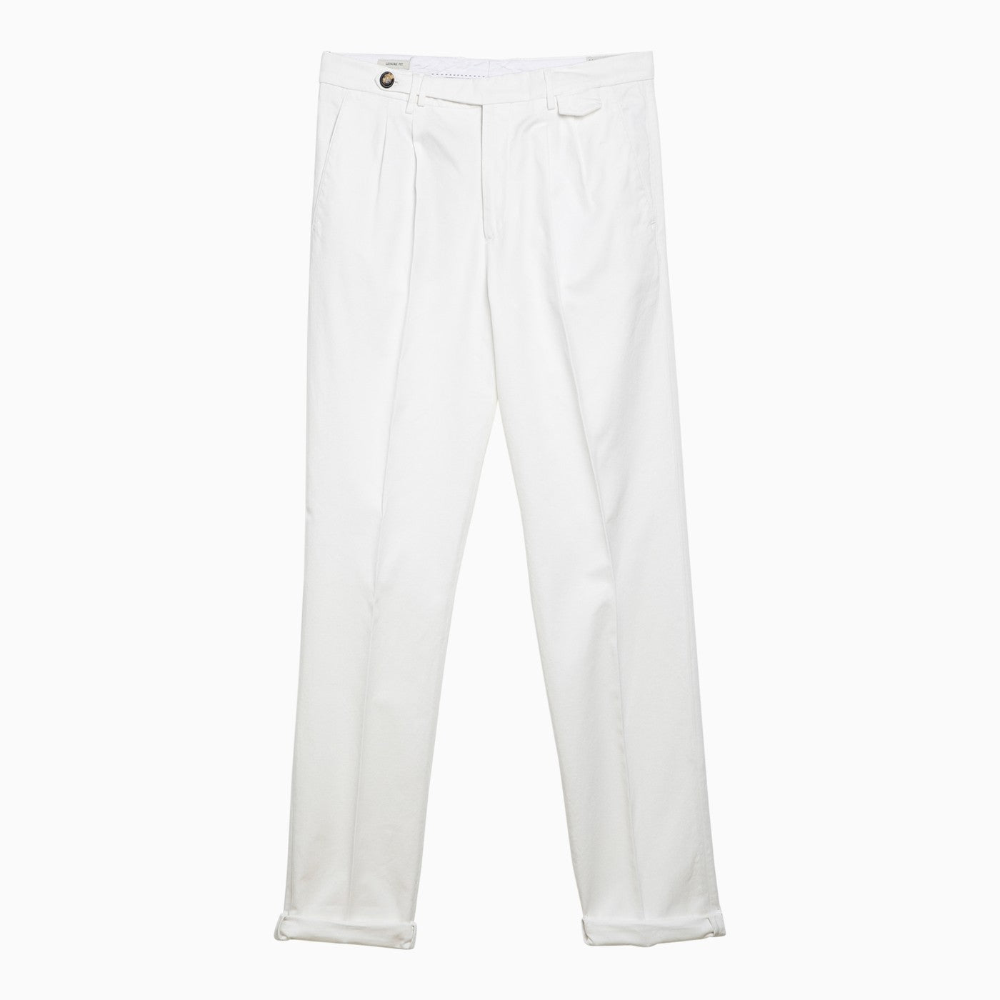 White cotton trousers from Brunello Cucinelli featuring a zip and button fly, belt loops, front pleats, side pockets, back flap and button pockets and a turned-up hem.