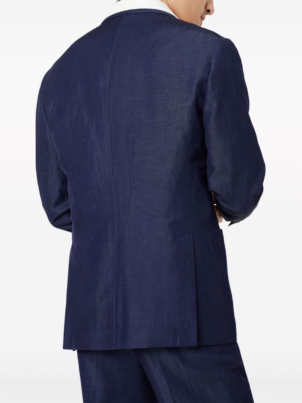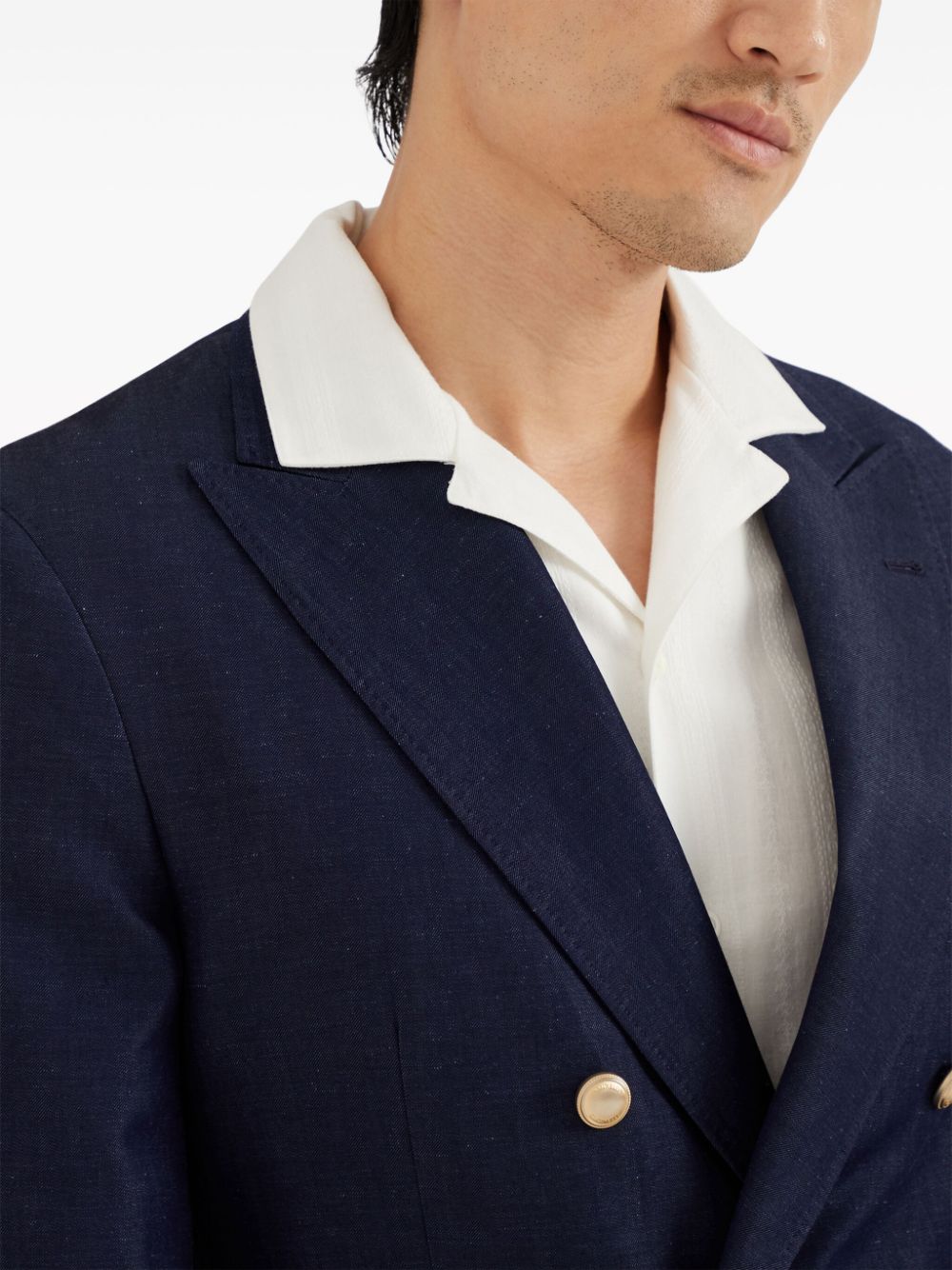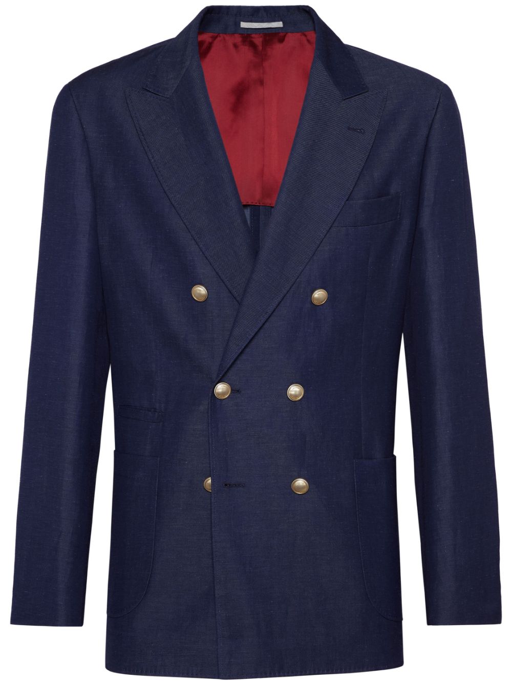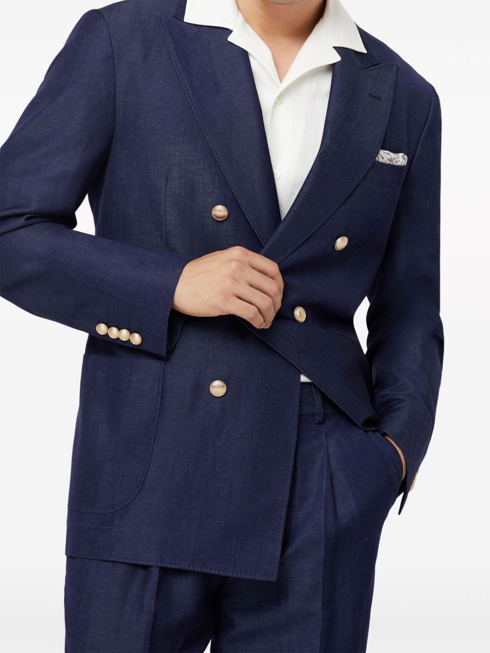 navy blue linen-wool blend peak lapels double-breasted button fastening long sleeves chest welt pocket front flap pockets straight hem
