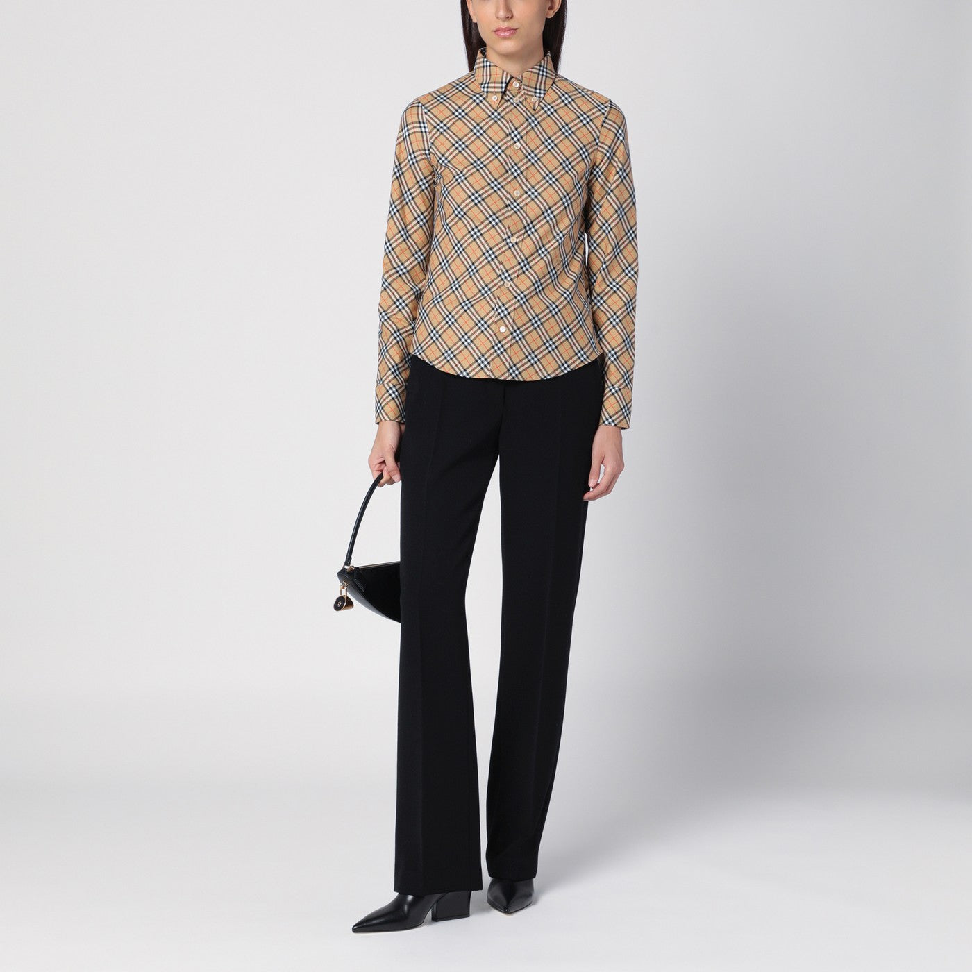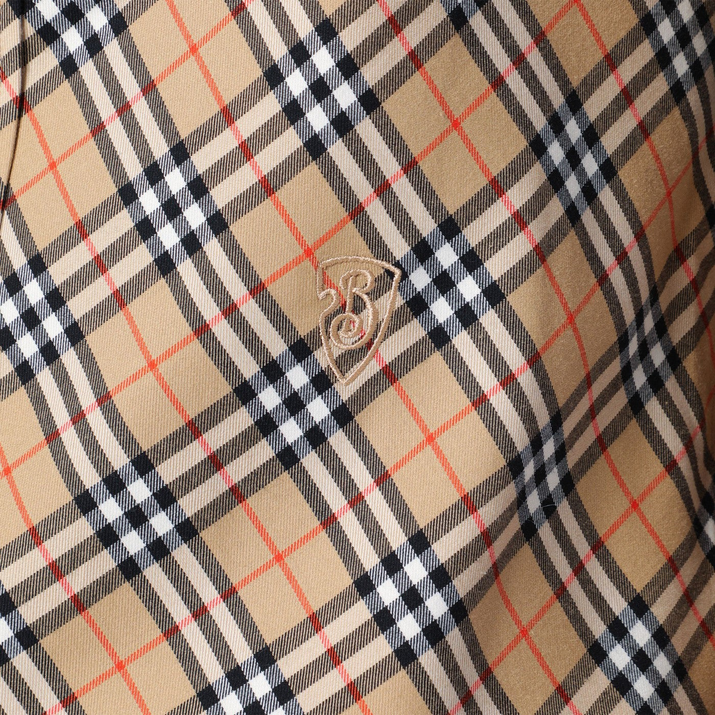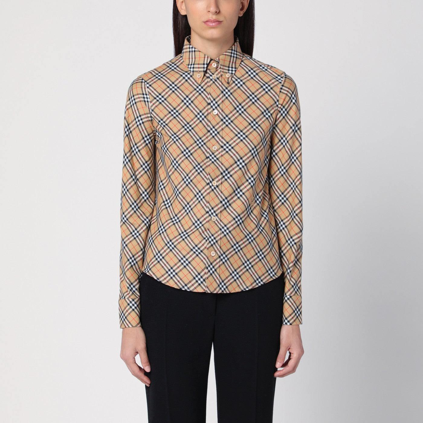 Beige cotton Burberry shirt with an all over check pattern, featuring a button-down collar, long sleeves with buttoned cuffs, logo embroidery on the front, a curved hem and a front button placket.