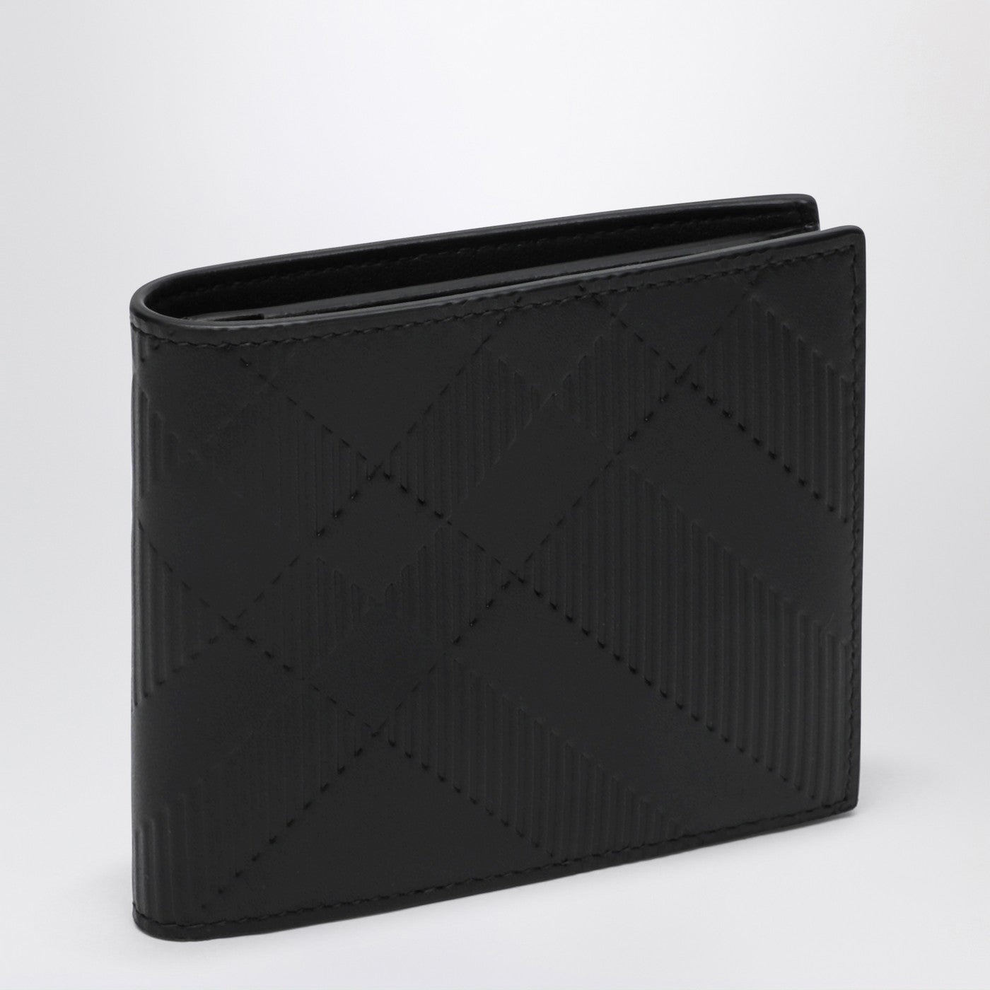 Black leather bi-fold wallet with embossed check pattern, featuring a bill compartment, four credit card slots, a coin pocket, and logo print inside.