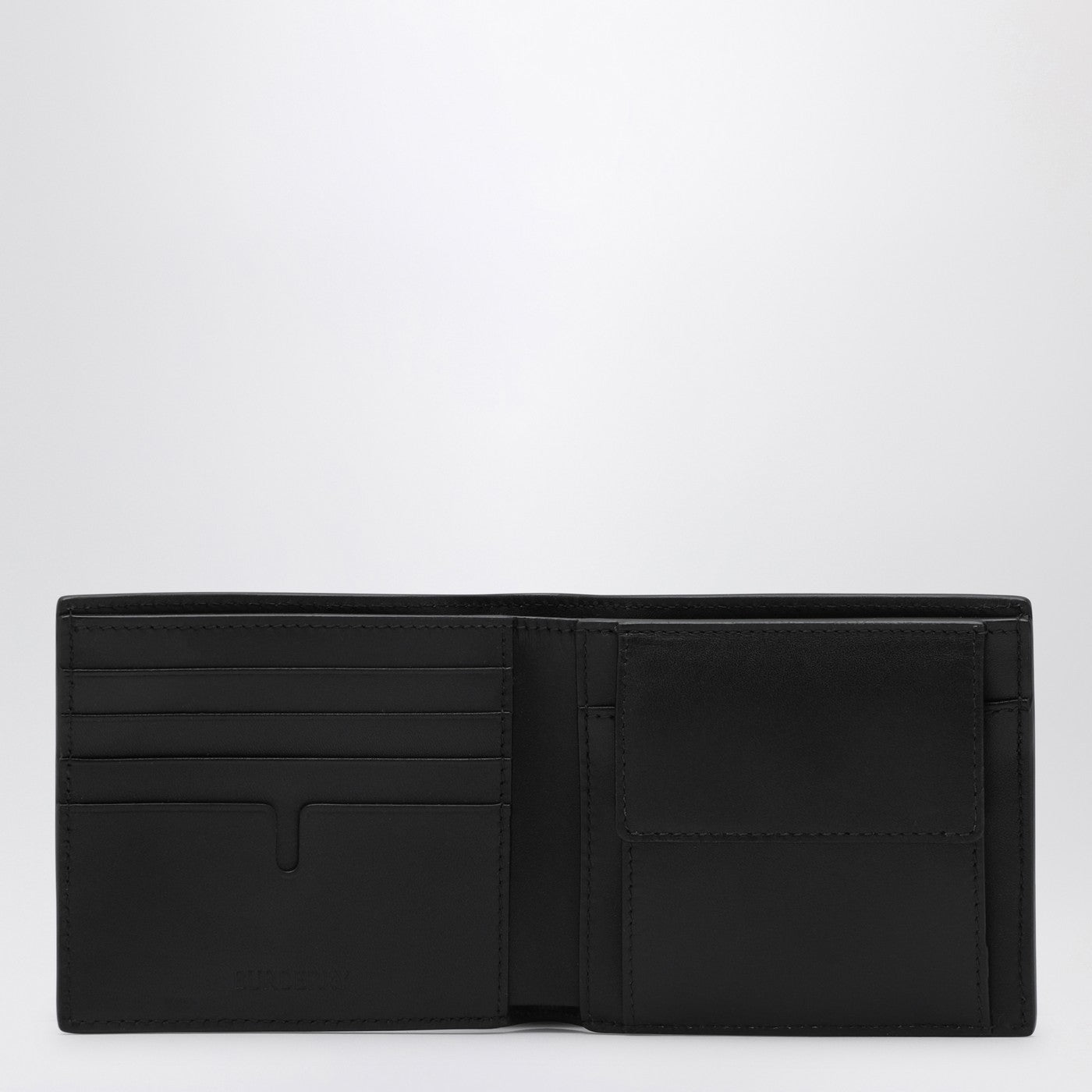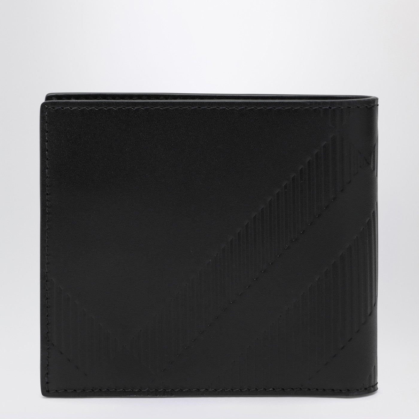 Bi-fold wallet by Burberry in black leather, featuring an embossed check pattern, credit card slots, a flap coin compartment and a banknote compartment.