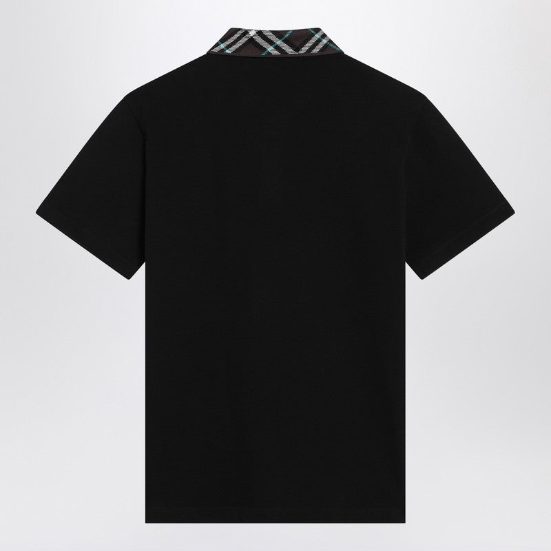 Black cotton Burberry polo, featuring short sleeves, front buttons, a Check pattern collar, and side slits.