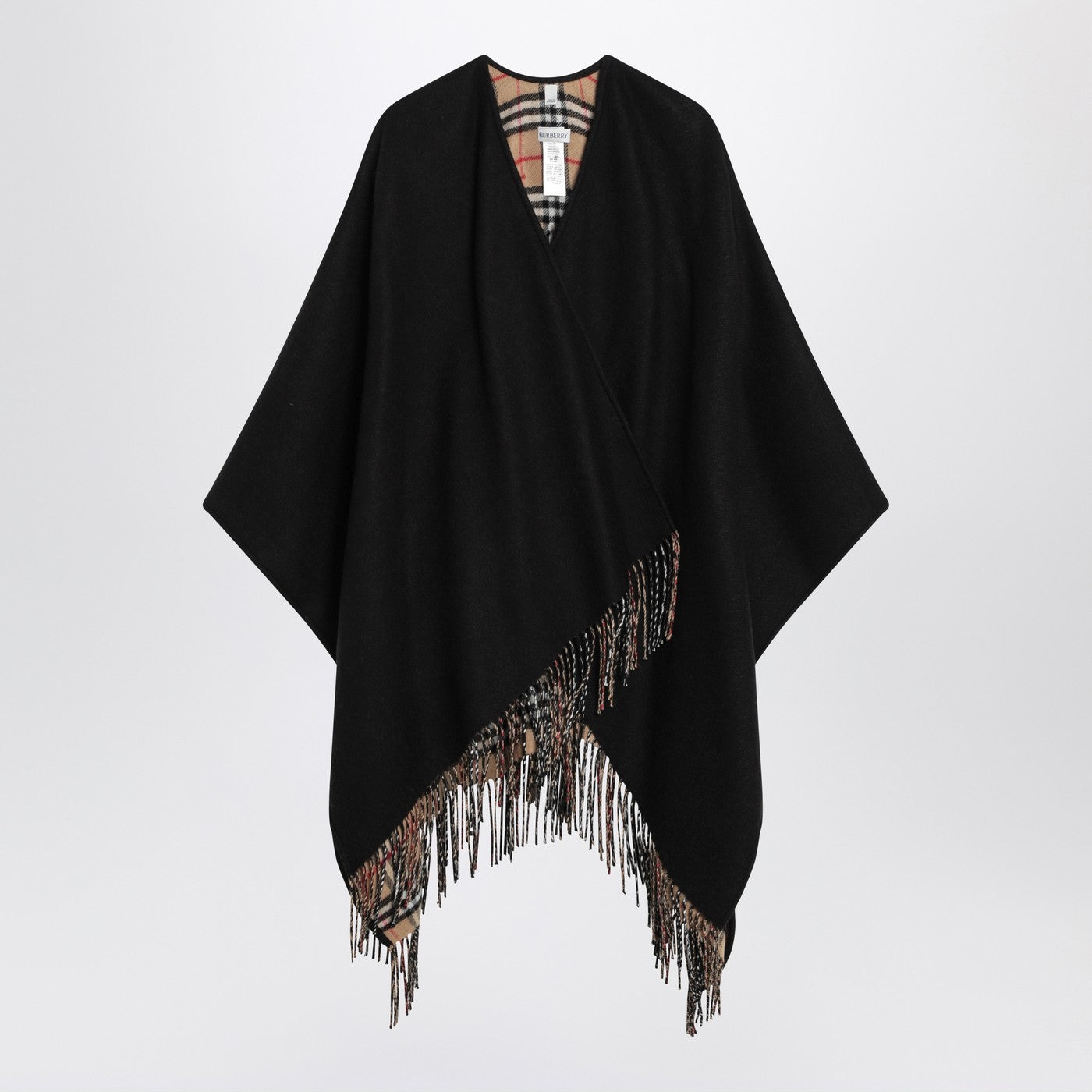 Burberry black wool cape with Check pattern inside and decorative fringes at the ends.