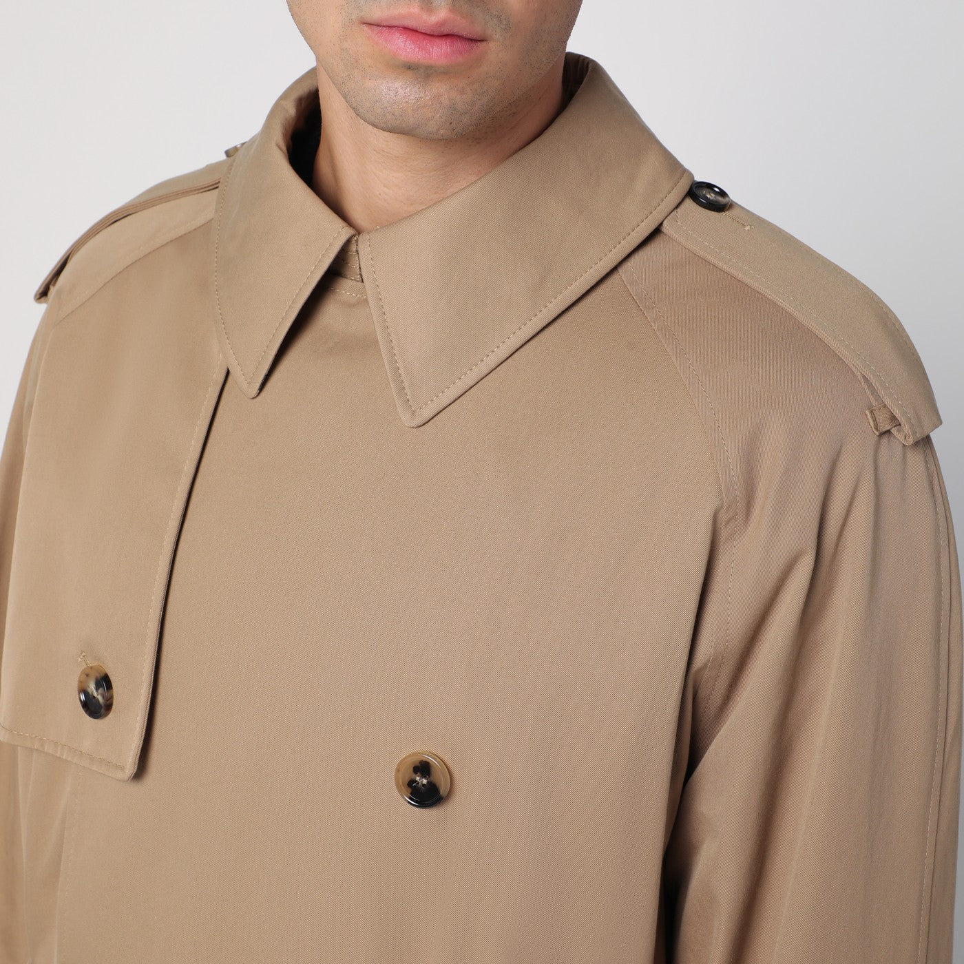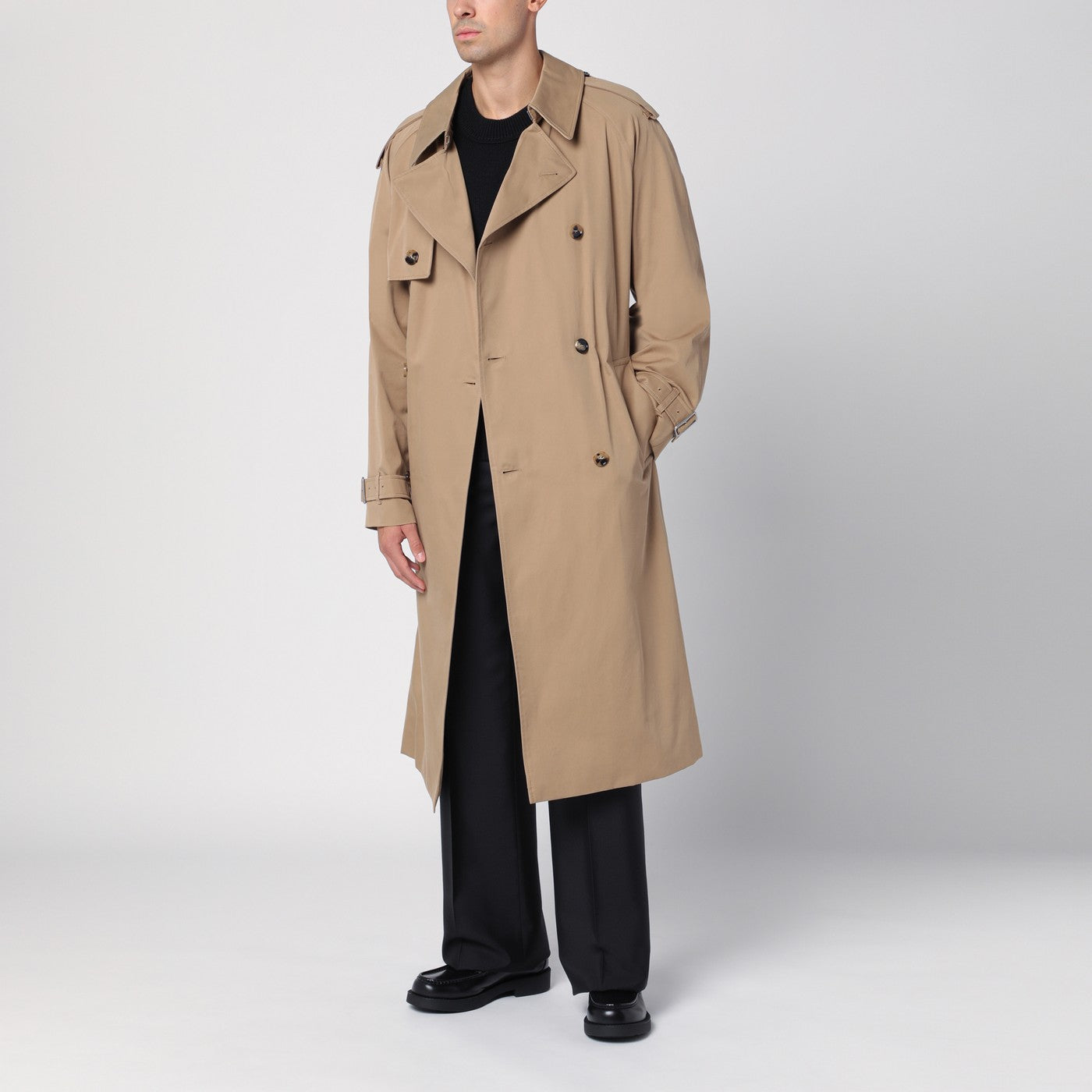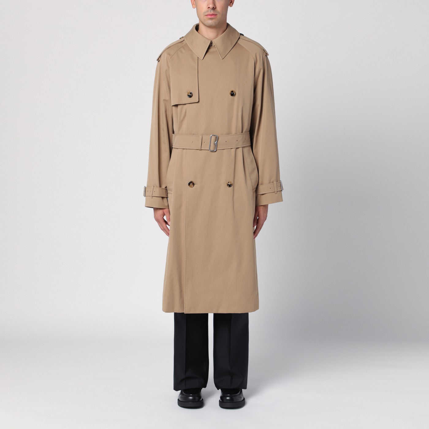 Beige cotton gabardine long trench coat from Burberry featuring a double-breasted front button fastening, a classic collar, long sleeves with belted cuffs, two side welt pockets, a belted waist, shoulder badges and a back vent.