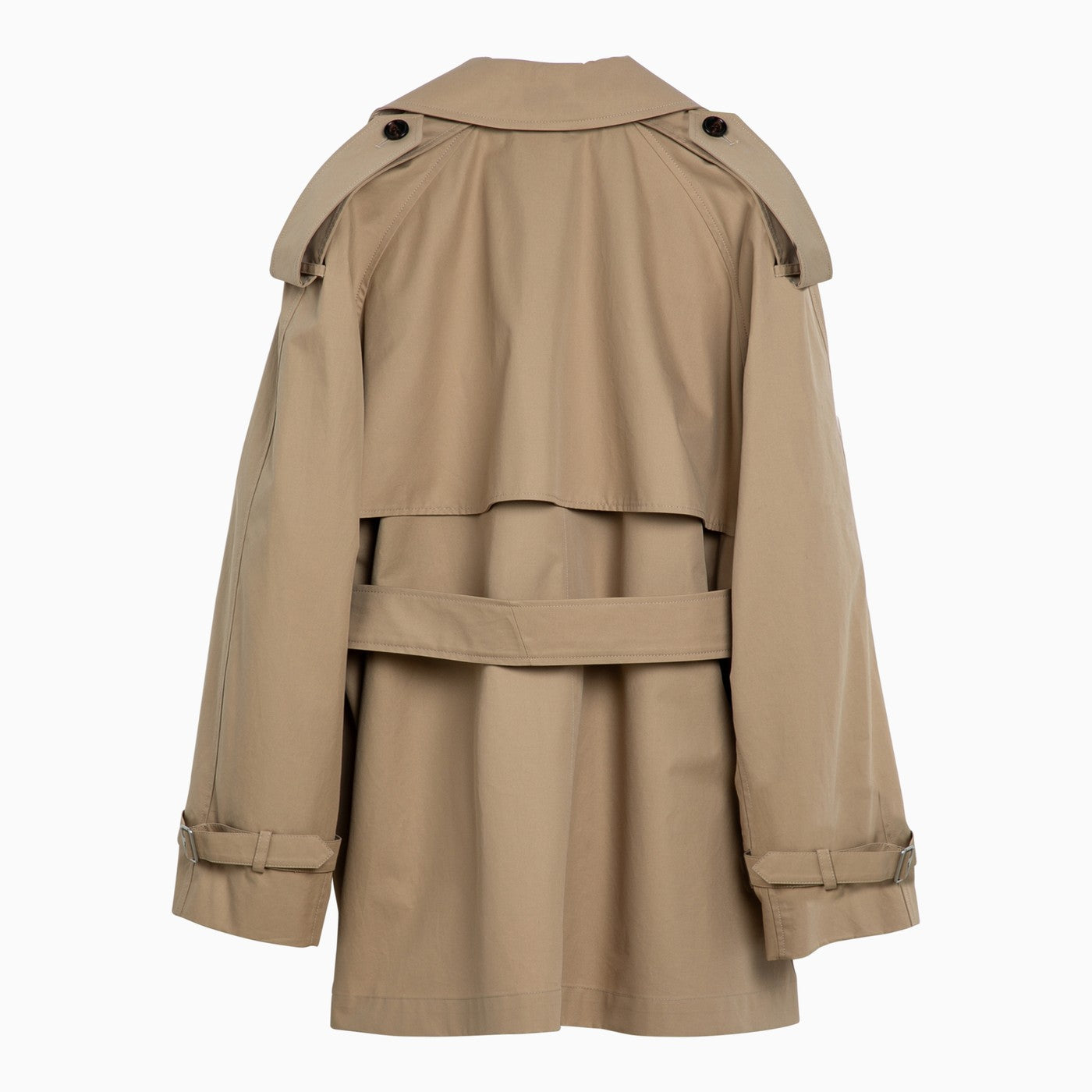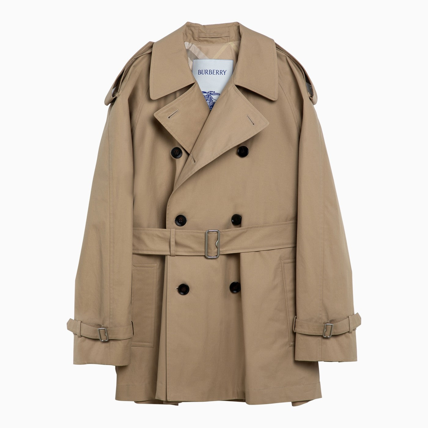 Beige cotton short double-breasted trench coat from Burberry featuring a pointed collar, long sleeves, a front button placket, a belted waist, shoulder insignia and cuff straps.