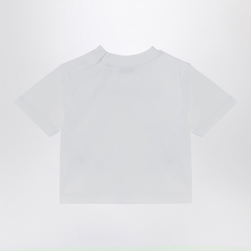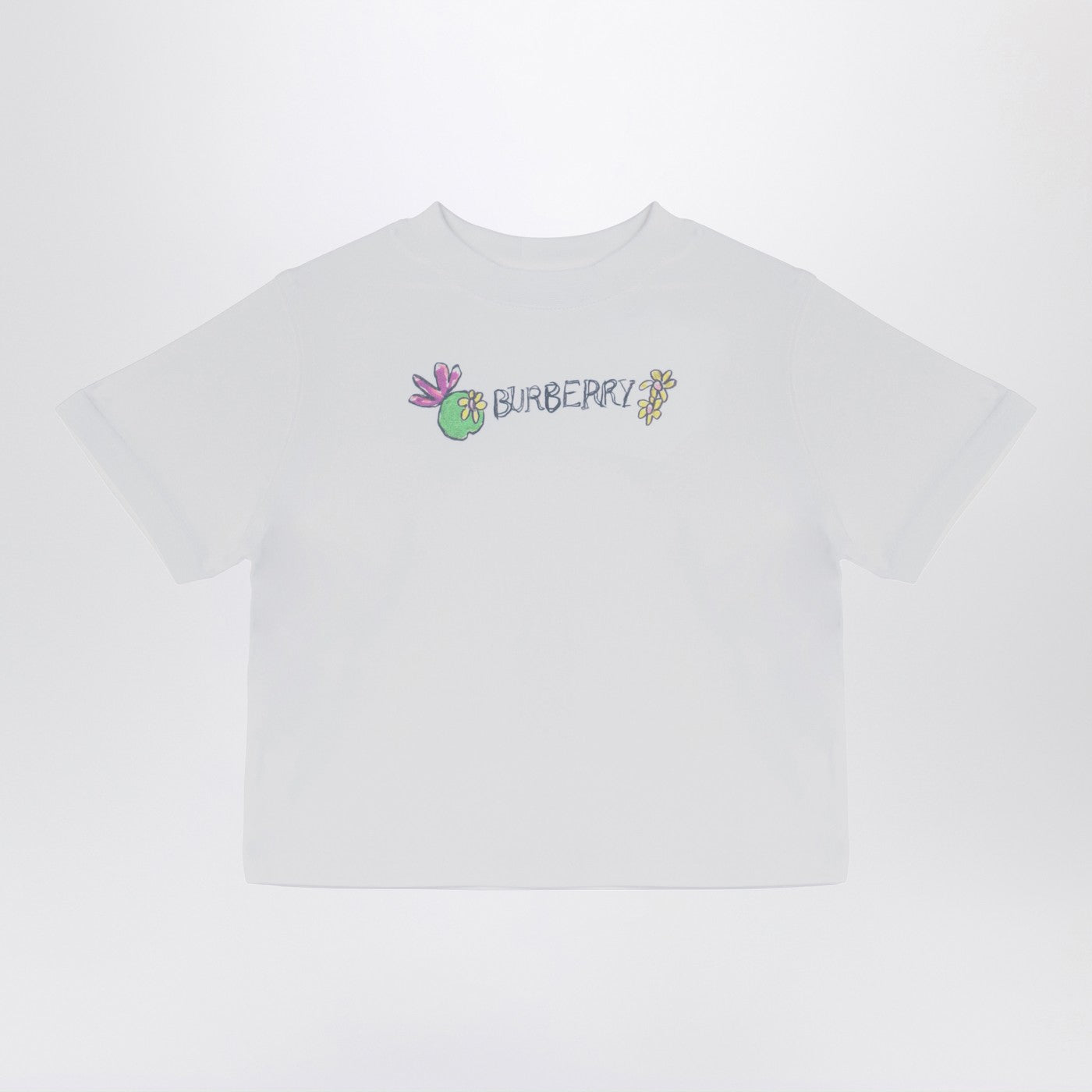 White cotton Burberry crew-neck T-shirt featuring short sleeves, contrasting front lettering logo and straight hem.