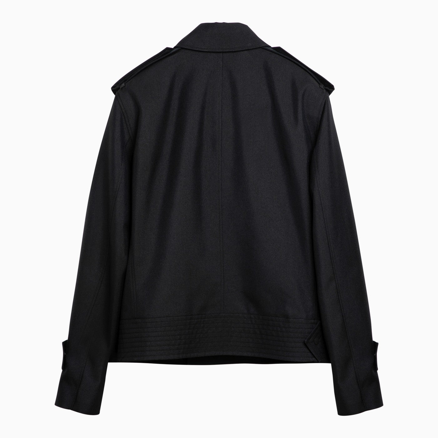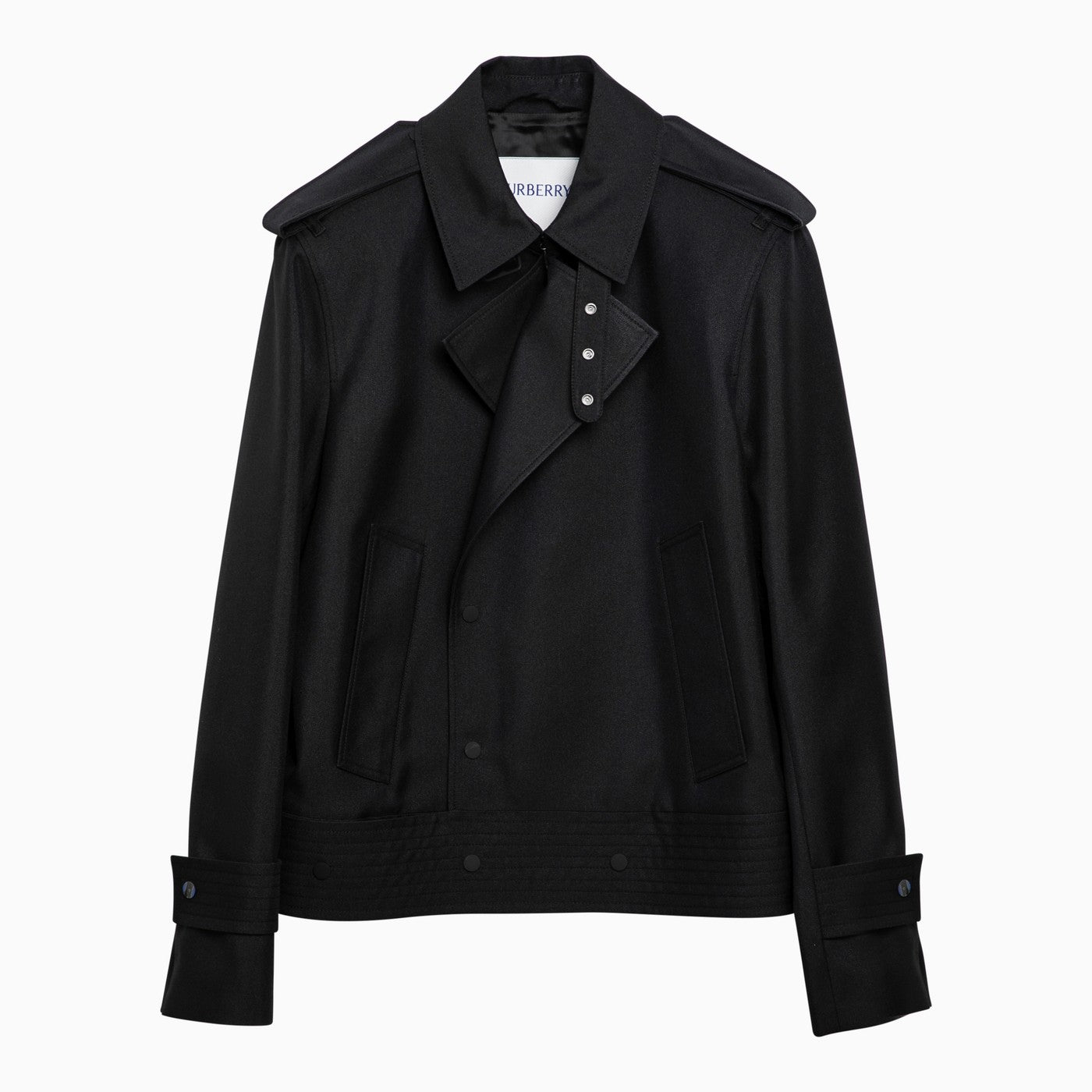 Short trench coat by Burberry in black silk blend featuring a double-breasted design, a hook-and-eye collar, a front snap button fastening, epaulettes, side welt pockets and button cuffs.