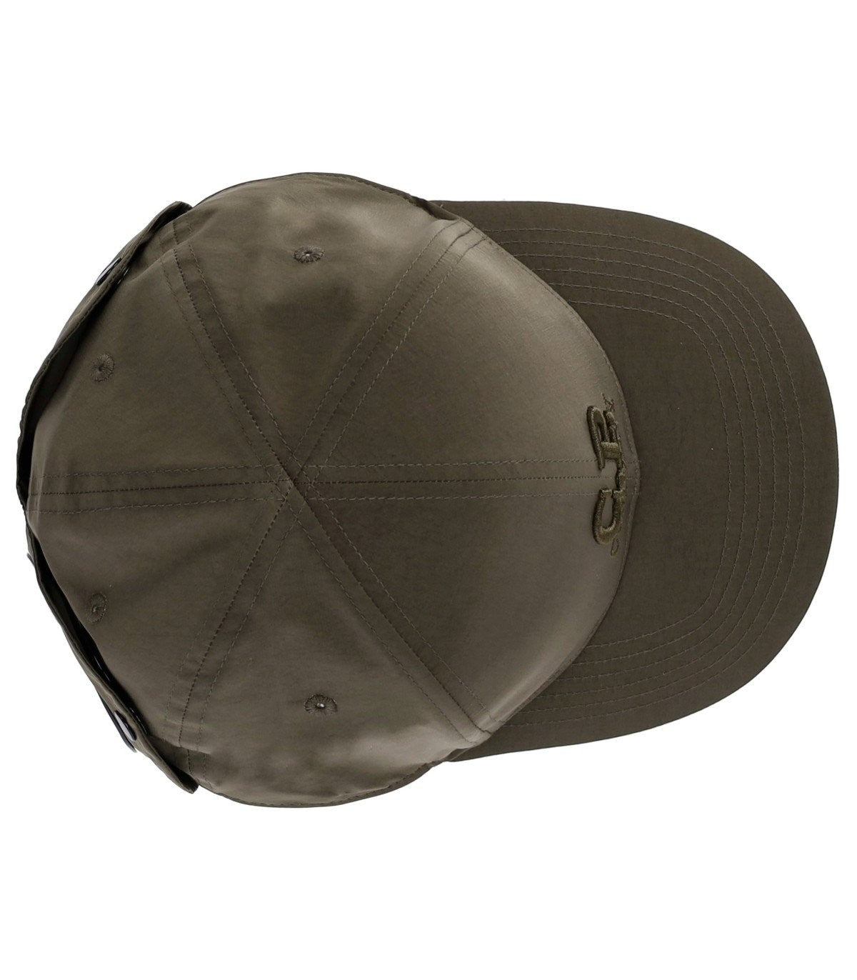 Cappello di C.P. Company realizzato in tessuto Chrome-R, un nylon ad alte prestazioni, nei toni del verde militare. Logo ricamato in tono sul davanti e iconiche lenti Goggle sul retro. Composizione: 100% poliammide.