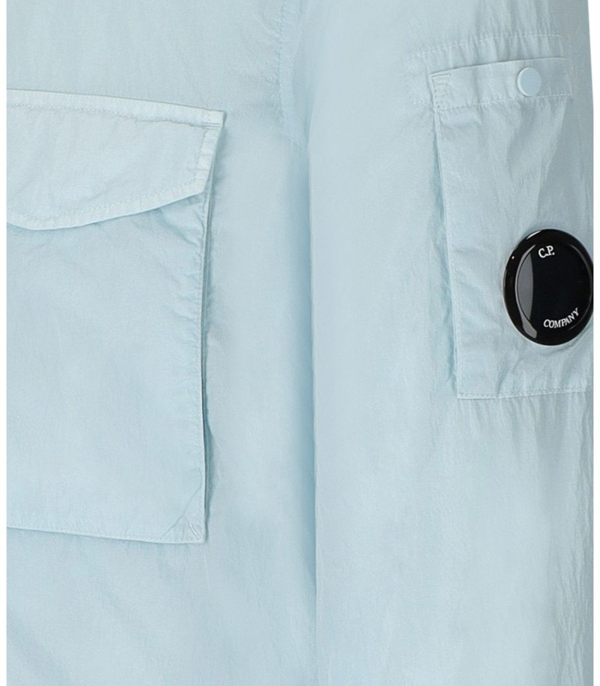 C.P. Company overshirt made of Chrome-R, a recycled blue nylon fabric. It has a flap pocket on the chest, an iconic pocket with C.P. lens on the left sleeve. Zip and button closure. Mesh lining, regular fit. Composition: 100% Polyamide.