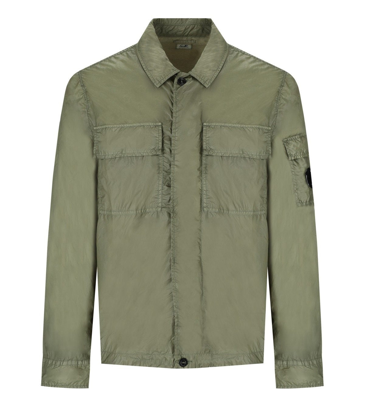 C.P. Company overshirt made of CS II, a transparent polyurethane coating, garment-dyed in shades of green. Waterproof, it has front pockets with flaps, iconic C.P. lens on the left sleeve, button closure, and drawstring at the waist to adjust the fit. Regular fit. The model is 188 cm tall and wears size L. Composition: 100% polyamide. Coating: 100% polyurethane resin. Secondary fabric: 100% polyamide.