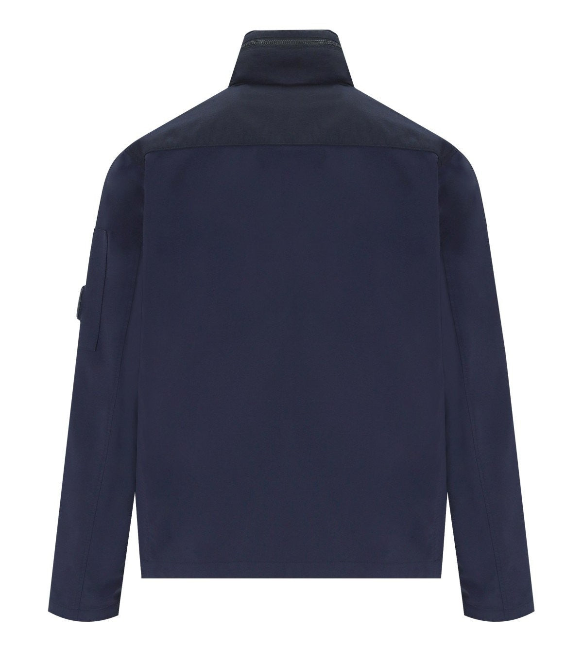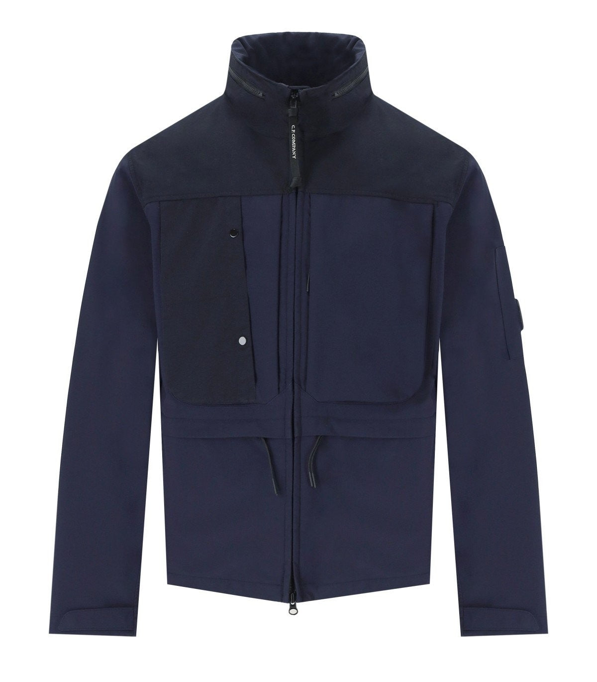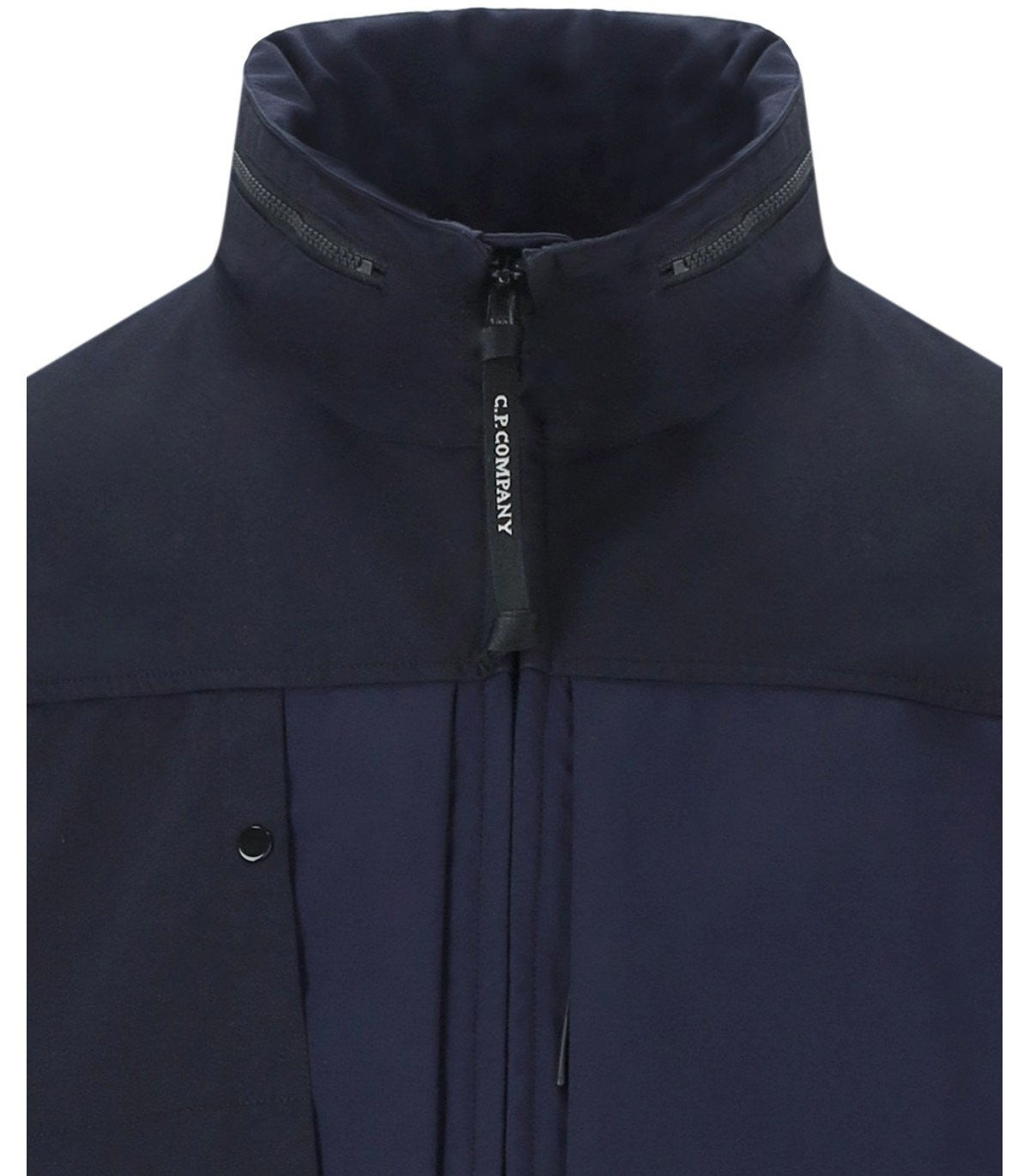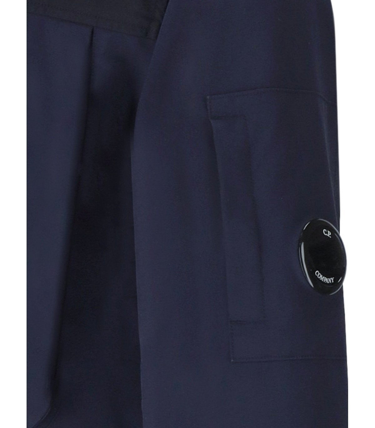 C.P. Company jacket made of GD Shell, a three-layer blue stretch nylon fabric, garment-dyed. It is equipped with maxi pockets with buttons and zippers on the front, iconic C.P. Lens detail on the left sleeve, and double-slider zipper closure. Interior with security pockets and drawstring at the bottom to adjust the fit. Removable hood from behind the neck, adjustable cuffs. Composition: 94% polyamide, 6% elastane.