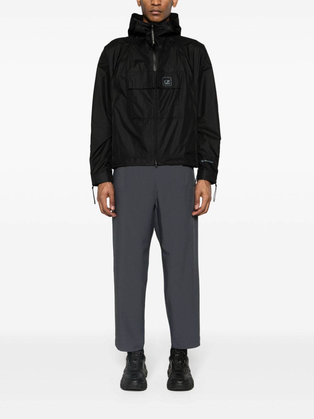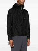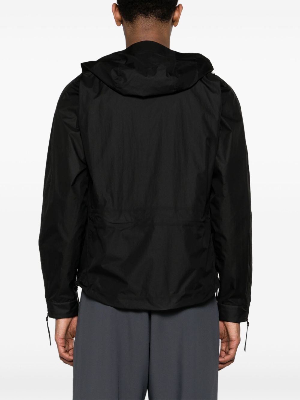 black lightweight Pertex fabric ripstop texture hydrophilic membrane waterproof logo print at the chest drawstring hood front two-way zip fastening branded zip puller long raglan sleeves adjustable waist strap drawstring hem two chest flap pockets two side zip-fastening pockets rear zip-fastening pocket collar to the hem two-way zip-fastening arms two-way zip-fastening expandable garment