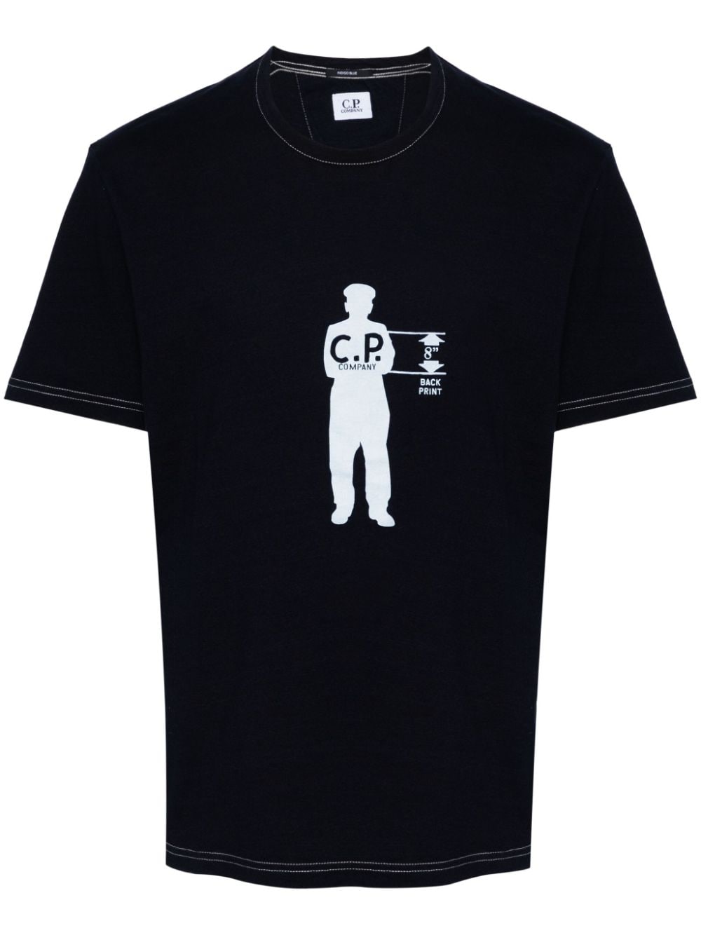 navy blue cotton jersey texture contrast stitching round neck short sleeves logo print to the front and rear straight hem