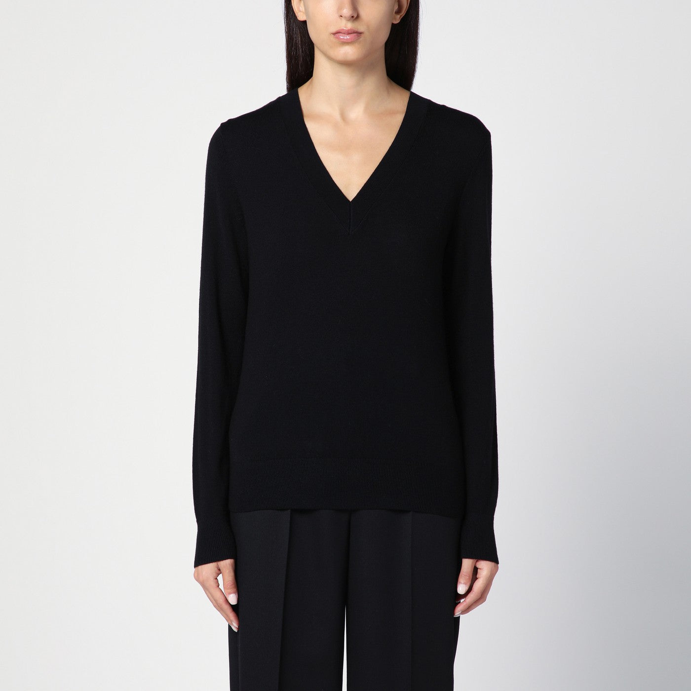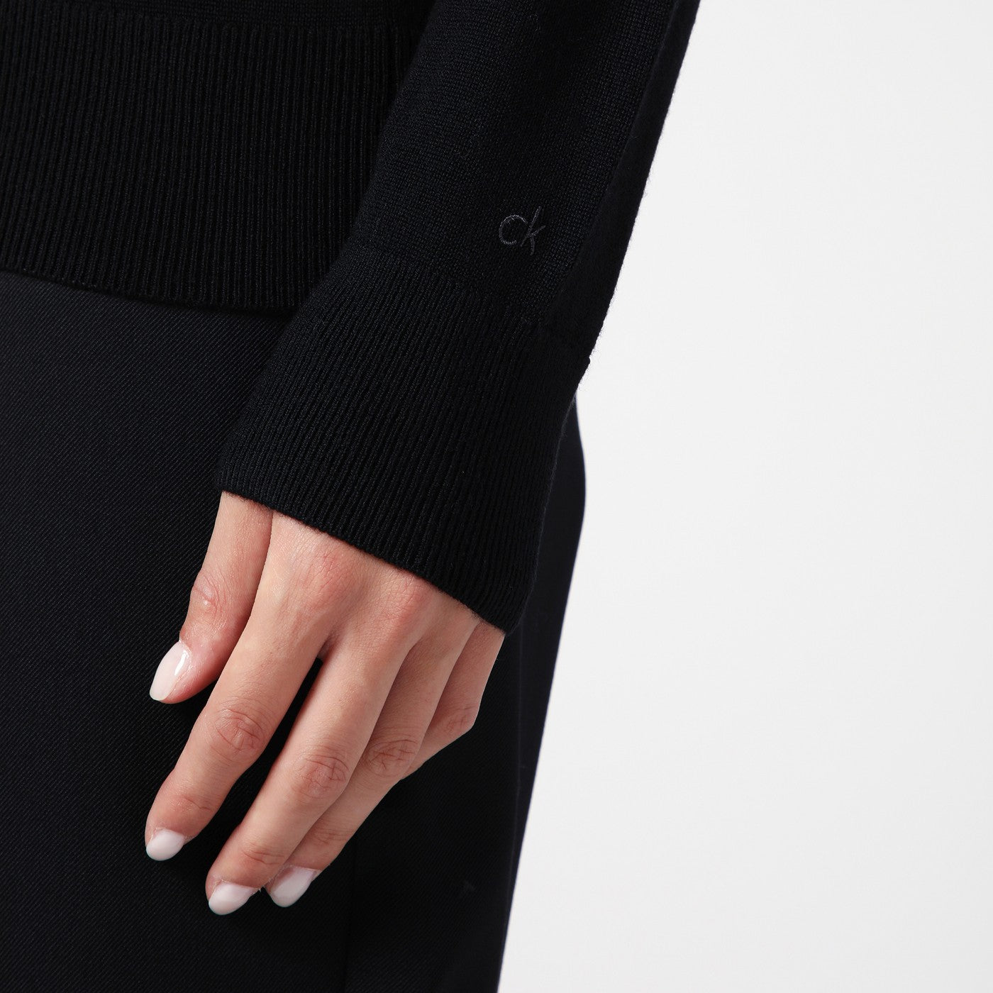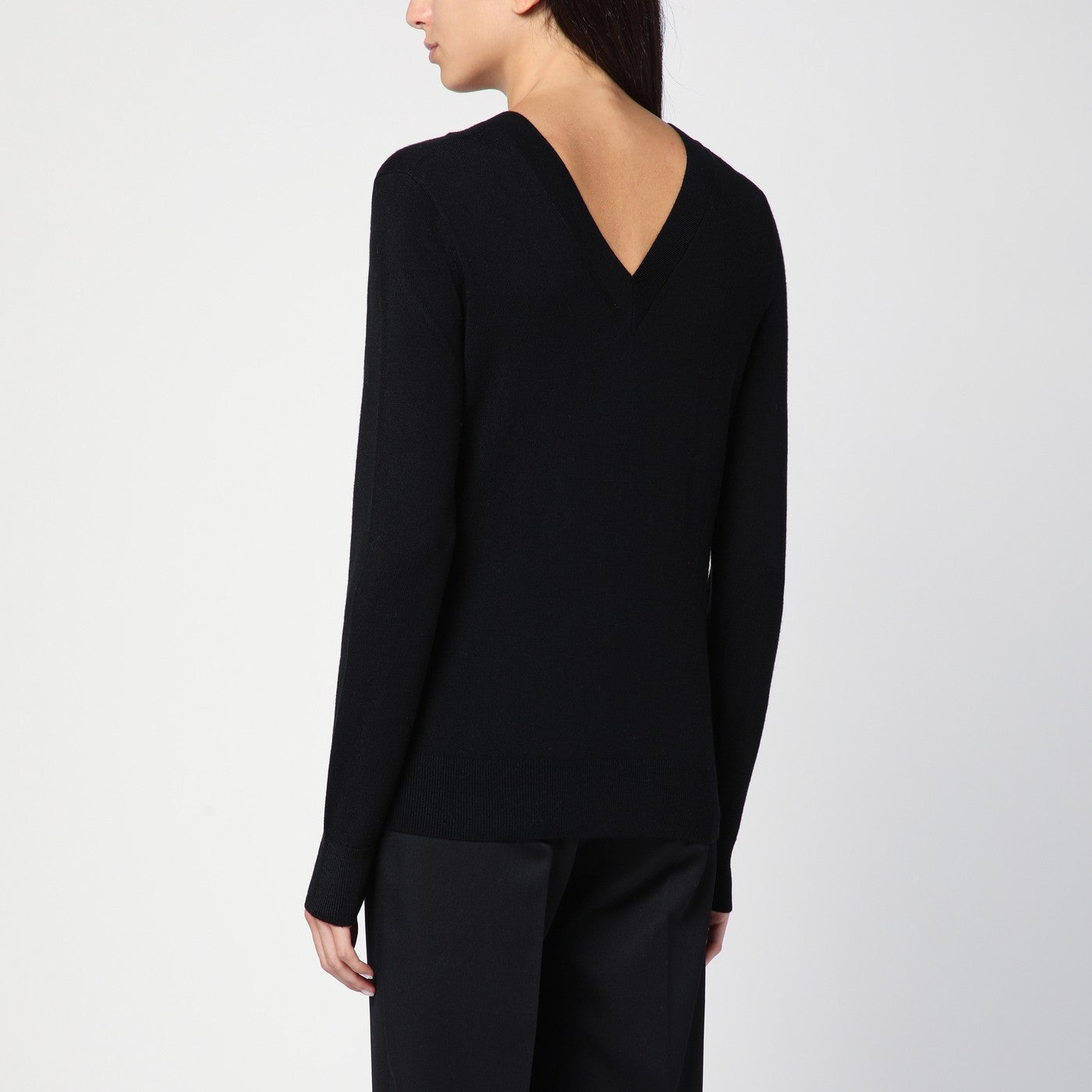 Black wool sweater by Calvin Klein, features a V-neck front and back, long sleeves with tone-on-tone logo embroidery cuff, ribbed hems and straight hem.