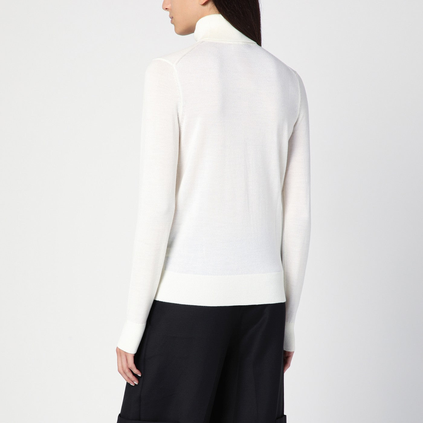 White wool sweater by Calvin Klein, features a high collar, long sleeves with tone-on-tone logo embroidery cuff and straight hem.