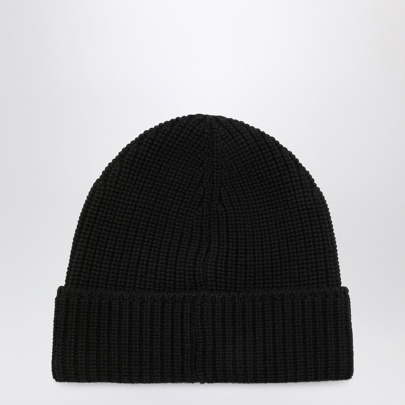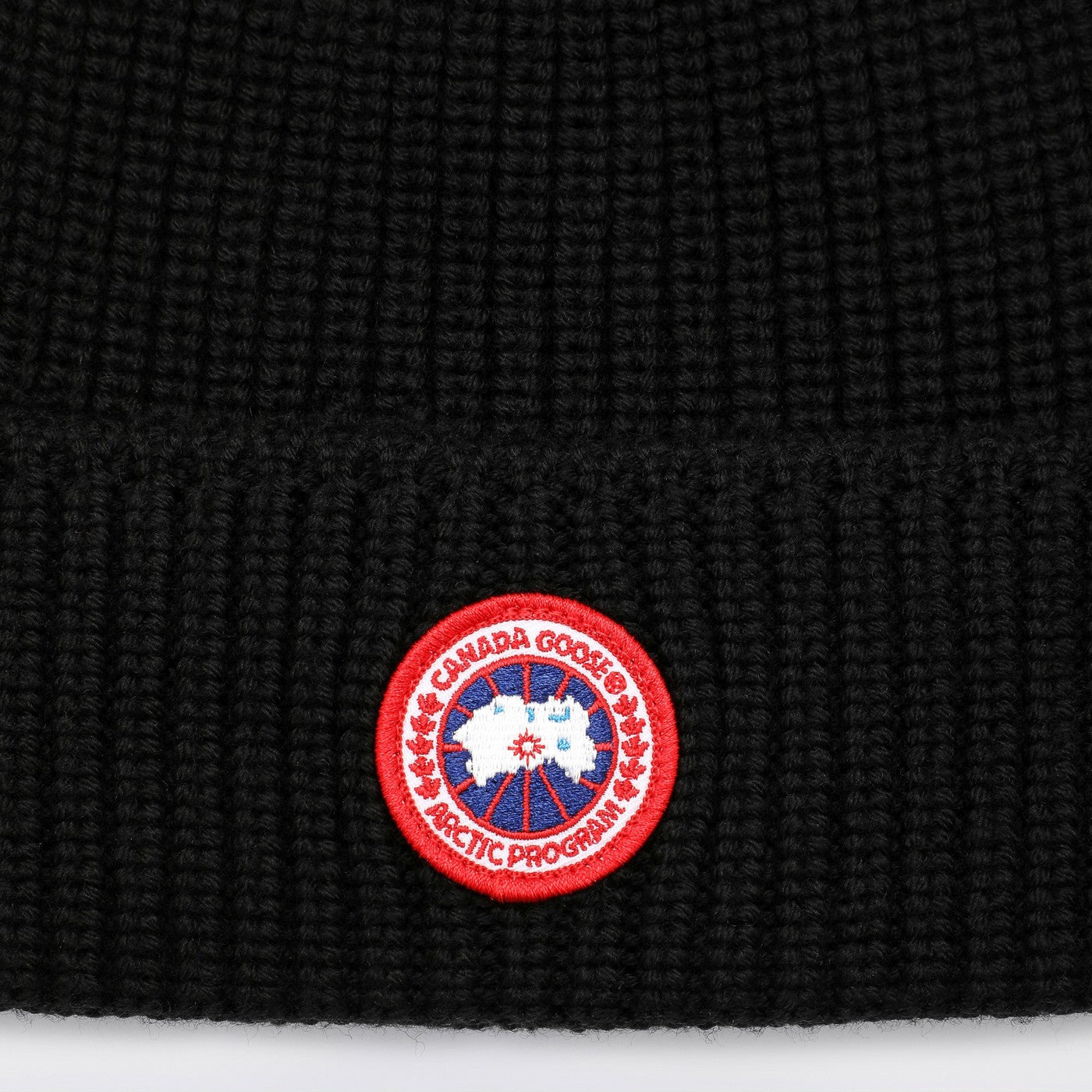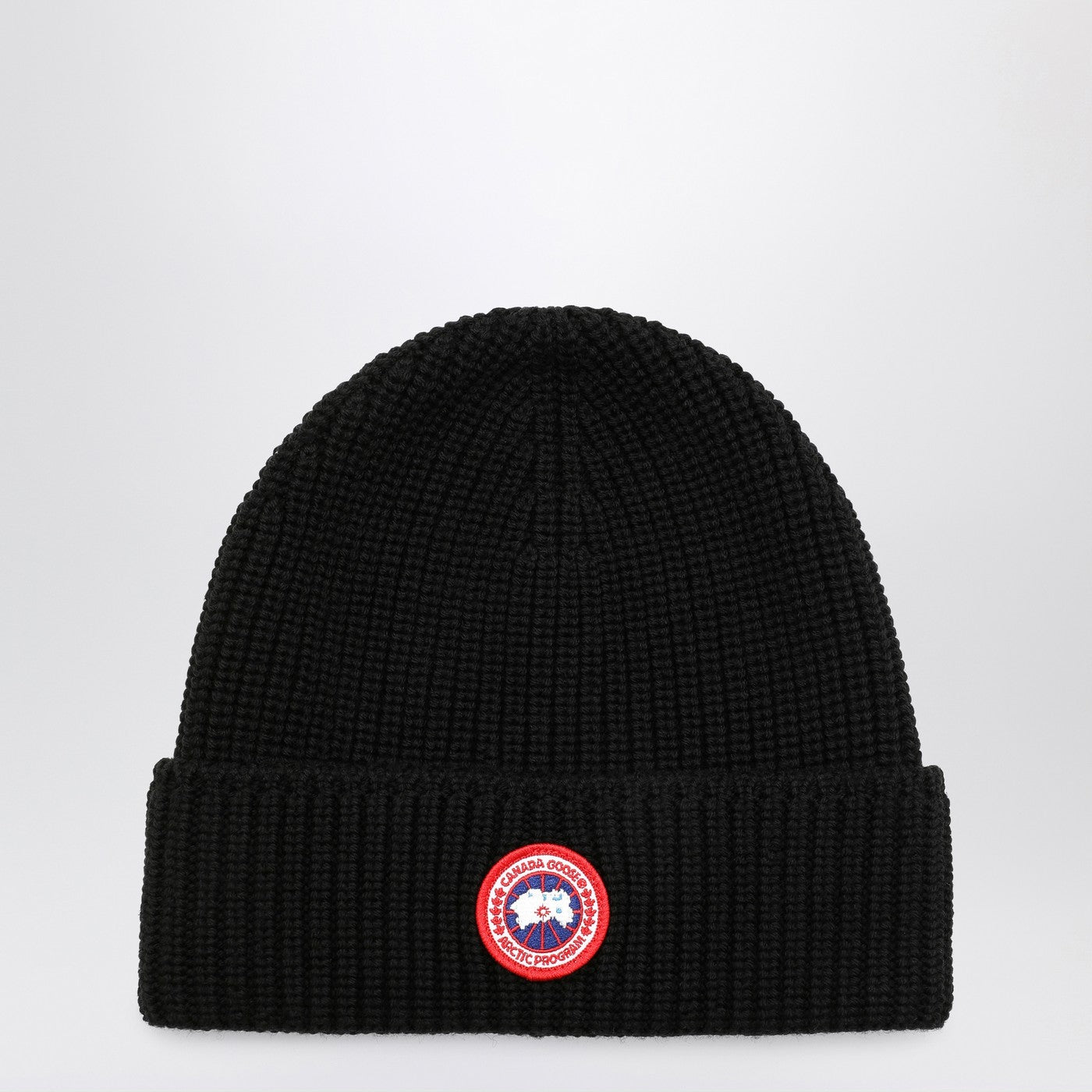 Canada Goose hat in black wool knit with a ribbed design and logo patch stitched on the front.