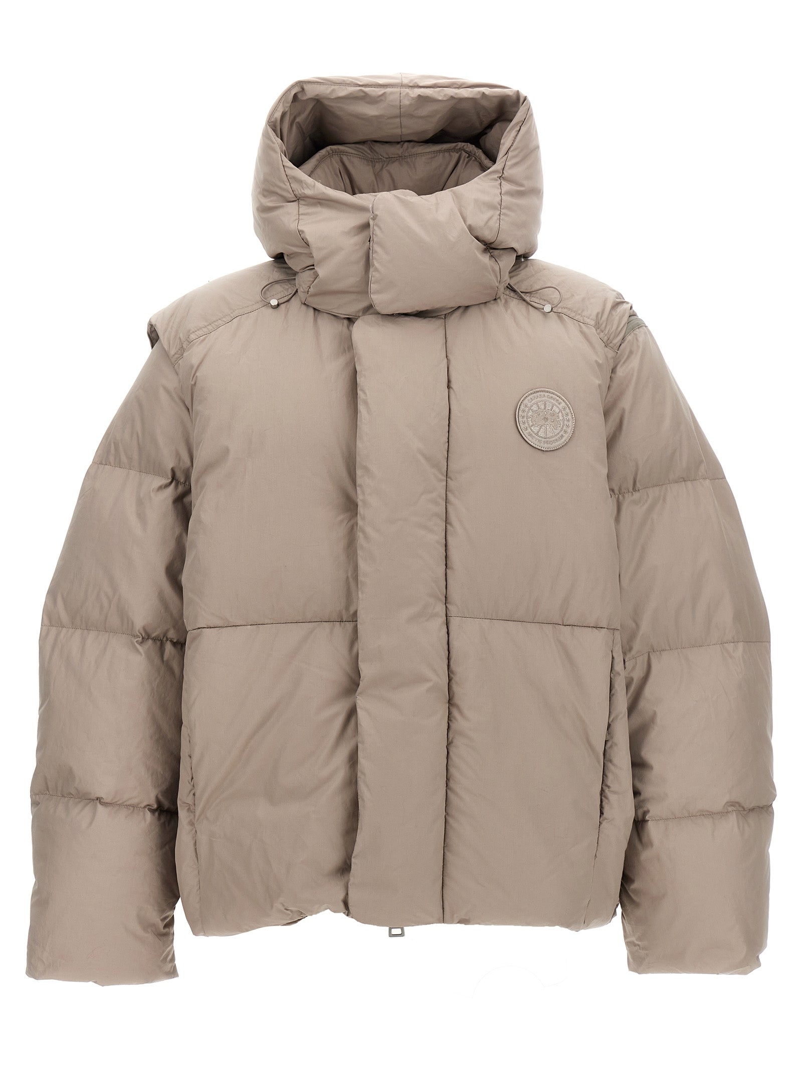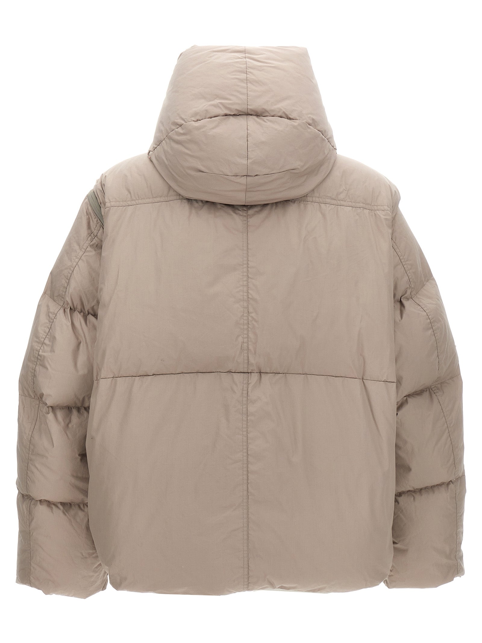 'Umba Coat' cotton down jacket with removable hood, zip and button closure, pockets, removable long sleeves with knitted cuffs, adjustable drawstring at the hem.