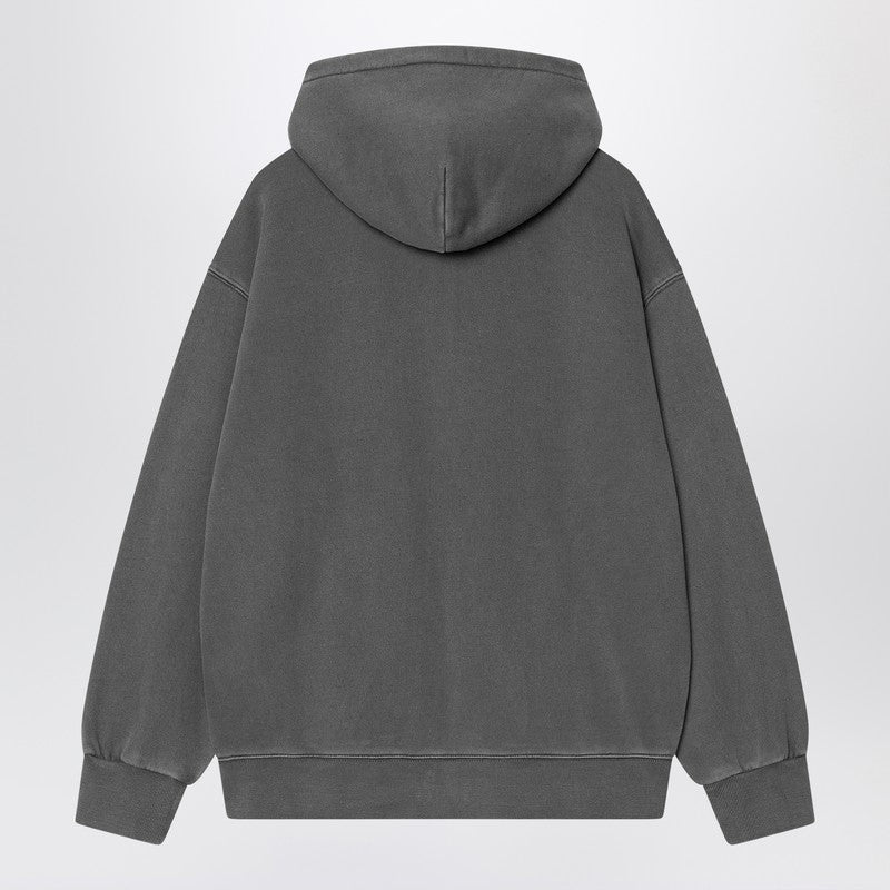Carhartt WIP crew neck sweatshirt in heavy loopback cotton jersey in graphite color with a pigment dye effect, featuring a balloon cut, adjustable quilted and padded hood, dropped shoulders, ribbed cuffs, kangaroo pocket, and square label overlay.