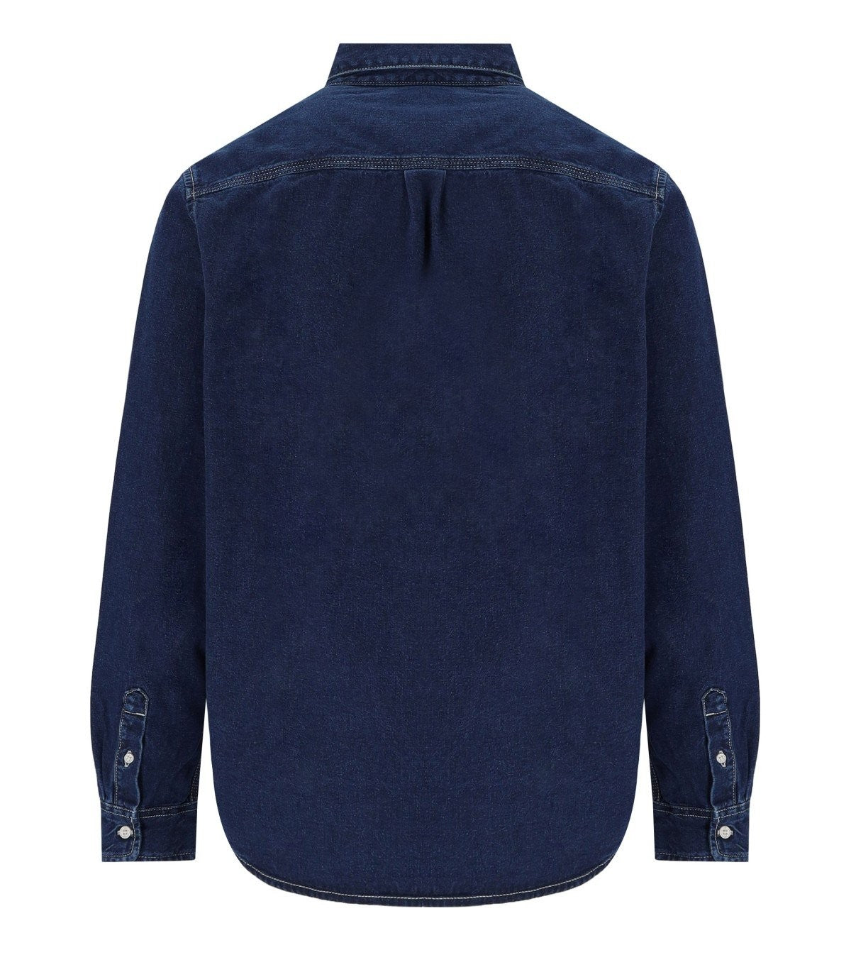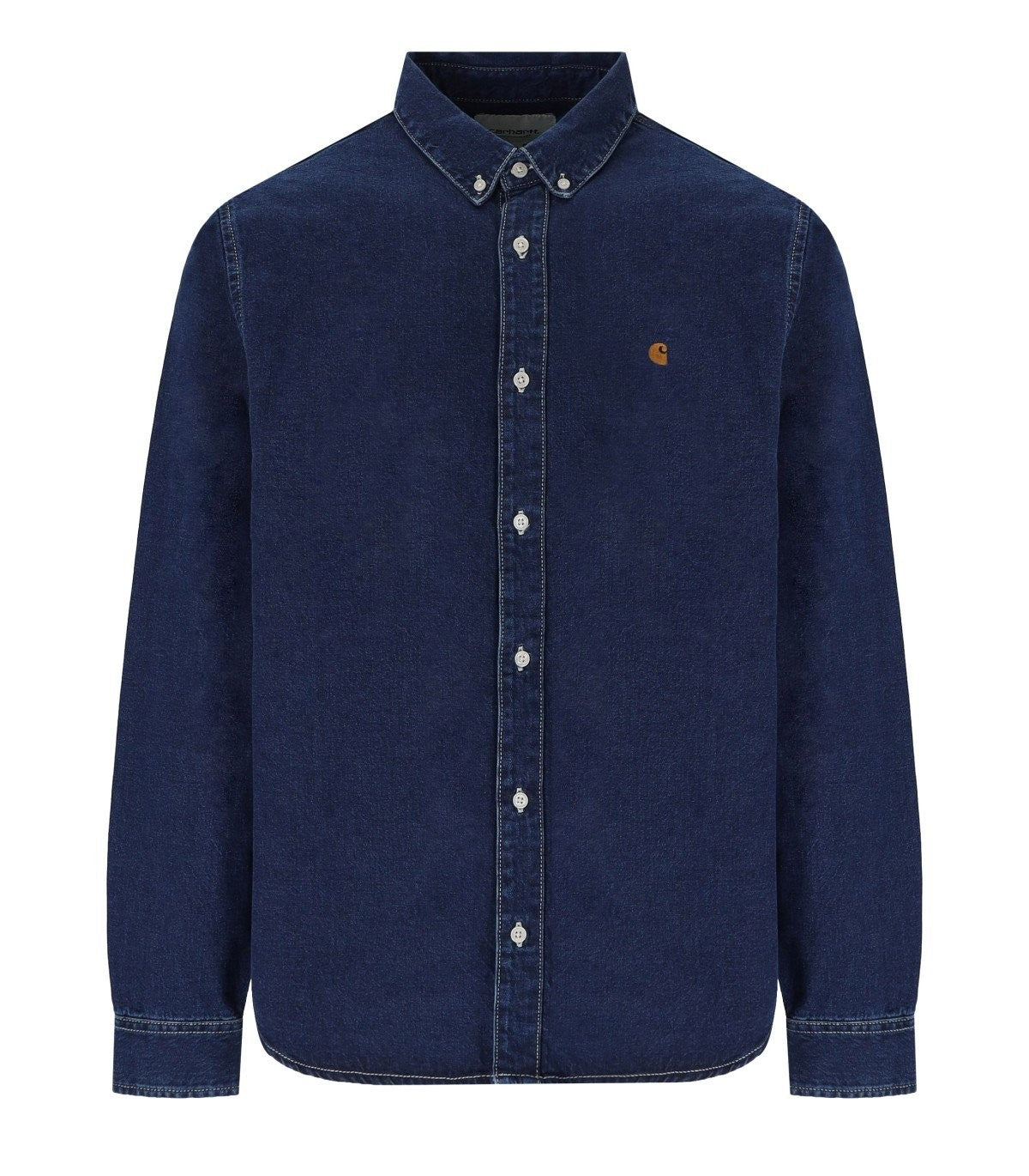 Carhartt Wip L/S shirt is made from medium-washed cotton denim, adorned with an embroidered logo on the chest. It features adjustable cuffs and a button closure. Loose fit. The model is 186 cm tall and wears a size M. Composition: 100% cotton.