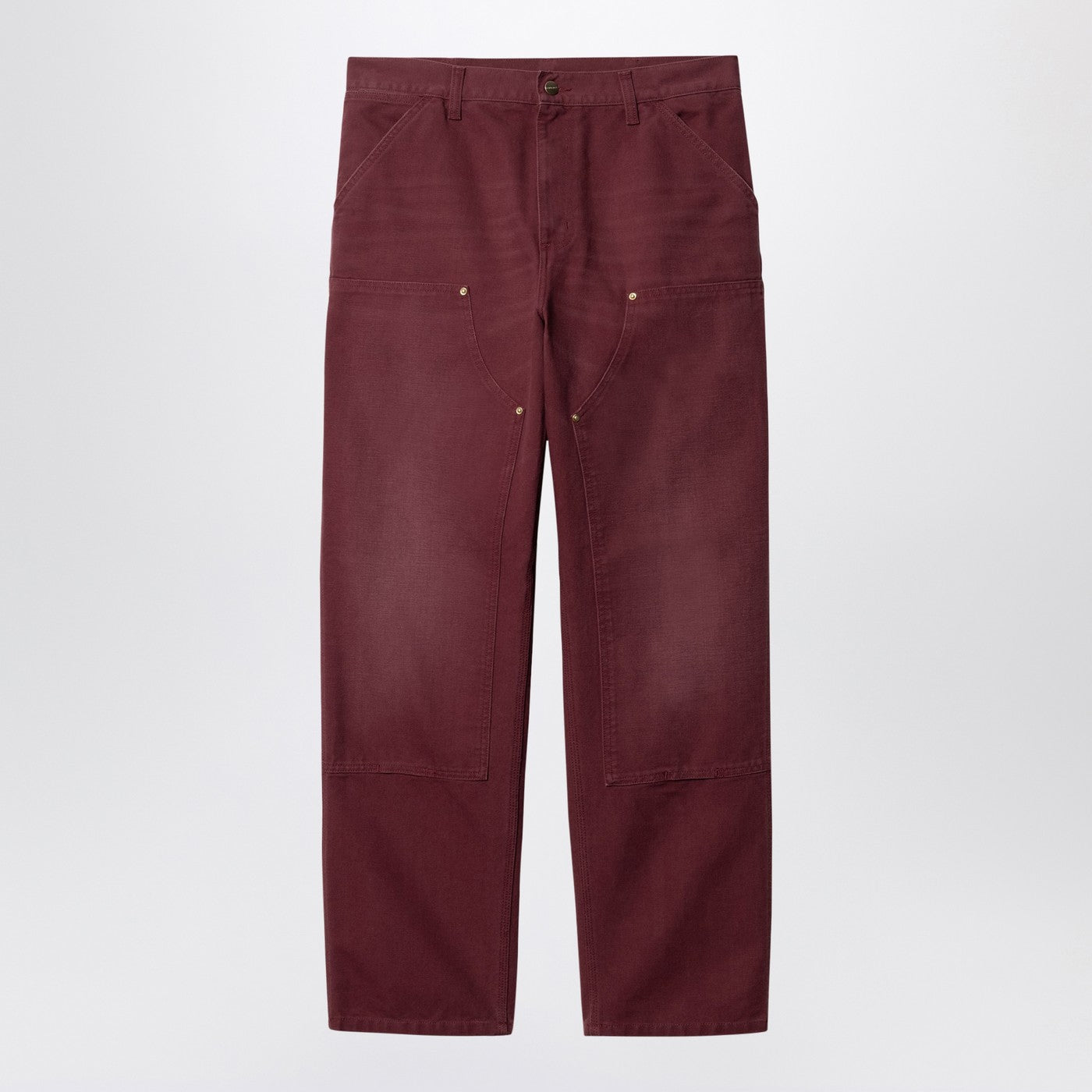 Malbec-coloured Dearborn canvas trousers by Carhartt WIP, featuring a normal waist, comfortable cut, straight leg, reinforced knees, rafter stitching at the points of greatest wear, rivets, tool pockets, hammer loop, relaxed straight fit, zip and button fastening and back logo patch.