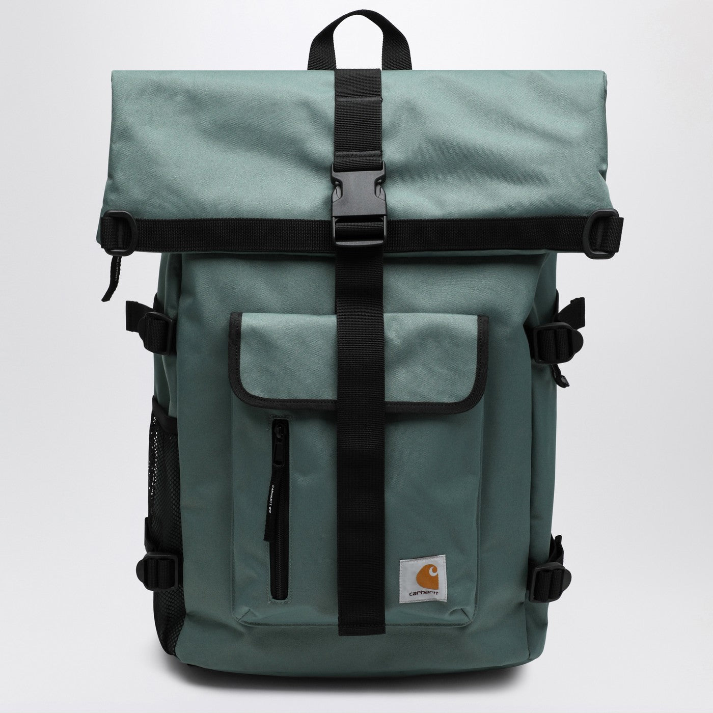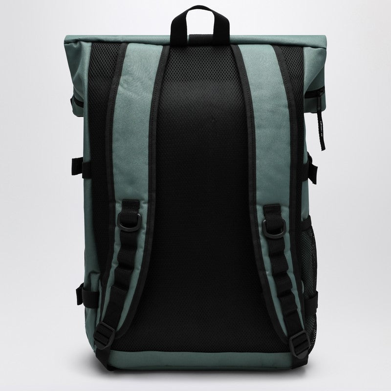 Carhartt WIP backpack in silver pine recycled polyester fabric, featuring waterproof design, expandable model, unlined main compartment, zip closure with flap, one padded internal pocket, adjustable shoulder straps, square logo label on the front, one front flap pocket, and two side mesh pockets.