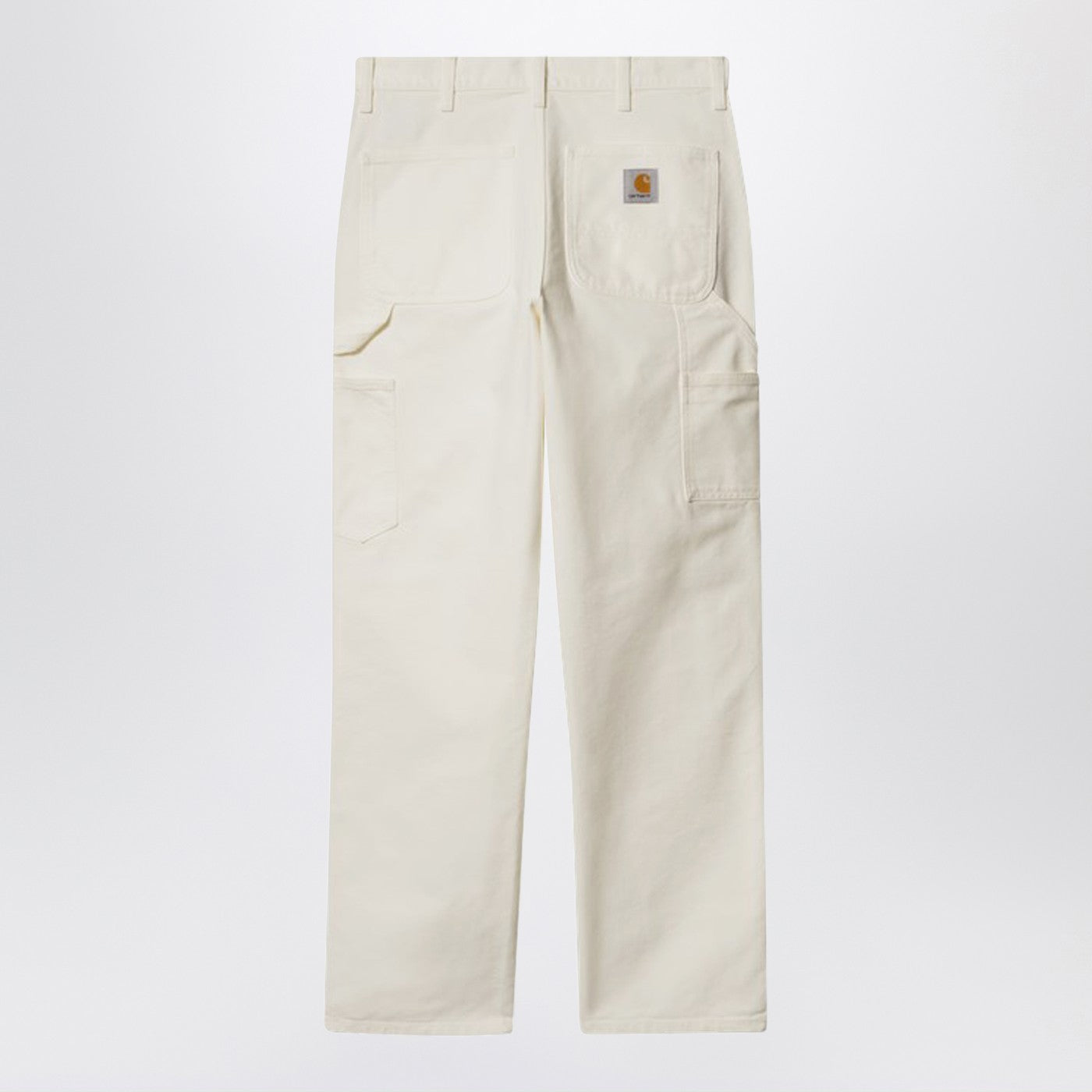 Carhartt WIP trousers inspired by classic work trousers, made from durable 340 gram Dearborn canvas, which slowly softens with use over time, in Wax colour, featuring a relaxed fit, straight leg, normal waist, heavy-duty topstitching, tool pockets, hammer loop, zip fly, relaxed straight fit and normal waist. The model is finished with a square fabric label.
