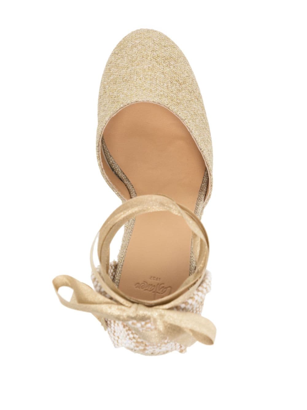 Carina 90mm wedge sandals from Castañer featuring sand beige, interwoven design, wraparound style, round toe, branded insole and high wedge heel.
