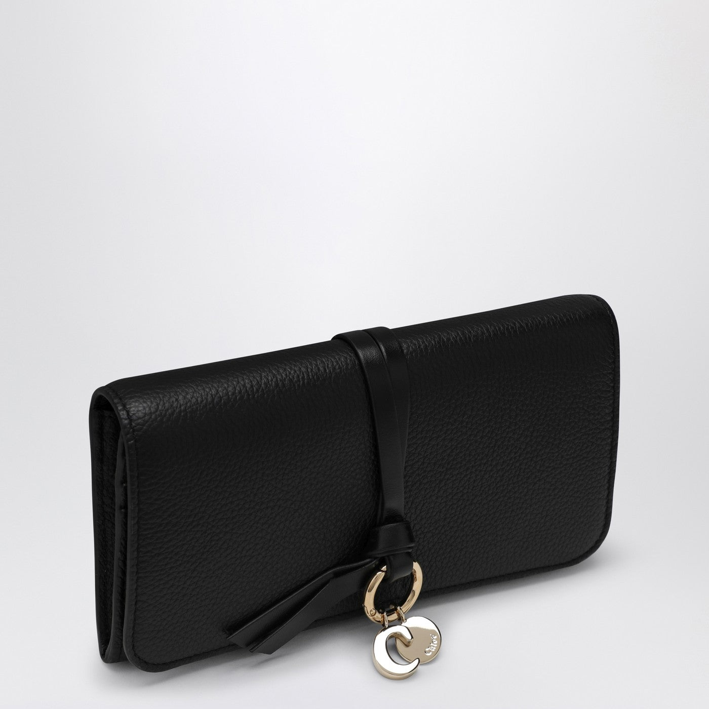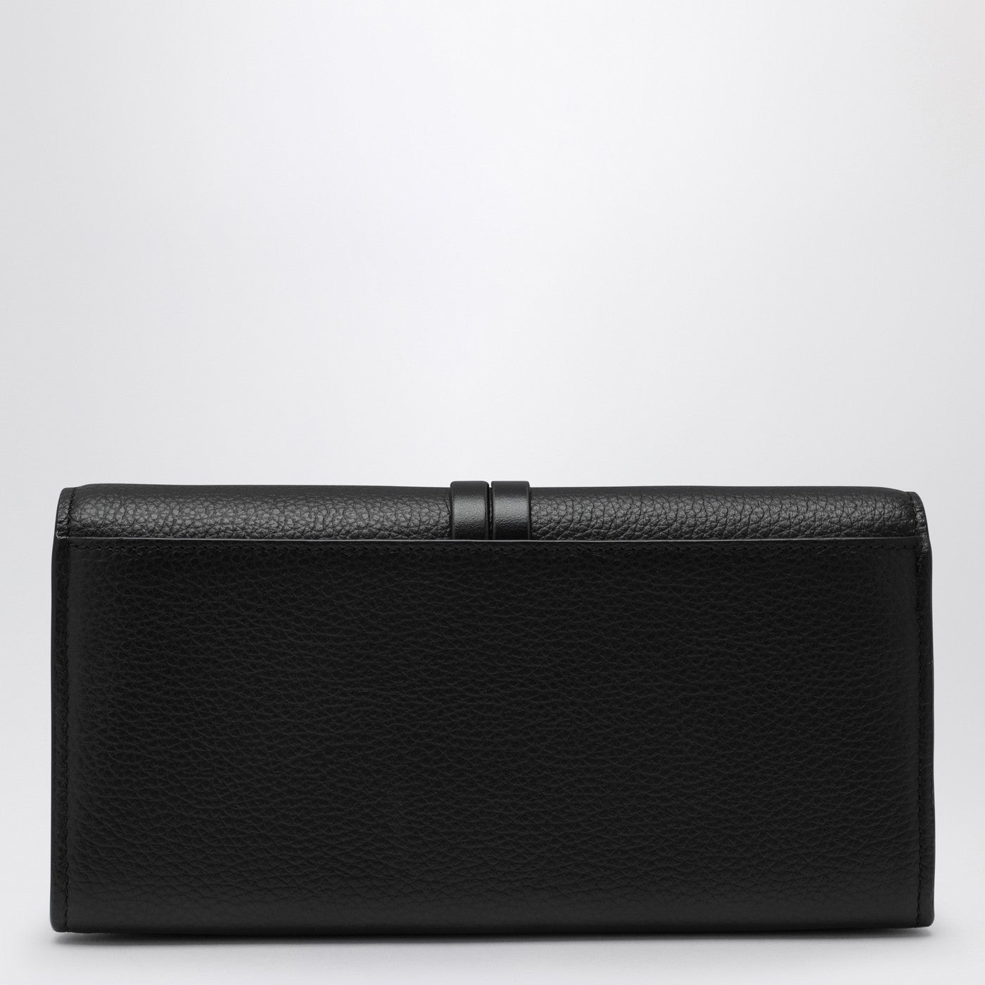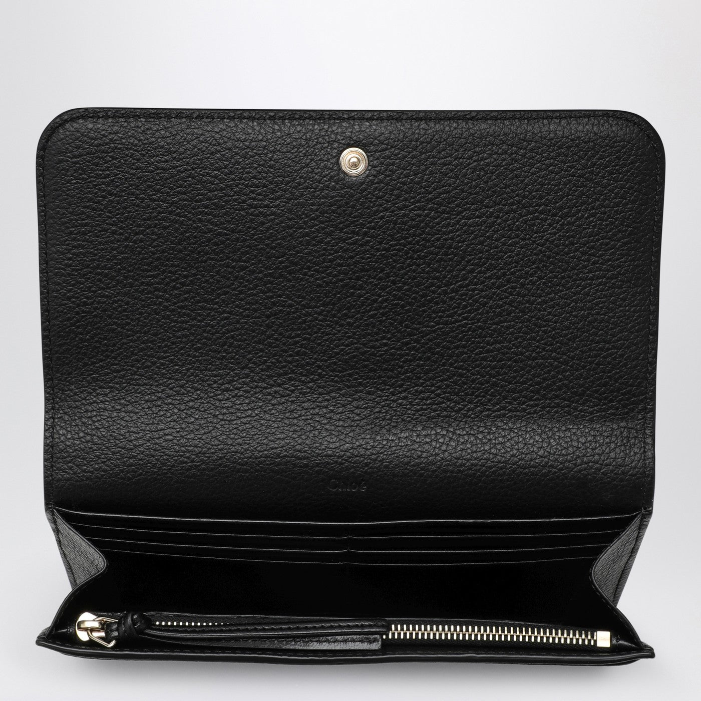 Black grained calf leather long wallet from Chloé featuring a flap and snap fastening, a main compartment, a flat pocket, an external flat pocket on the back, twelve card slots, a zipped pocket and a Gold charm.