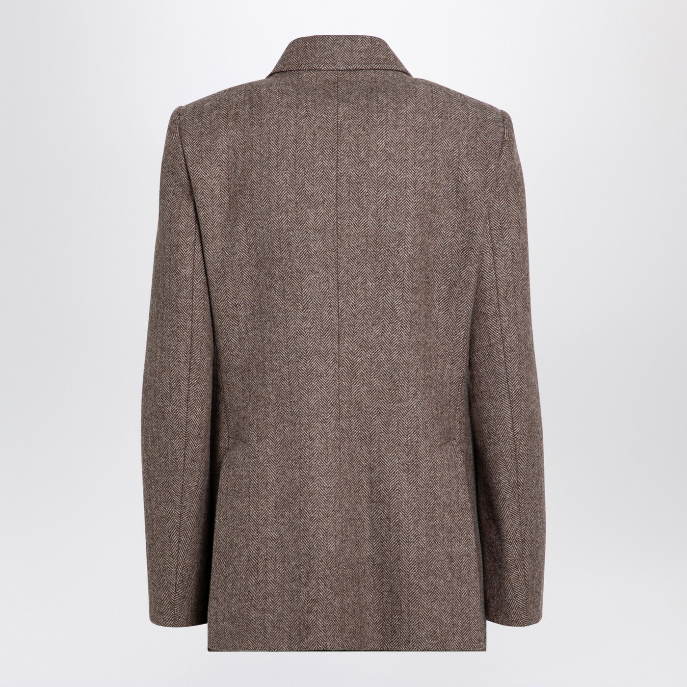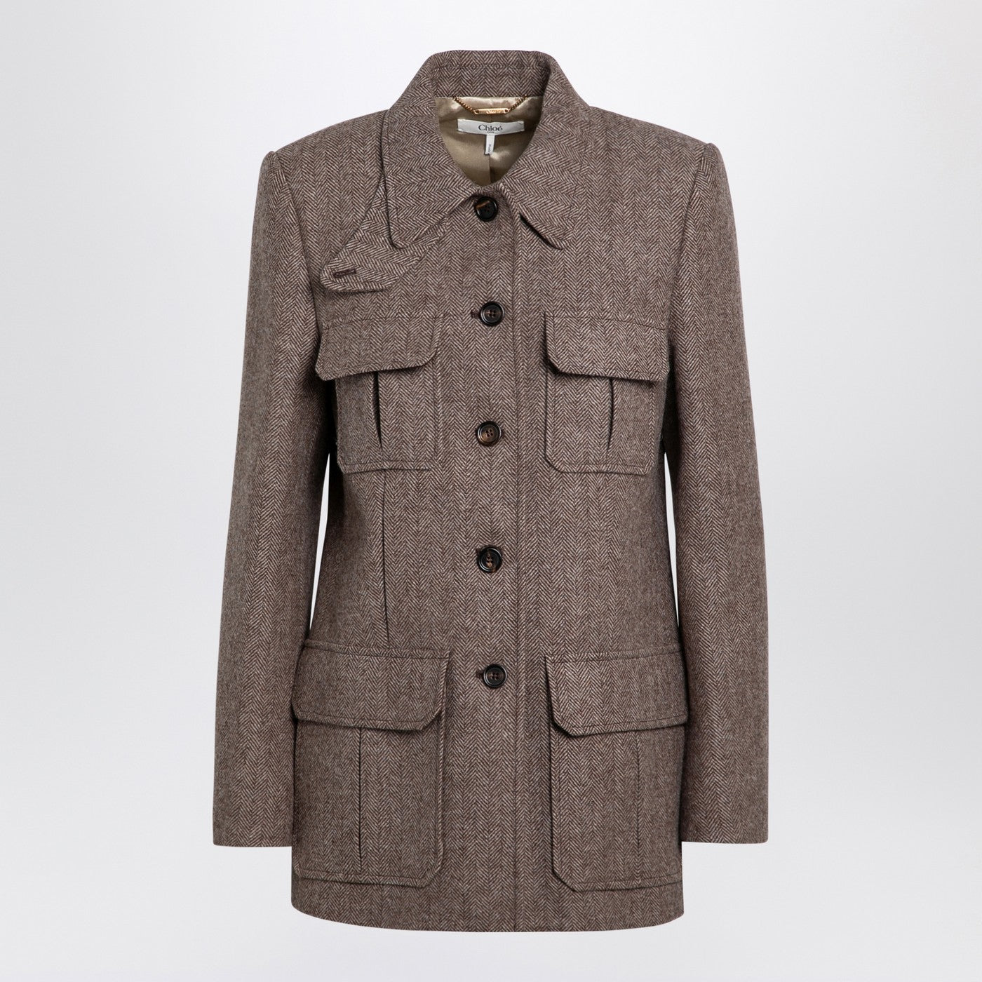 Brown herringbone weave virgin wool jacket from Chloé featuring long sleeves, a front button placket, four front patch flap pockets, a double back vent, leather inserts and a collar with a strap detail.