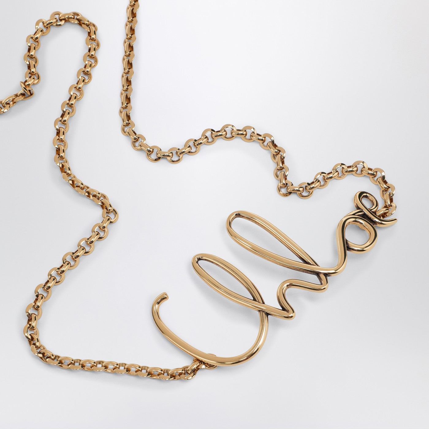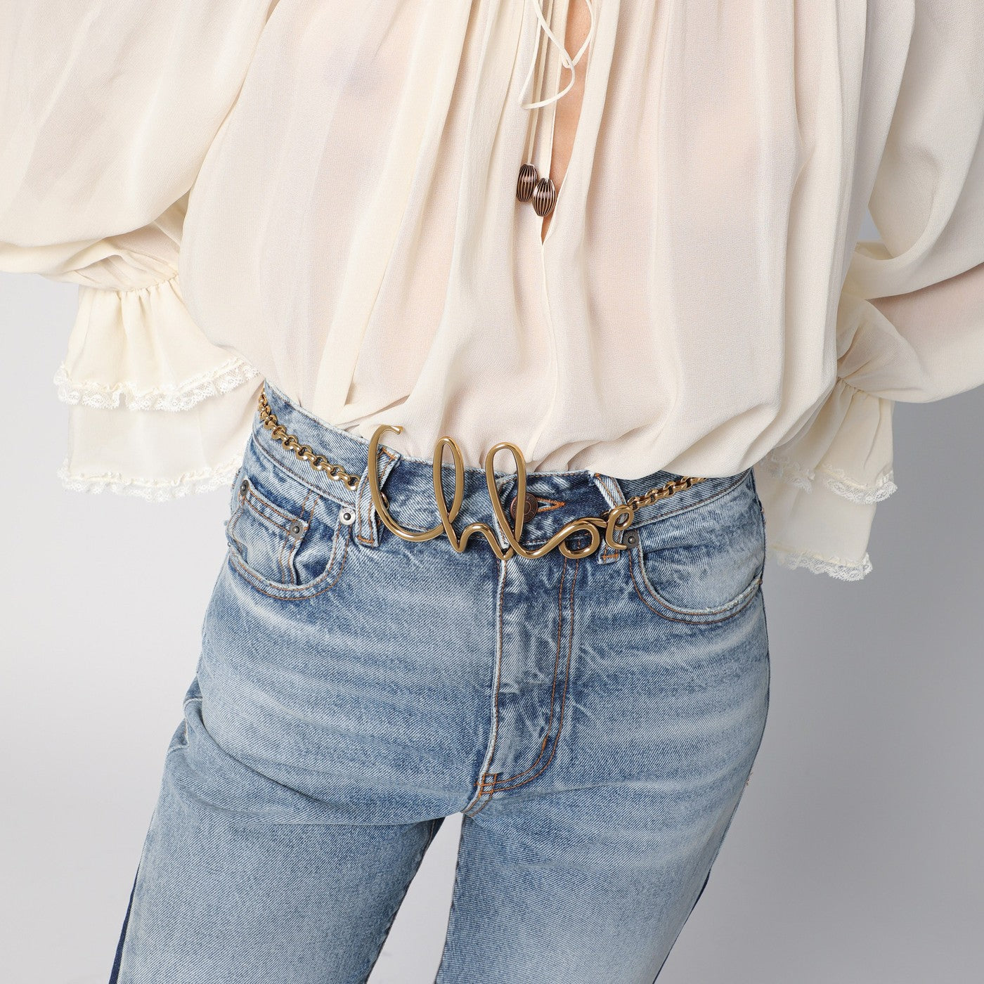 Chloé belt in metal with gold finish featuring a hook fastening with Chloé signature and a fine chain.
