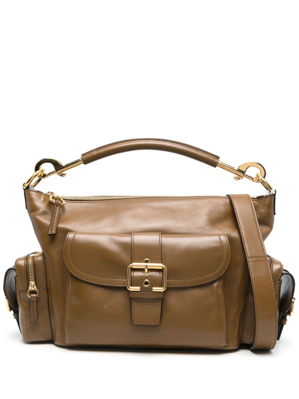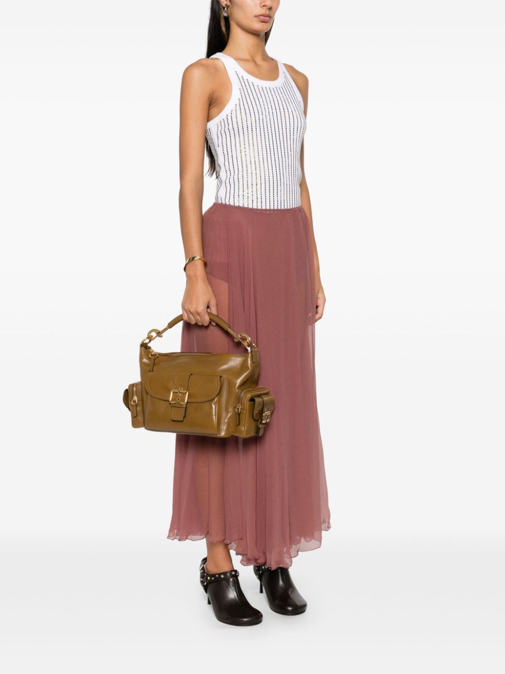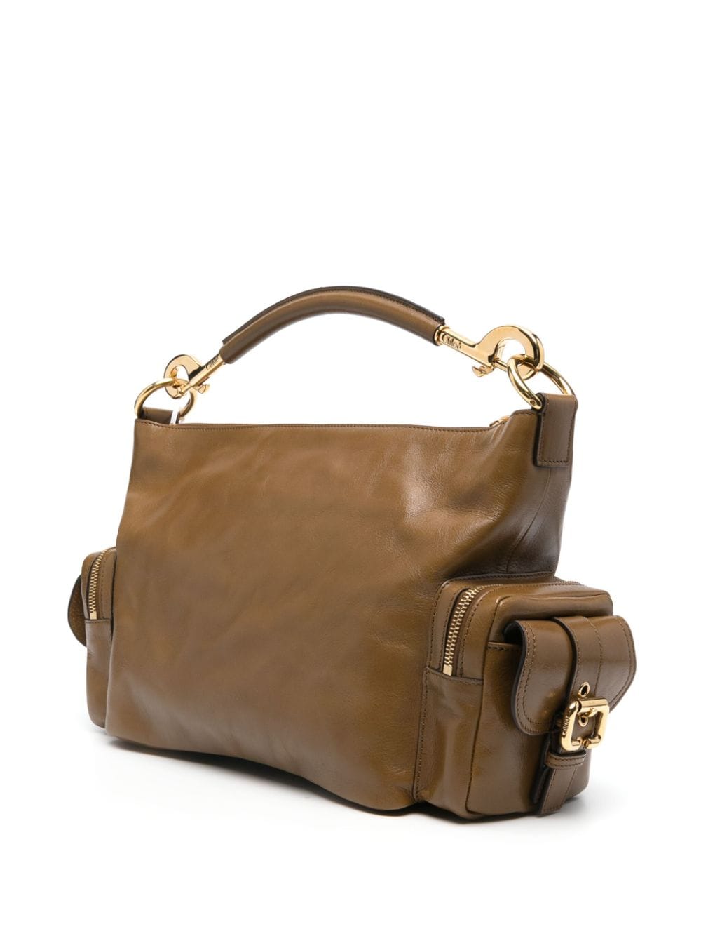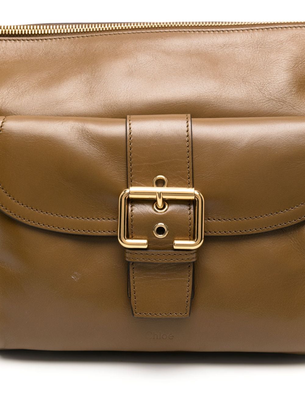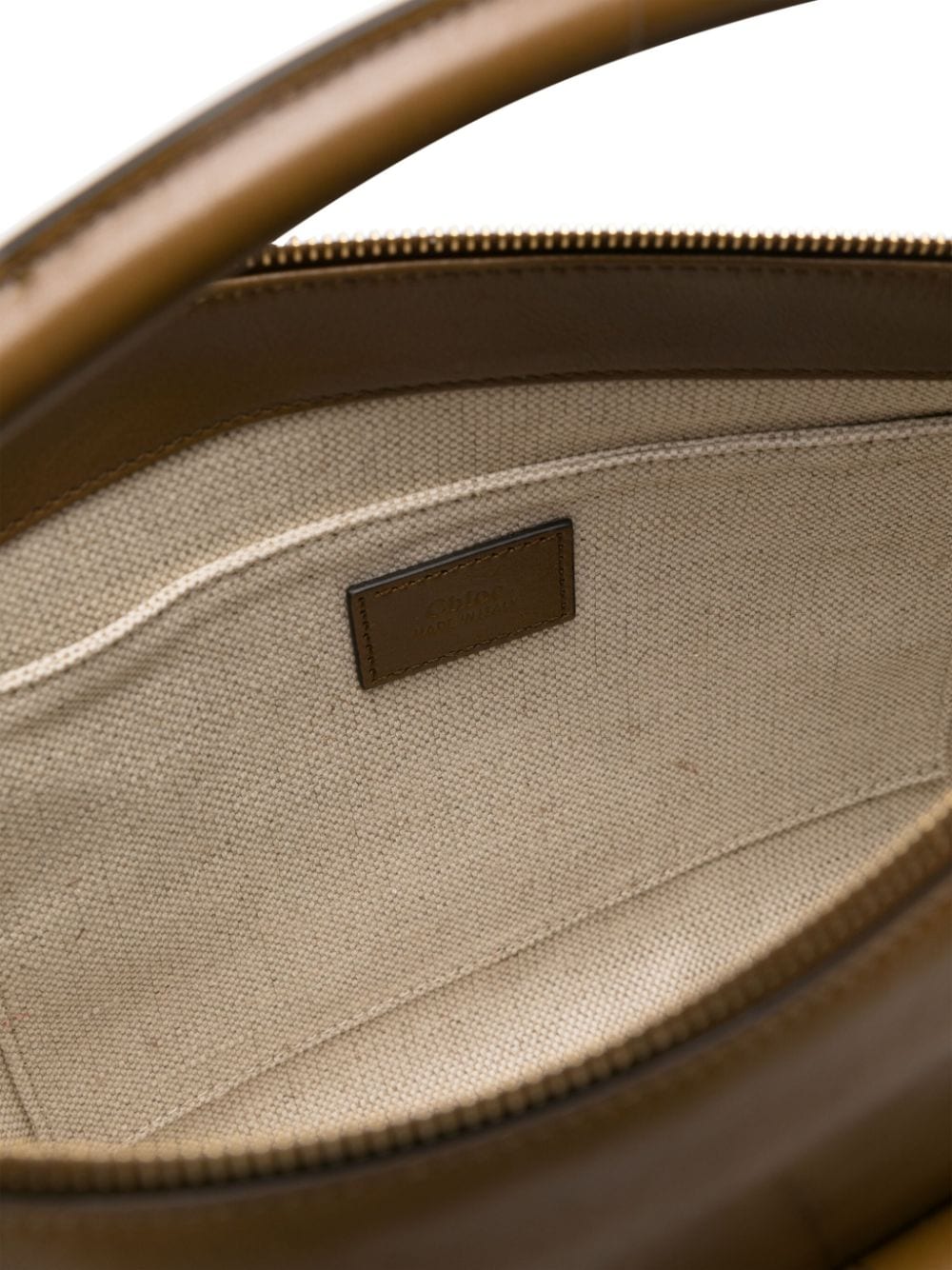 dark khaki calf leather smooth grain high-shine finish top zip fastening single detachable rolled top handle adjustable detachable shoulder strap front flap pocket side zip-fastening compartment main compartment internal slip pocket internal logo patch This piece comes complete with a protective dust bag.
