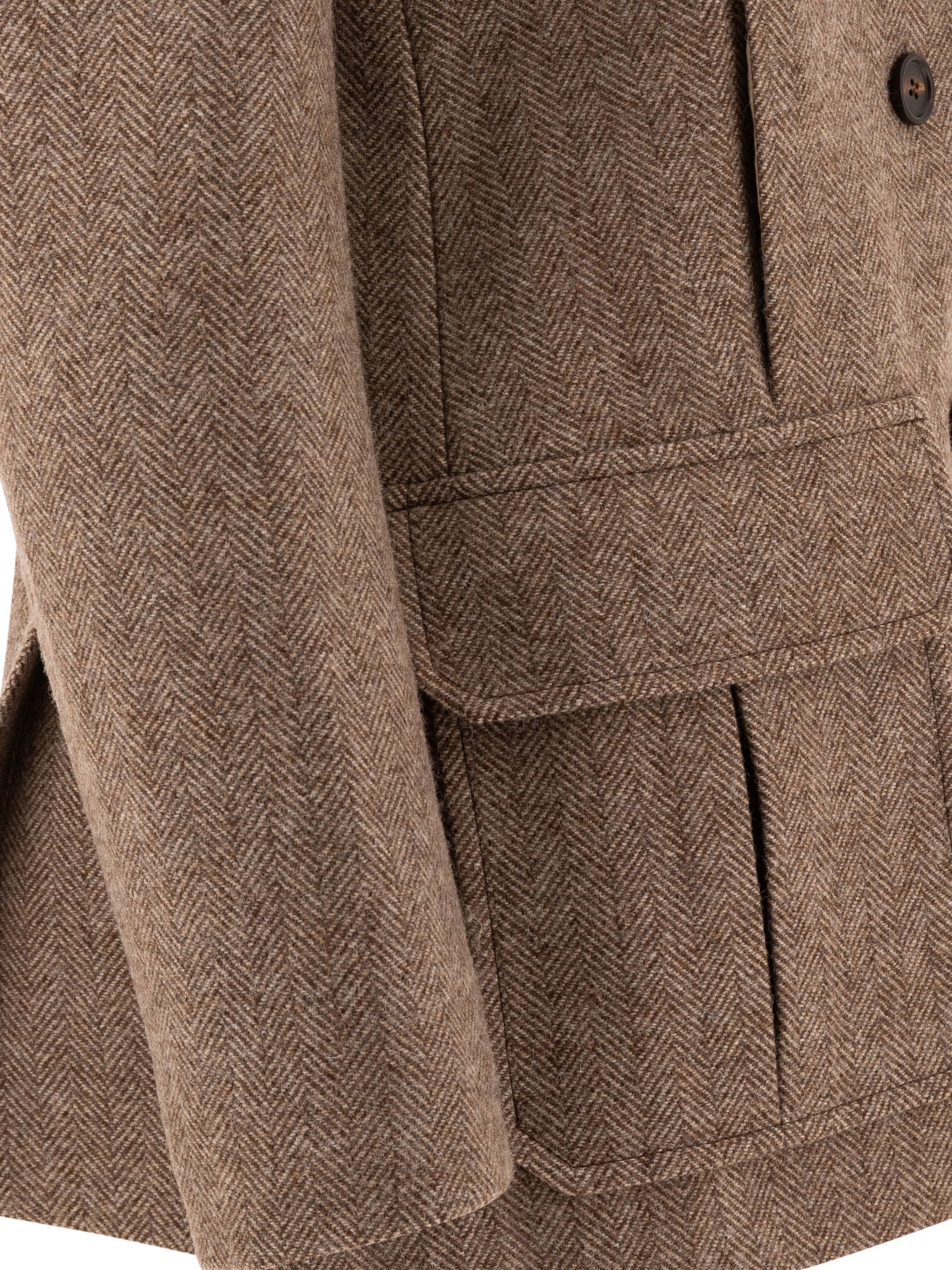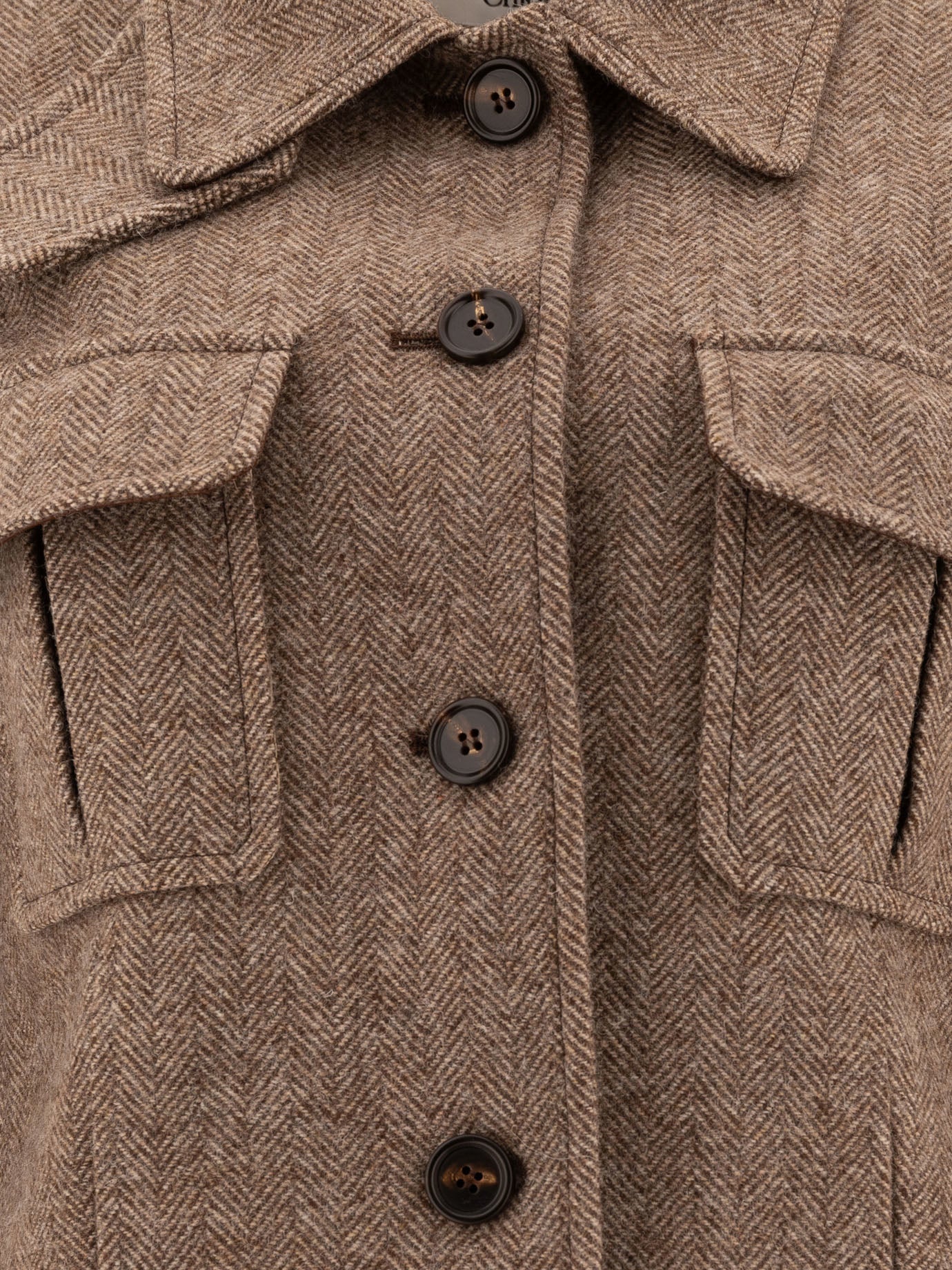 Chloé's long wool military-style jacket is the perfect choice for women seeking elegance and sustainability. This modern-cut garment with a herringbone pattern combines sophisticated details such as a leather strap and horn buttons, offering an exclusive and distinctive look.