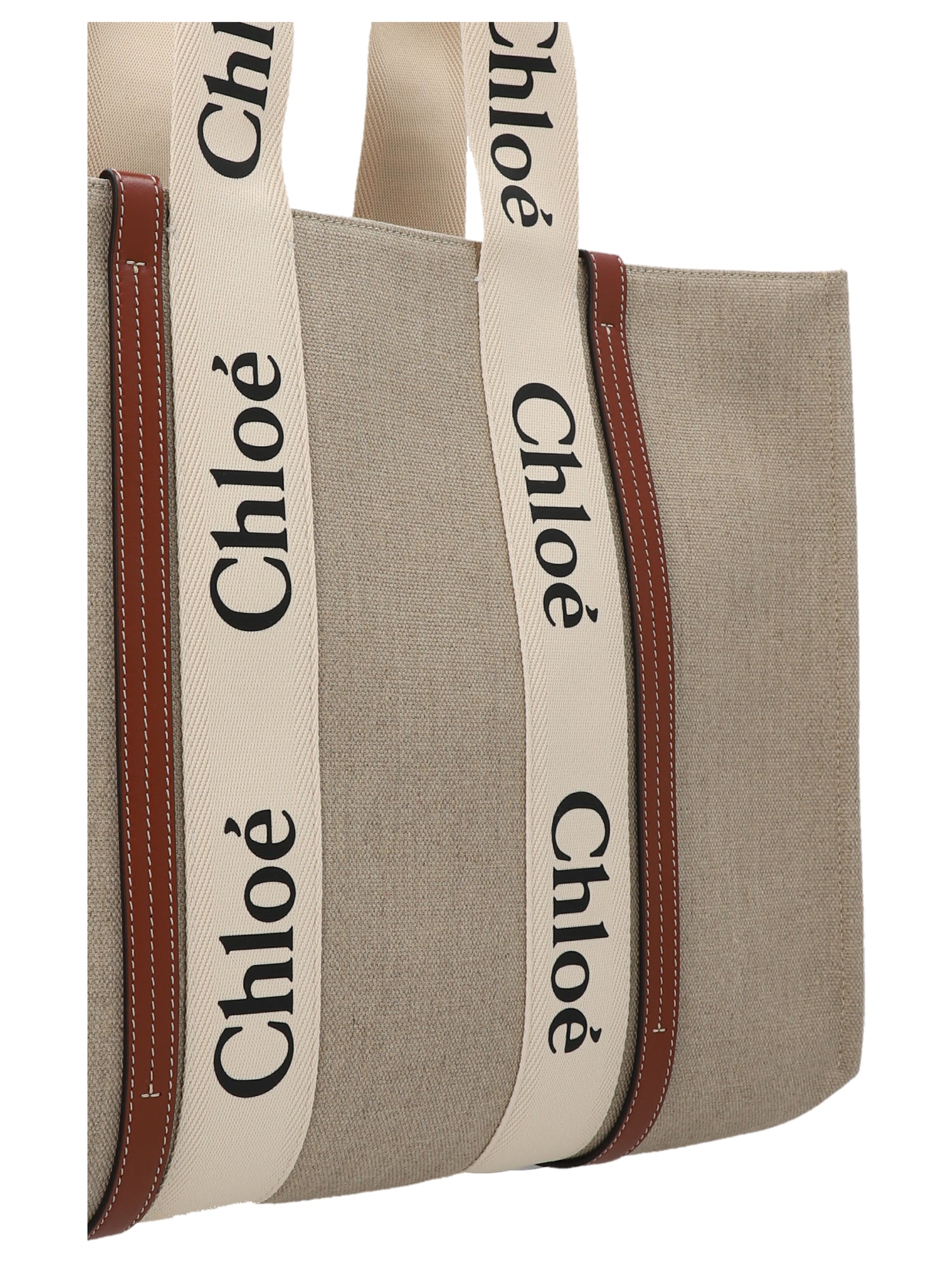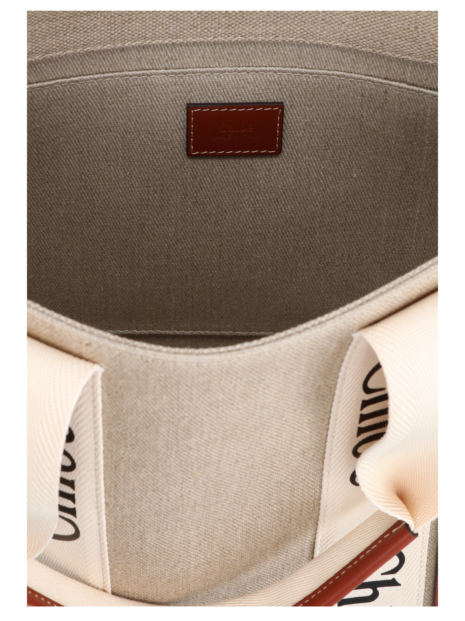 'Woody' large shopping bag in linen canvas featuring shiny calf leather details and logo grosgrain details. Featuring a handle.