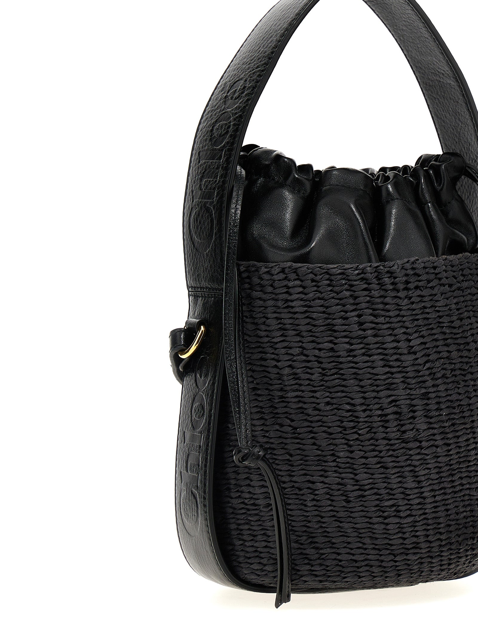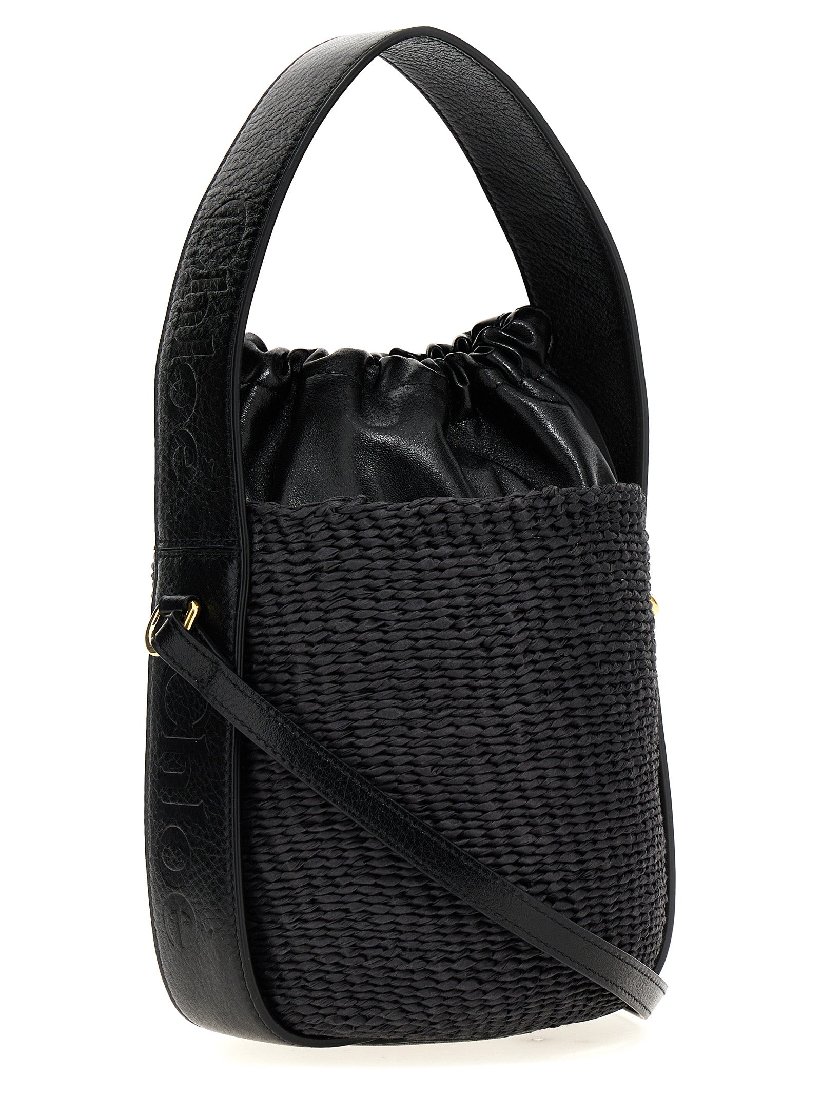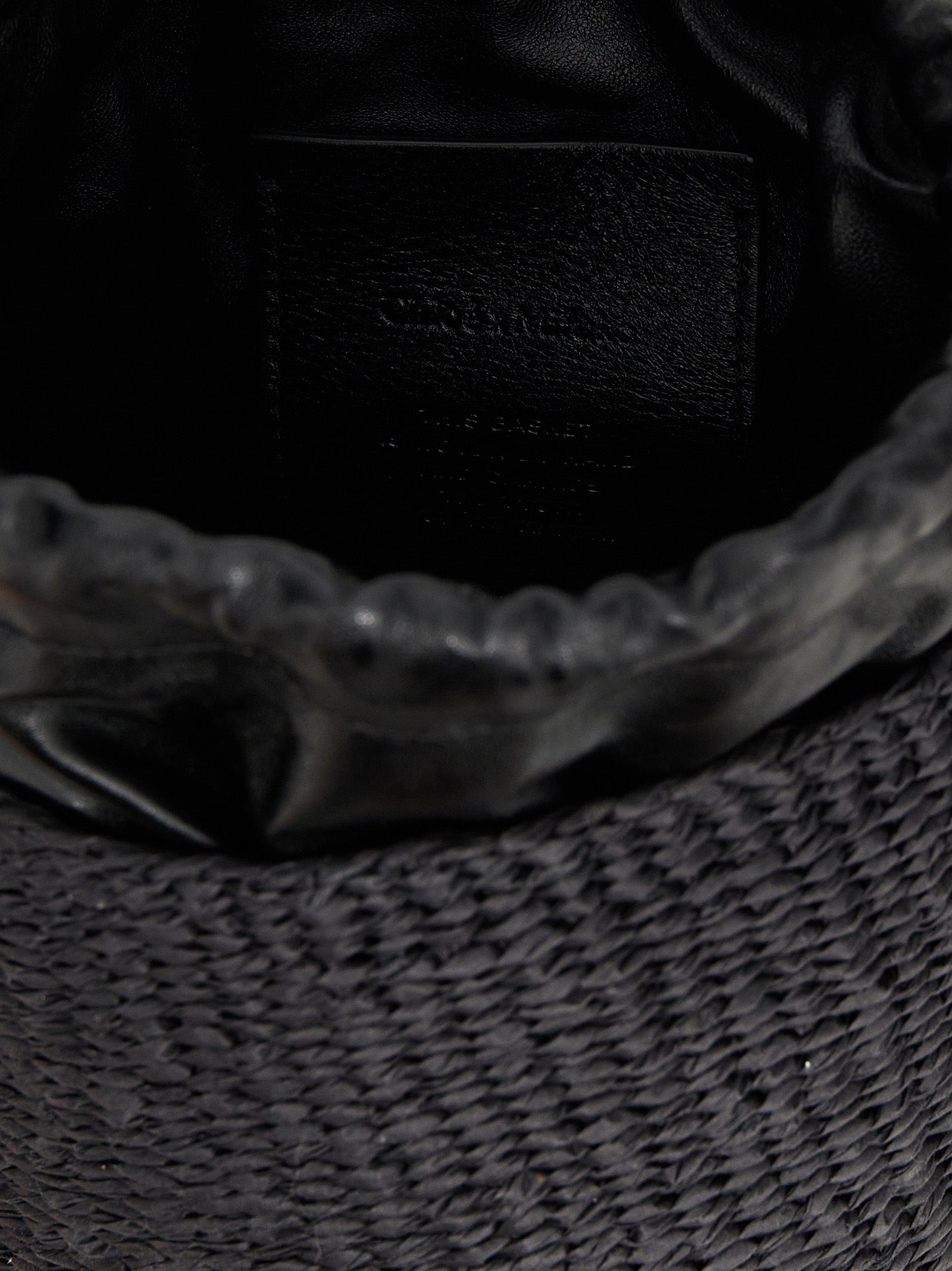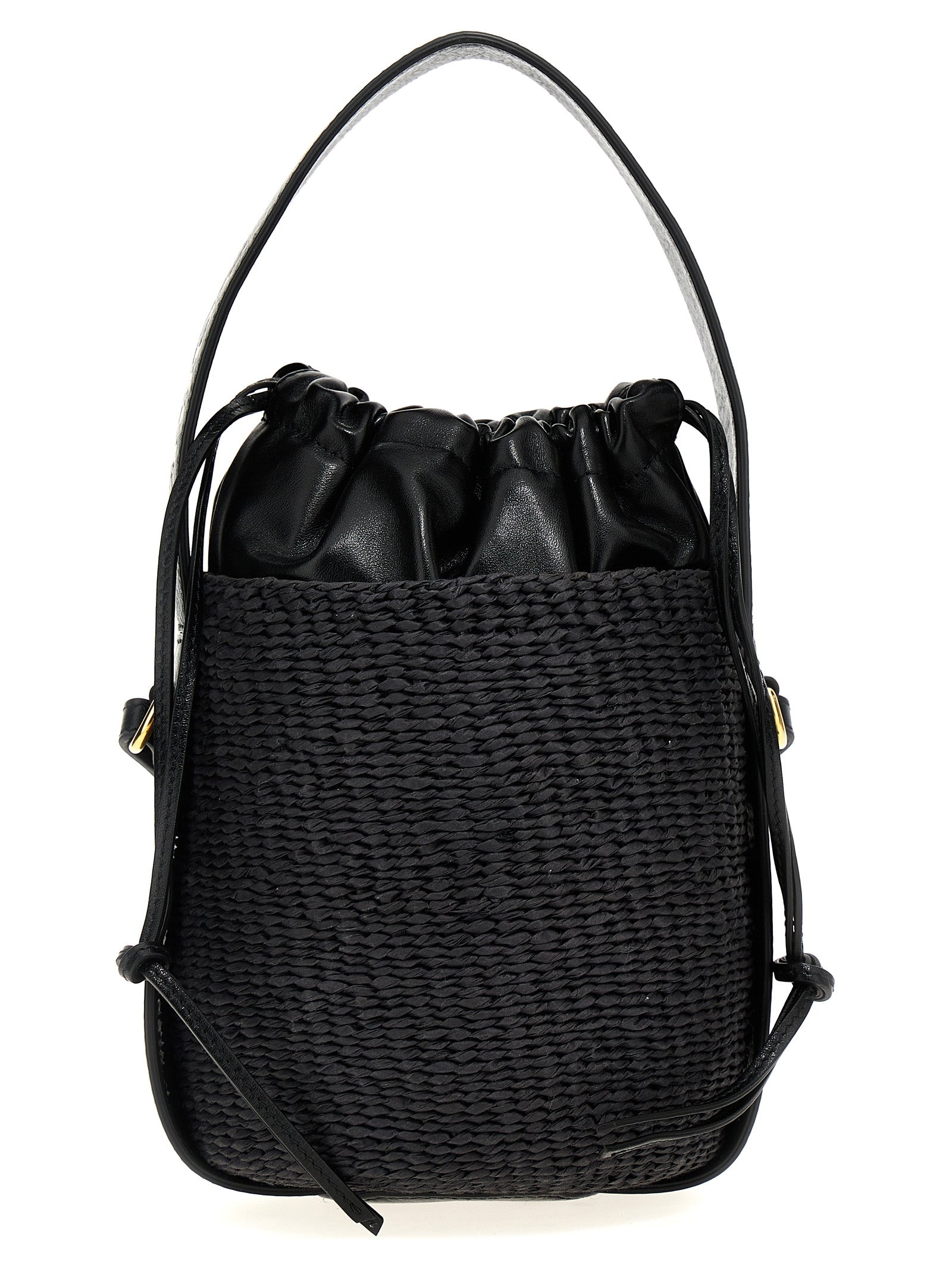 Small 'Woody' crossbody bag in woven raffia and leather, drawstring closure, fixed short handle, shoulder strap.