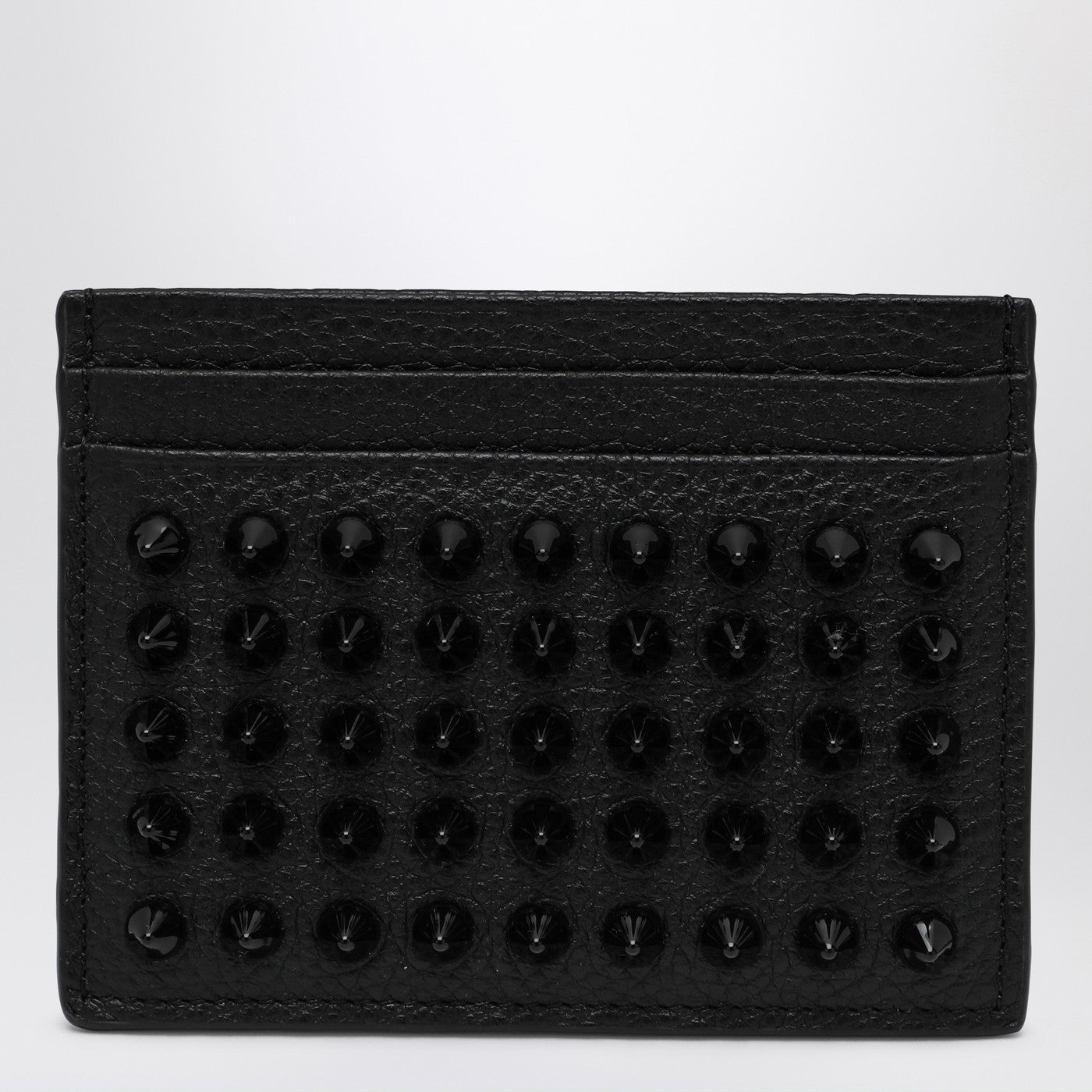 Black grained calfskin card case by Christian Louboutin, featuring tone-on-tone studs on the front, embossed lettering logo on the other, four card slots and a central pocket with red interior.