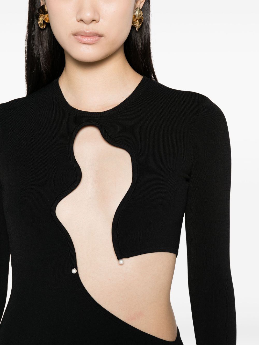 black stretch-design fine ribbed asymmetric design cut-out detailing faux-pearl embellishment crew neck long sleeves straight hem ankle-length