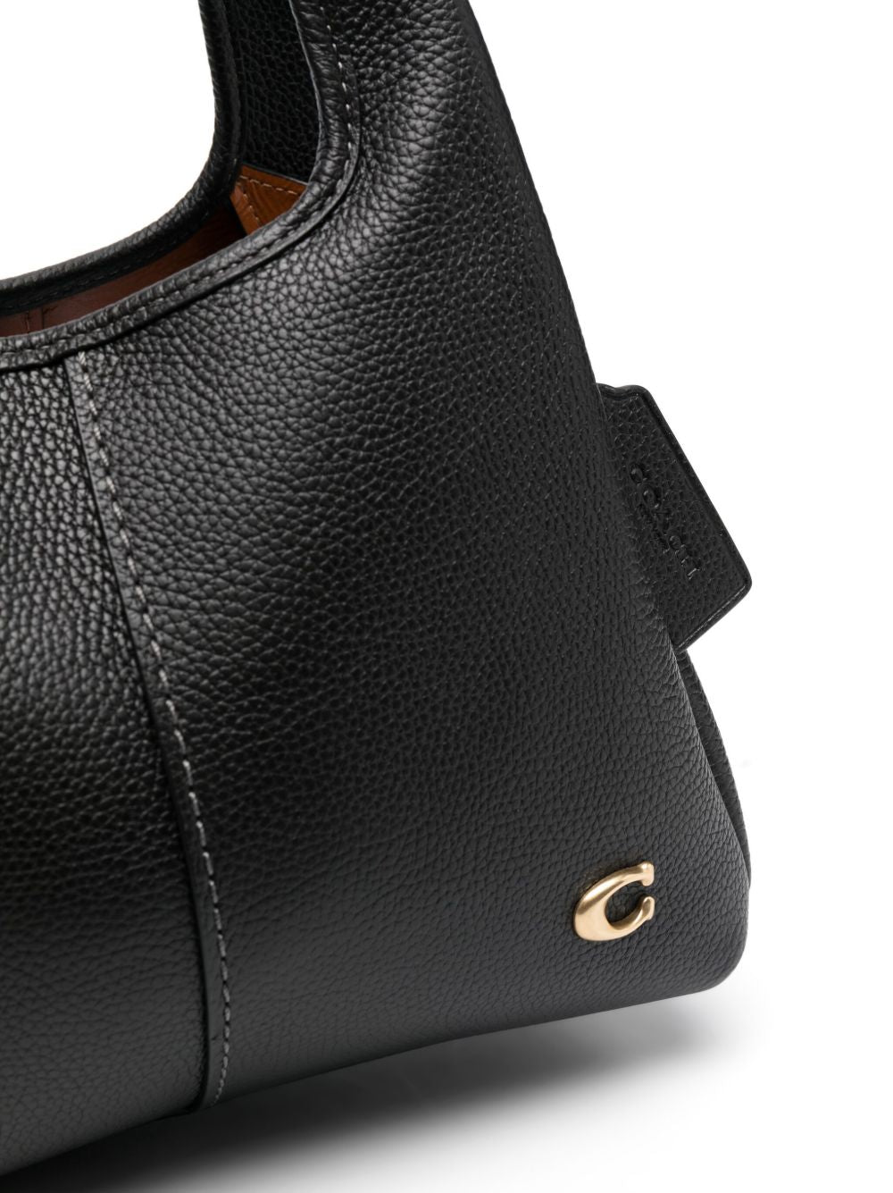 black calf leather pebbled texture gold-tone logo plaque gold-tone hardware circular top handles detachable shoulder strap partitioned compartment internal logo patch