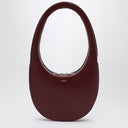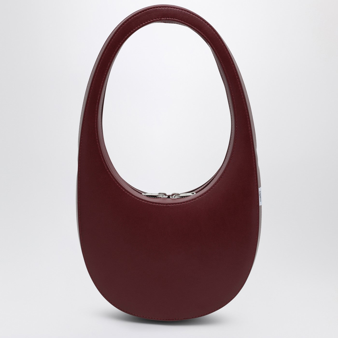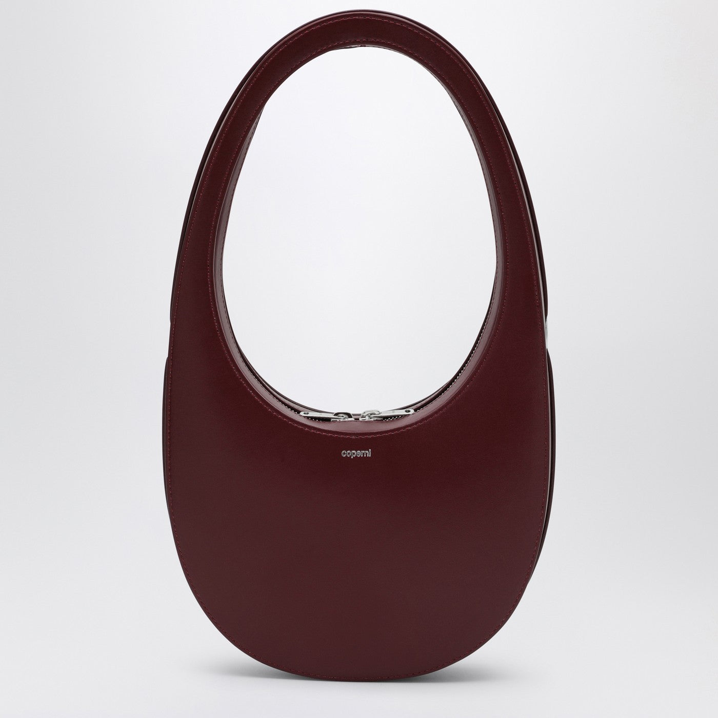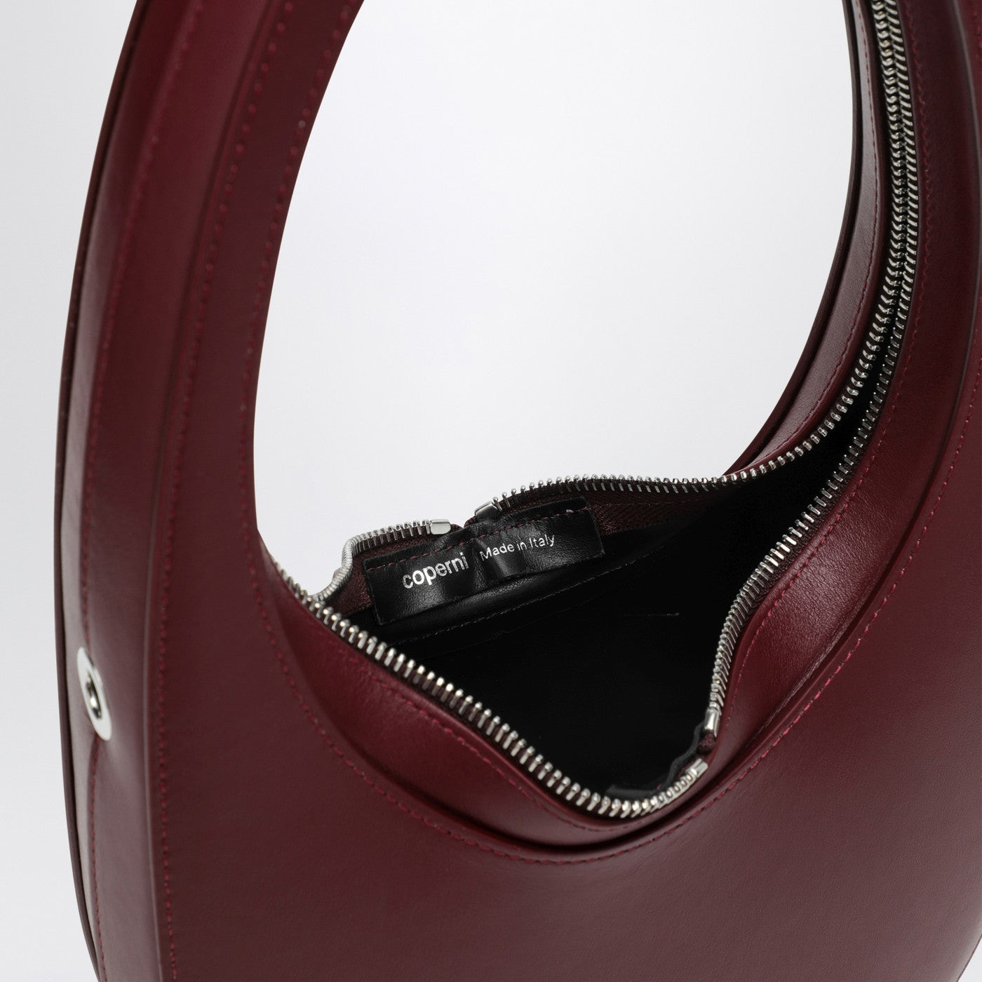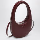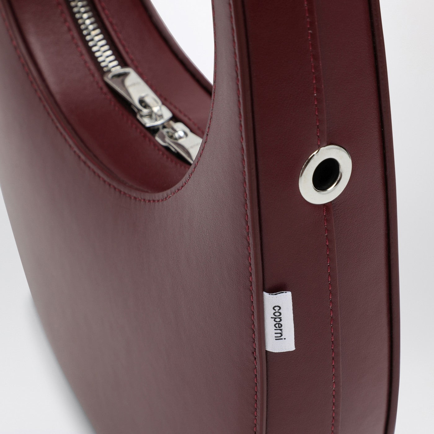 Burgundy leather bag from Coperni featuring oval design, single handle, double zip fastening, external logo plaque, contrasting front lettering, single compartment and silver-coloured metal hardware.