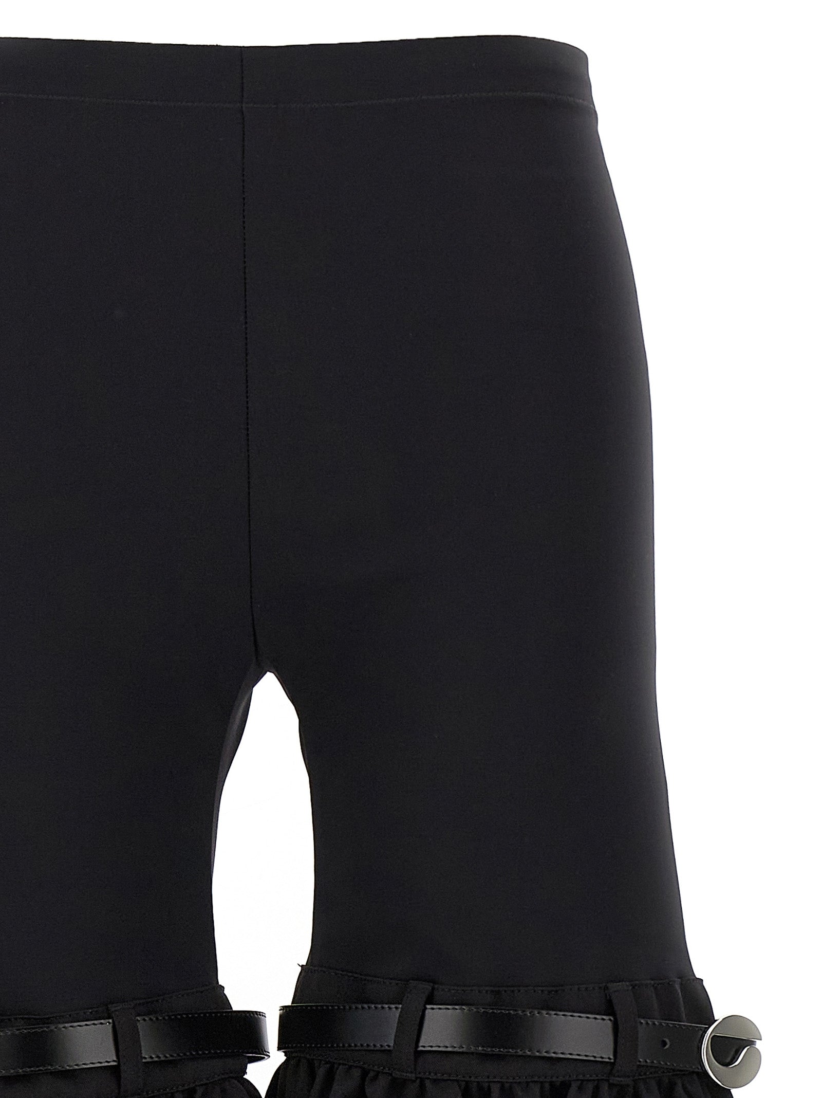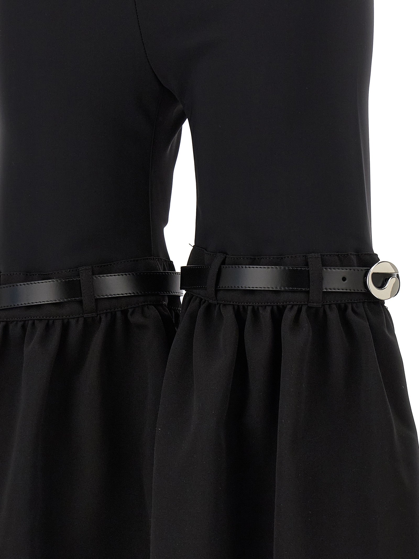 'Hybrid Tailored Flare' pants in stretch synthetic fabric at the top, elastic waistband, leather strap detail in the middle of the leg from which begins a heavier fabric with a wide and flared silhouette.