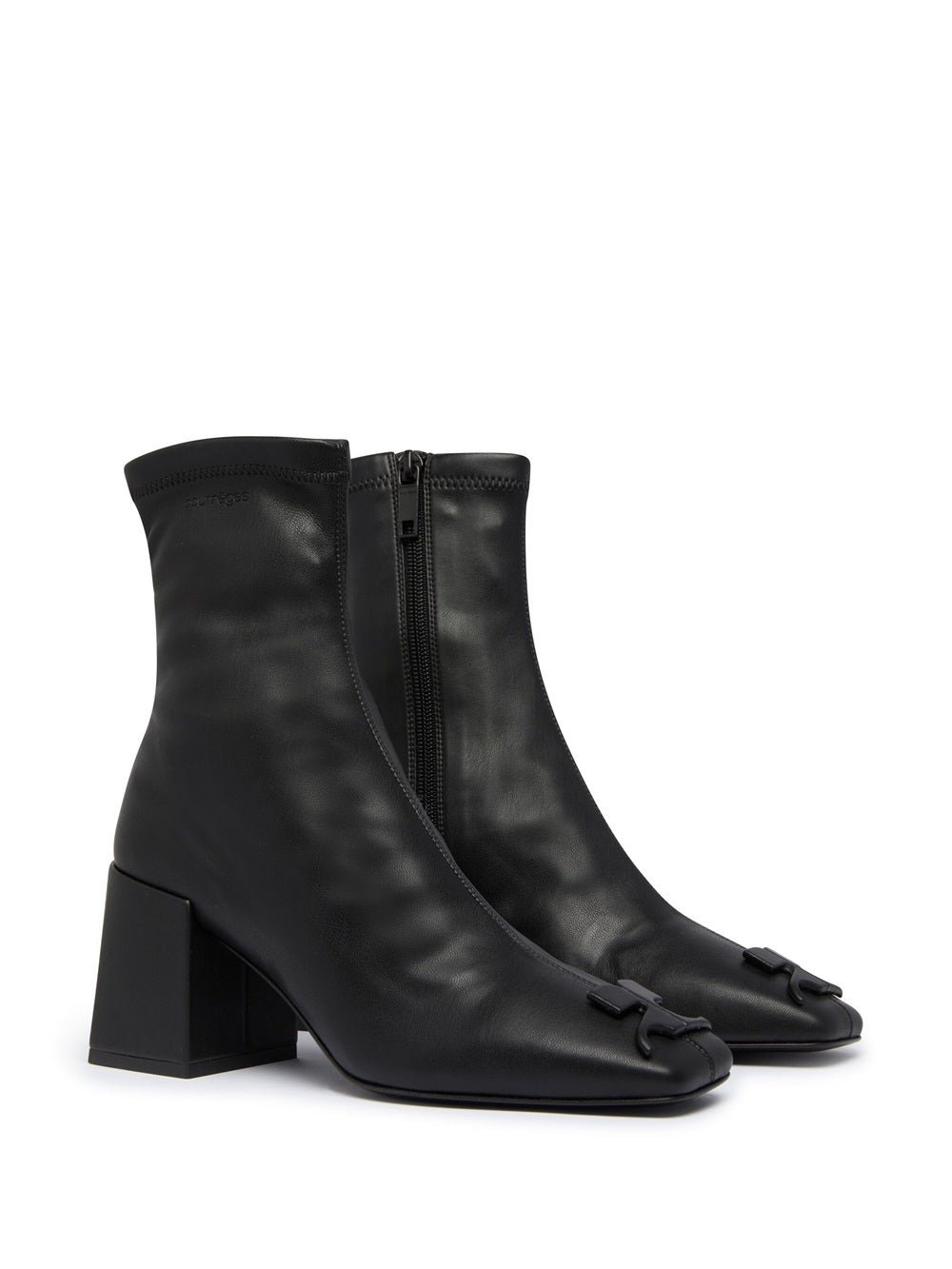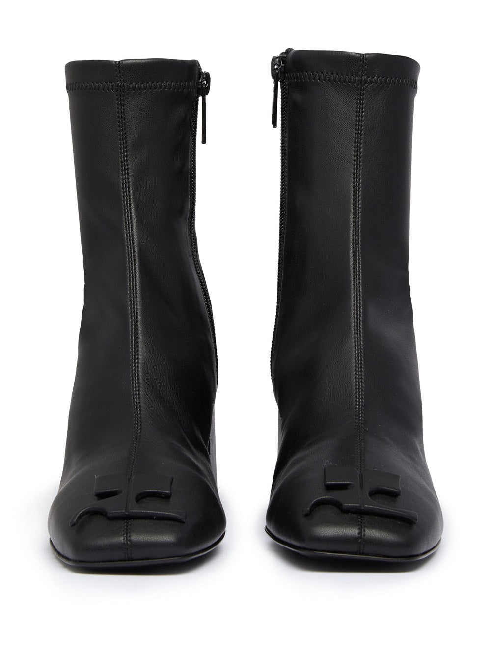 Deep black, cruelty-free leather, tone-on-tone stitching, front logo application, square toe, side zip closure, logo insole, block heel and ankle length.