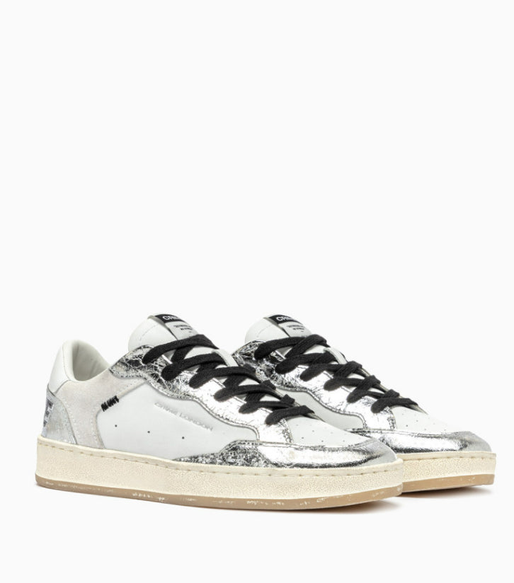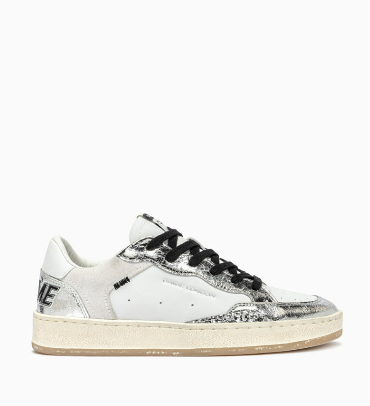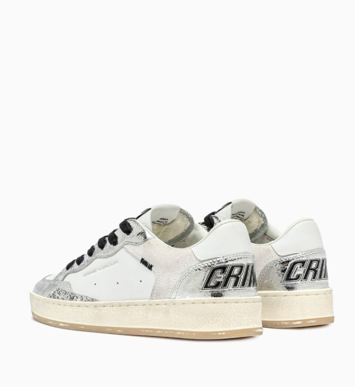 Sneaker made with high quality materials. White leather and suede upper with silver cracklé foil, silver glitter details. White leather back patch. Silver cracklé foil heel with CRIME logo. White leather tongue with fabric logo label. Double black and white lace.
