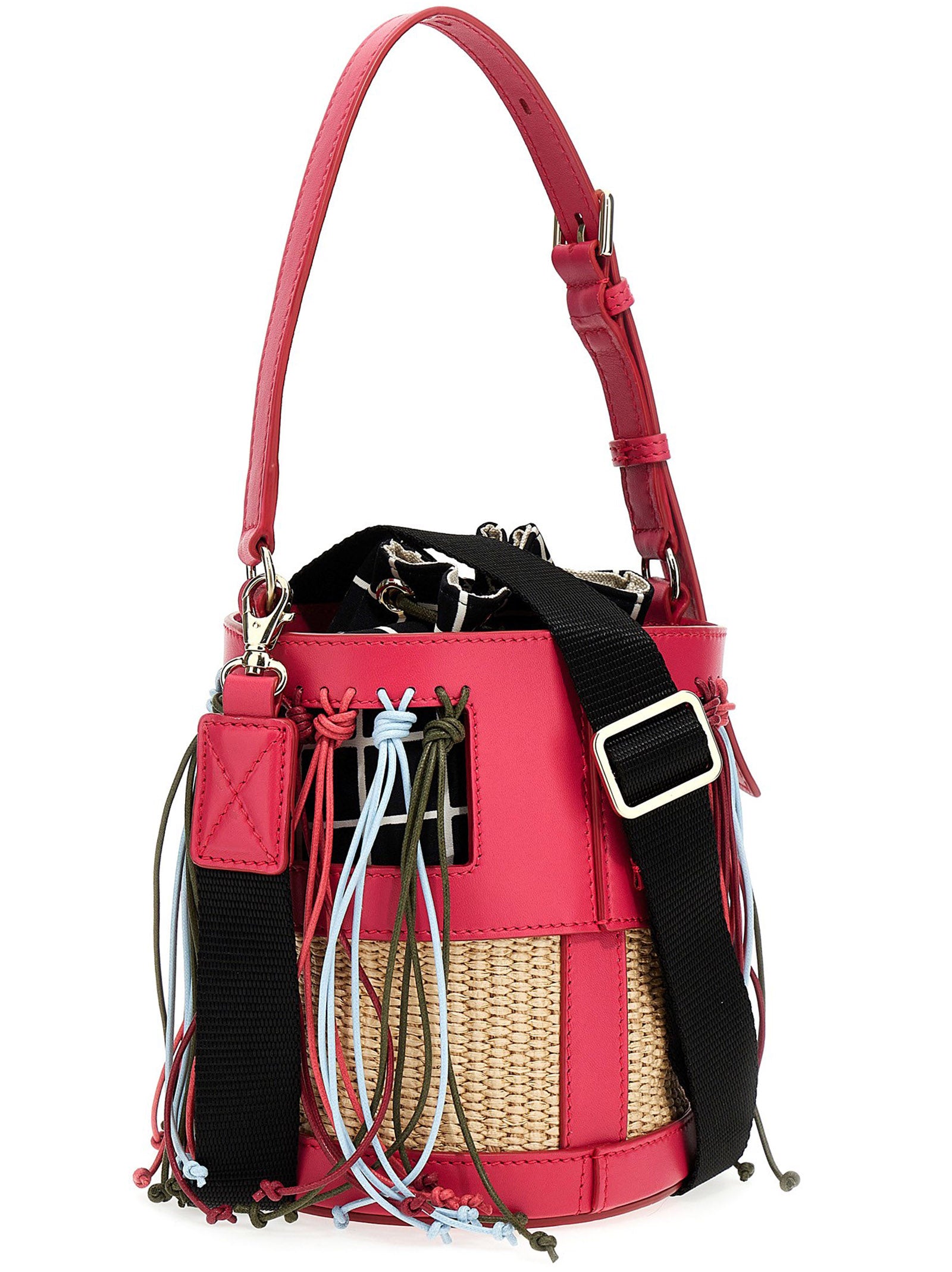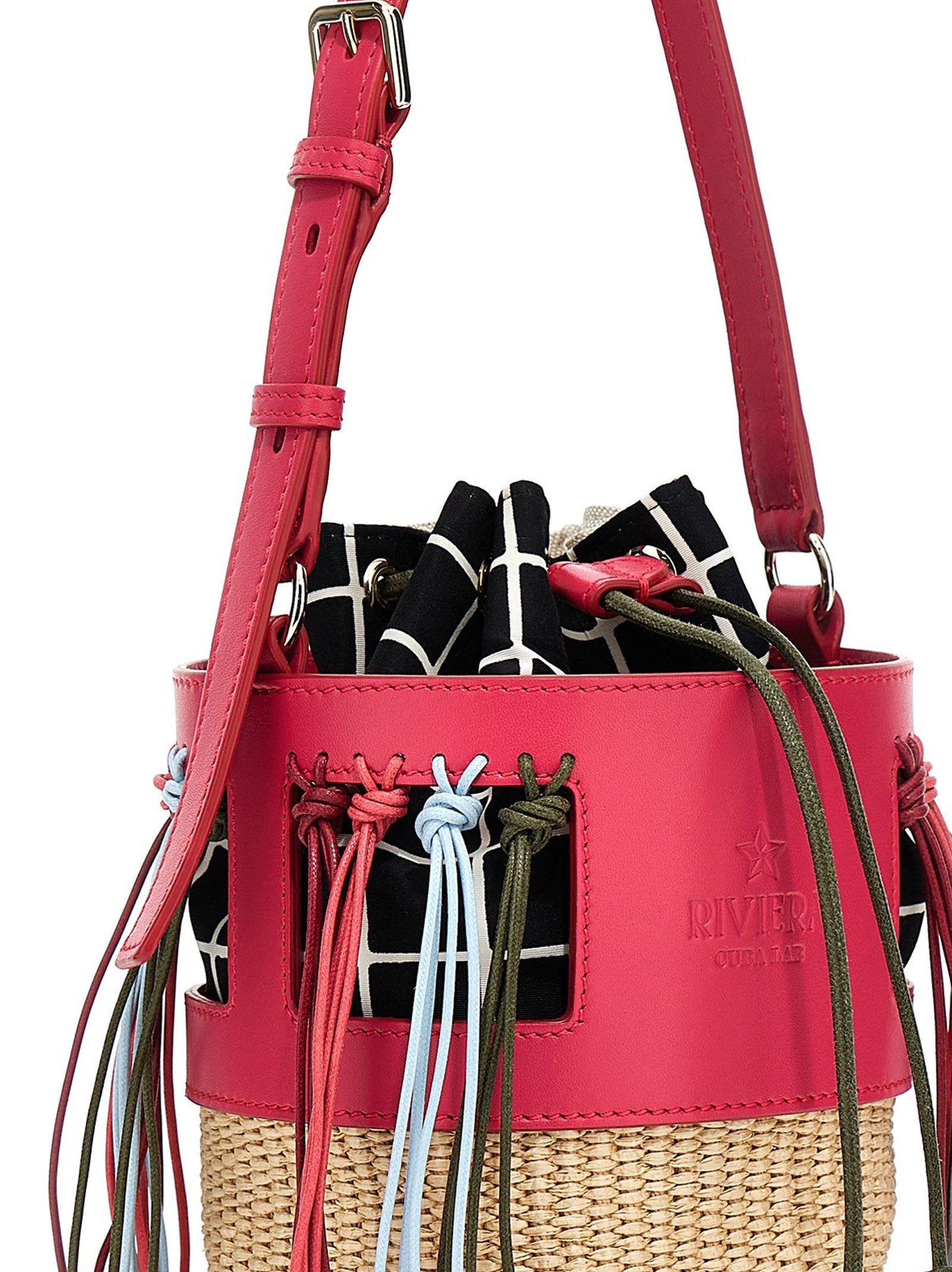 Cuba Lab x SanPa 'Riviera CubaLab' raffia and leather bucket bag with adjustable handle, drawstring closure, a regenerated fabric lining with animal print.