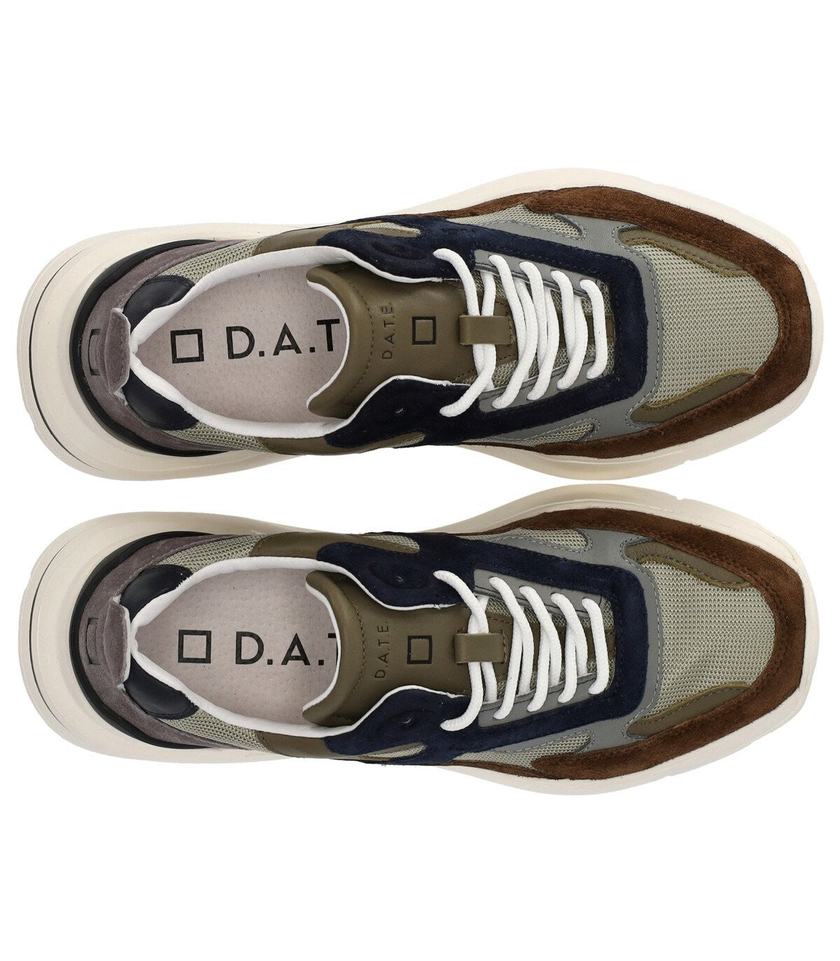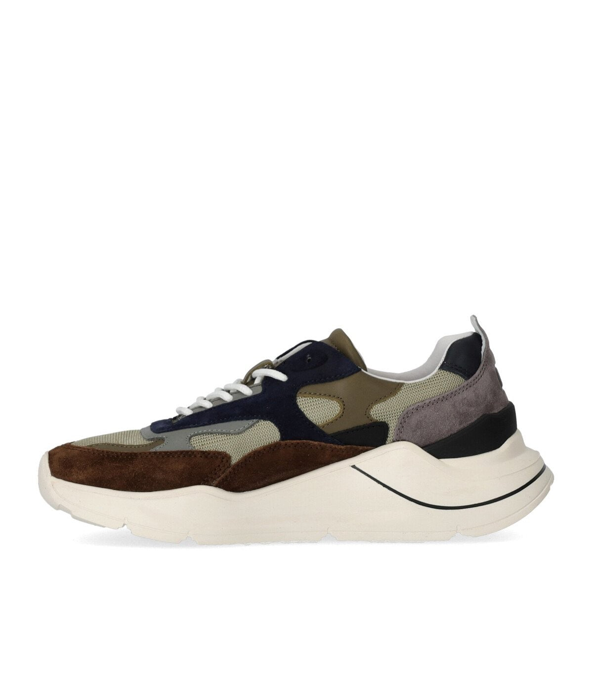 Fuga Dragon Army Sneaker by D.A.T.E. made of mesh, suède and leather in shades of green, grey, brown and blue. Logo on the heel and tongue, white cotton laces and leather and cotton terry lining. Rubber running sole, height 5 cm. This item has a small fit; we recommend buying one size larger than your usual.