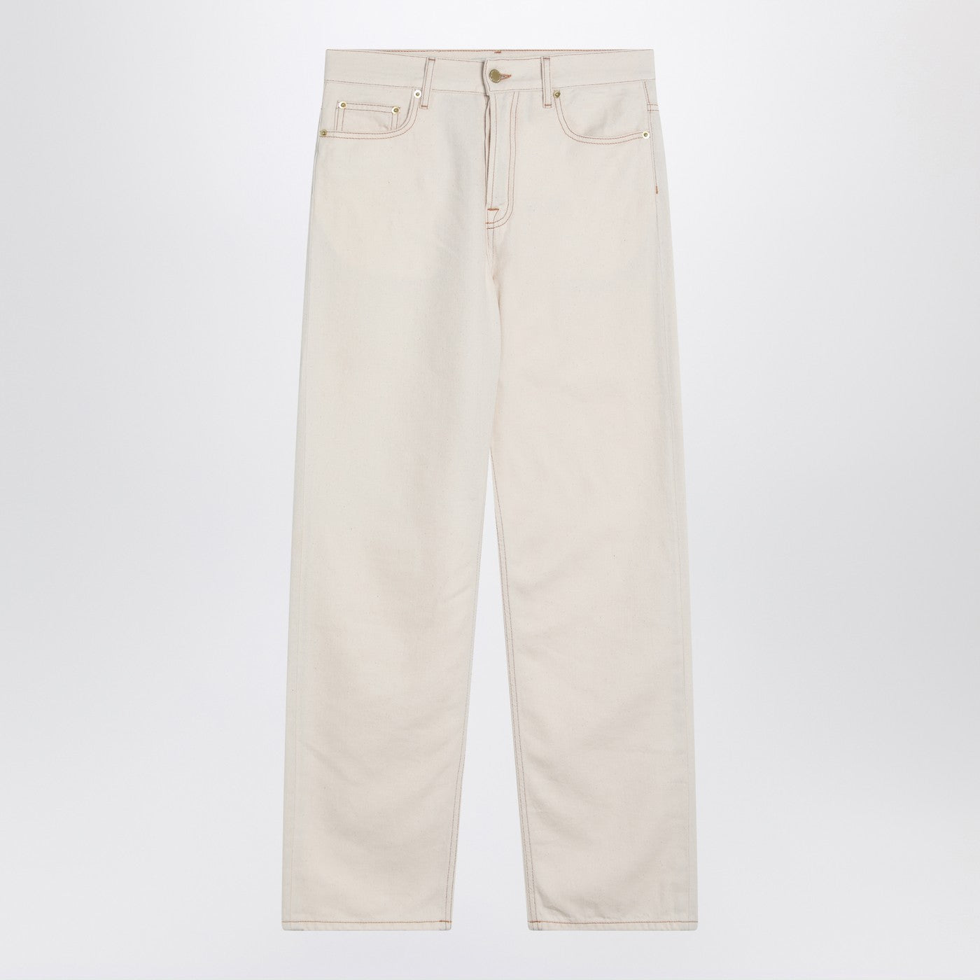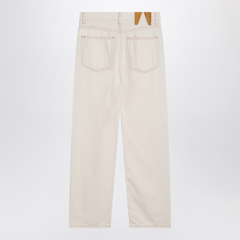 DARKPARK pants in ecru cotton blend, characterized by a front closure with zip and button, high waist with belt loops, five classic pockets, visible stitching, and a patch on the back.