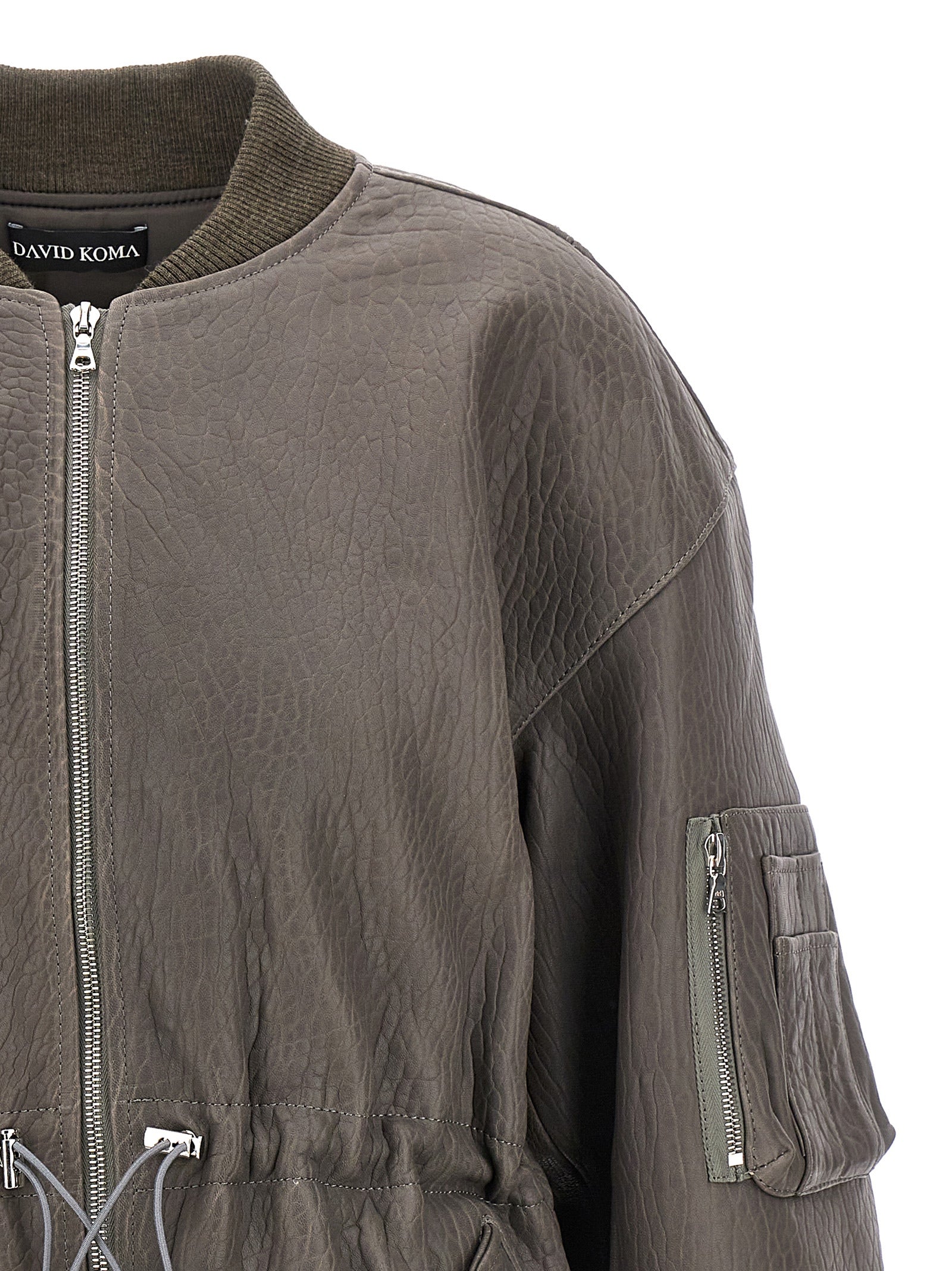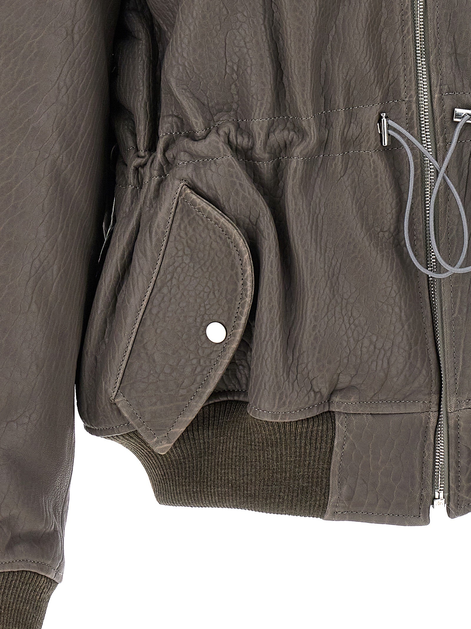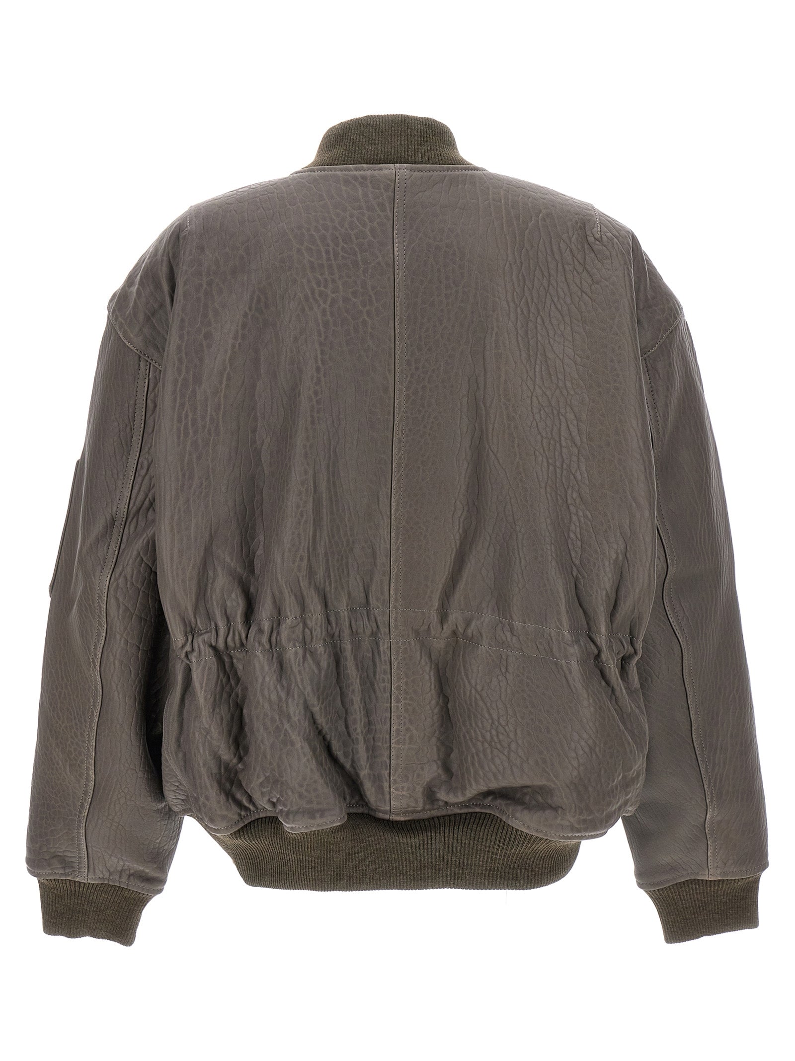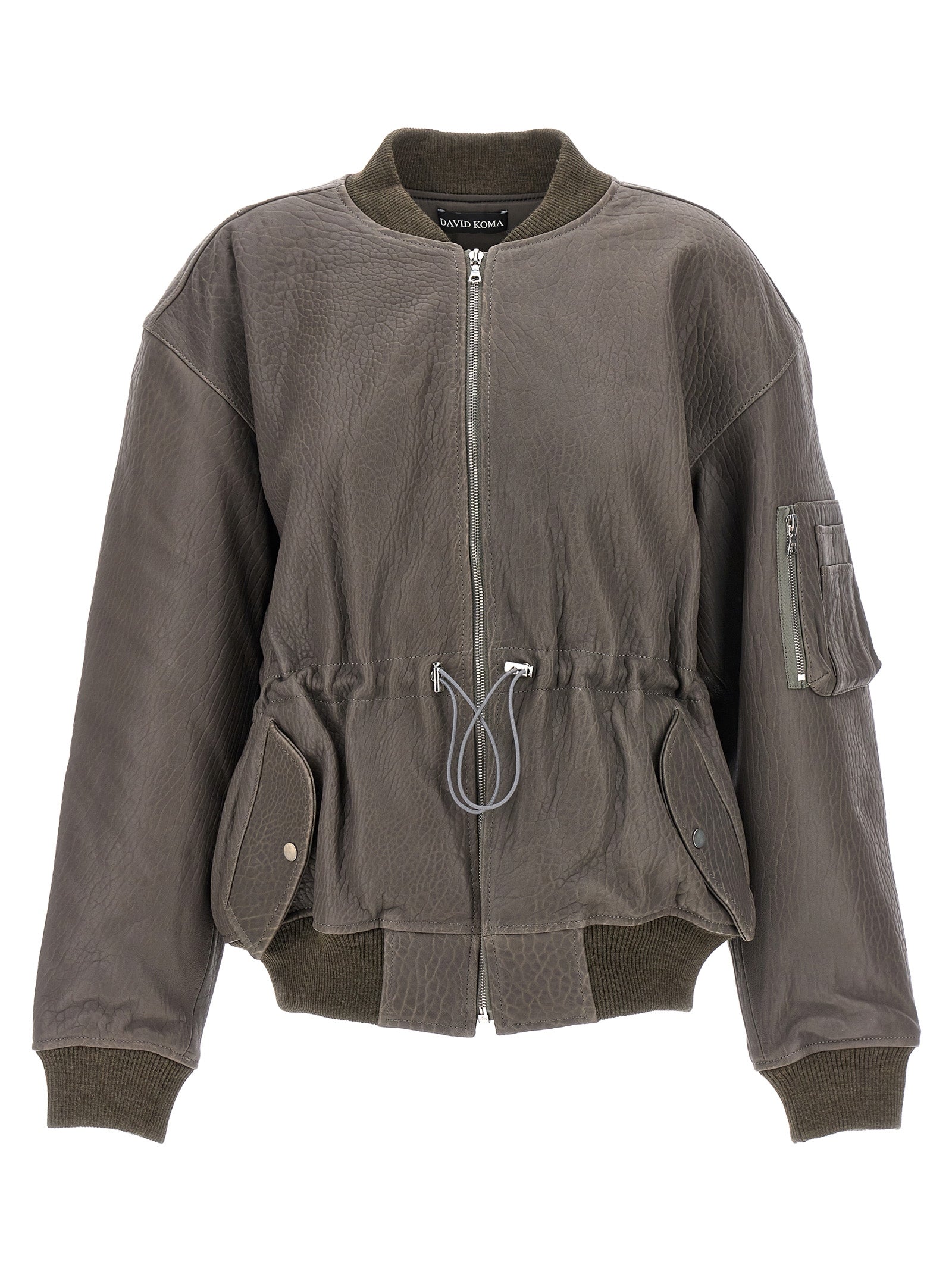 Oversize leather bomber jacket with adjustable drawstring at the waist, pockets, long sleeves with knitted cuffs.