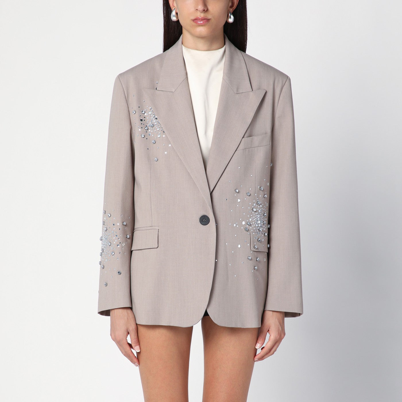 Beige viscose-wool blend single-breasted jacket from Des Phemmes featuring peaked lapels, long sleeves with buttoned cuffs, crystal detailing, a welt pocket on the chest, two flap pockets on the front and a front button placket.