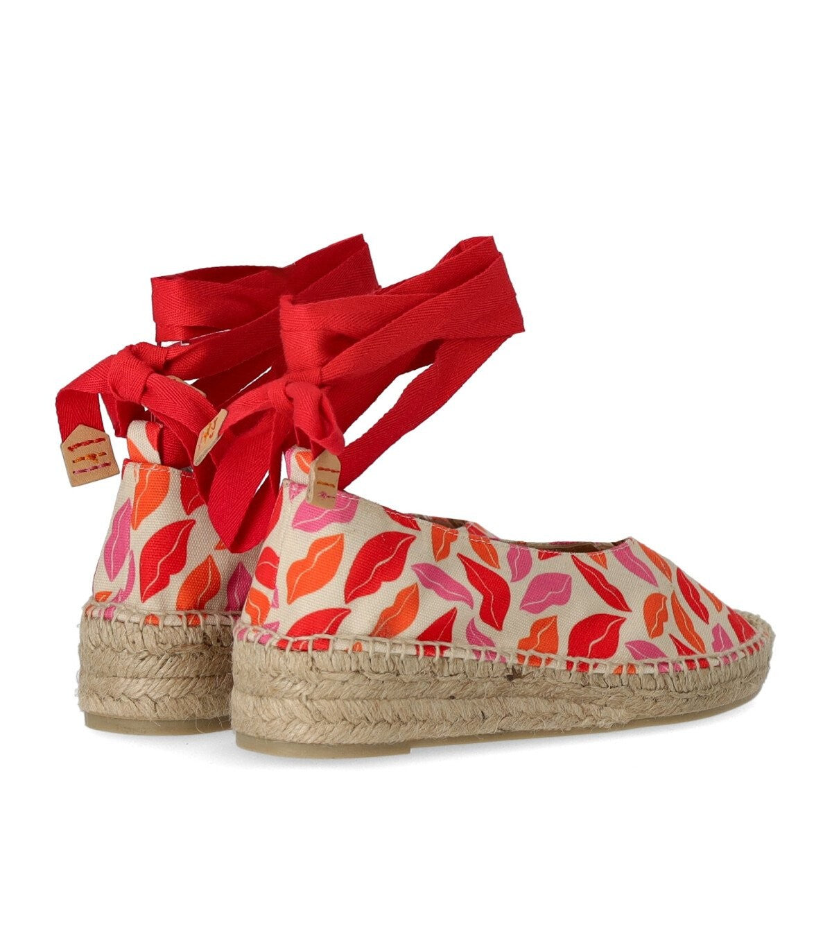 Gea espadrille by Castañer, in collaboration with Diane Von Furstenberg, made of canvas in shades of beige with multicolored pattern. Crochet effect detail on the toe, leather lining and laces to tie at the ankle. Rubber sole, height 4 cm. External composition: 100% polyester. Internal composition: 100% leather.